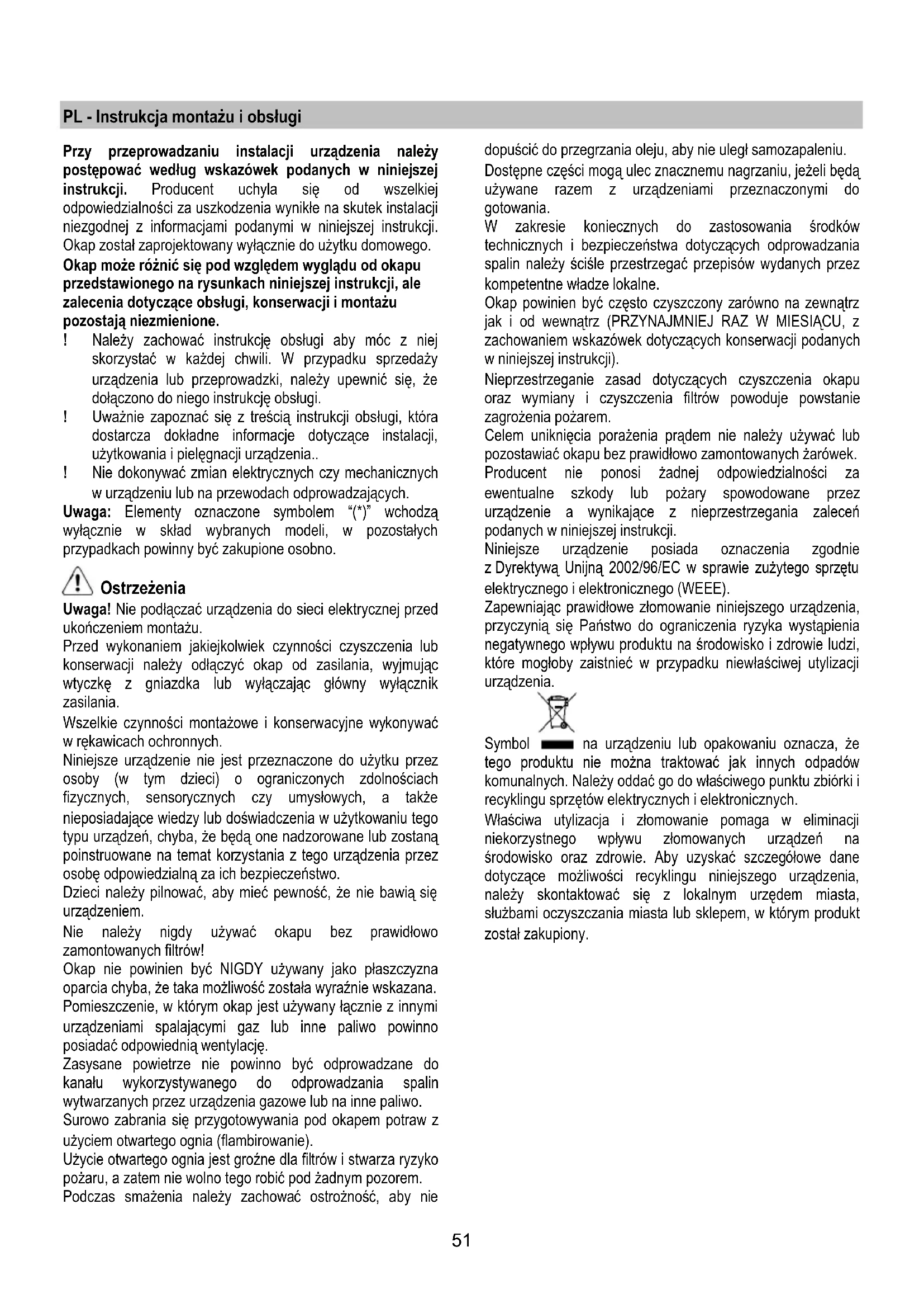 - Připojte lampičku k el.vedení a vsuňte lampičku zpět do otvoru digestoře. Jestliže osvětlení nefunguje, dříve než zavoláte servis si ověřte, zda jste správně nasadili žárovky do uložení.51 PL - Instrukcja montażu i obsługi Przy przeprowadzaniu instalacji urządzenia należy postępować według wskazówek podanych w niniejszej instrukcji. Producent uchyla się od wszelkiej odpowiedzialności za uszkodzenia wynikłe na skutek instalacji niezgodnej z informacjami podanymi w niniejszej instrukcji. Okap został zaprojektowany wyłącznie do użytku domowego. Okap może różnić się pod względem wyglądu od okapu przedstawionego na rysunkach niniejszej instrukcji, ale zalecenia dotyczące obsługi, konserwacji i montażu pozostają niezmienione. ! Należy zachować instrukcję obsługi aby móc z niej skorzystać w każdej chwili. W przypadku sprzedaży urządzenia lub przeprowadzki, należy upewnić się, że dołączono do niego instrukcję obsługi. ! Uważnie zapoznać się z treścią instrukcji obs ługi, która dostarcza dokładne informacje dotyczące instalacji, użytkowania i pielęgnacji urządzenia.. ! Nie dokonywać zmian elektrycznych czy mechanicznych w urządzeniu lub na przewodach odprowadzających. Uwaga: Elementy oznaczone symbolem “(*)” wchodzą wyłącznie w skład wybranych modeli, w pozostałych przypadkach powinny być zakupione osobno. Ostrzeżenia Uwaga! Nie podłączać urządzenia do sieci elektrycznej przed ukończeniem montażu. Przed wykonaniem jakiejkolwiek czynności czyszczenia lub konserwacji należy odłączyć okap od zasilania, wyjmując wtyczkę z gniazdka lub wyłączając główny wyłącznik zasilania. Wszelkie czynności montażowe i konserwacyjne wykonywać w rękawicach ochronnych. Niniejsze urządzenie nie jest przeznaczone do użytku przez osoby (w tym dzieci) o ograniczonych zdolnościach fizycznych, sensorycznych czy umysłowych, a także nieposiadające wiedzy lub doświadczenia w użytkowaniu tego typu urządzeń, chyba, że będą one nadzorowane lub zostaną poinstruowane na temat korzystania z tego urządzenia przez osobę odpowiedzialną za ich bezpieczeństwo. Dzieci należy pilnować, aby mieć pewność, że nie bawią się urządzeniem. Nie należy nigdy używać okapu bez prawidłowo zamontowanych filtrów! Okap nie powinien być NIGDY używany jako płaszczyzna oparcia chyba, że taka możliwość została wyraźnie wskazana. Pomieszczenie, w którym okap jest używany łącznie z innymi urządzeniami spalającymi gaz lub inne paliwo powinno posiadać odpowiednią wentylację. Zasysane powietrze nie powinno być odprowadzane do kanału wykorzystywanego do odprowadzania spalin wytwarzanych przez urządzenia gazowe lub na inne paliwo. Surowo zabrania się przygotowywania pod okapem potraw z użyciem otwartego ognia (flambirowanie). Użycie otwartego ognia jest groźne dla filtrów i stwarza ryzyko pożaru, a zatem nie wolno tego robić pod żadnym pozorem. Podczas smażenia należy zachować ostrożność, aby nie dopuścić do przegrzania oleju, aby nie uległ samozapaleniu. Dostępne części mog ą ulec znacznemu nagrzaniu, jeżeli będą używane razem z urządzeniami przeznaczonymi do gotowania. W zakresie koniecznych do zastosowania środków technicznych i bezpieczeństwa dotyczących odprowadzania spalin należy ściśle przestrzegać przepisów wydanych przez kompetentne władze lokalne. Okap powinien być często czyszczony zarówno na zewnątrz jak i od wewnątrz (PRZYNAJMNIEJ RAZ W MIESIĄCU, z zachowaniem wskazówek dotyczących konserwacji podanych w niniejszej instrukcji). Nieprzestrzeganie zasad dotyczących czyszczenia okapu oraz wymiany i czyszczenia filtrów powoduje powstanie zagrożenia pożarem. Celem uniknięcia porażenia prądem nie należy używać lub pozostawiać okapu bez prawidłowo zamontowanych żarówek. Producent nie ponosi żadnej odpowiedzialności za ewentualne szkody lub pożary spowodowane przez urządzenie a wynikające z nieprzestrzegania zaleceń podanych w niniejszej instrukcji. Niniejsze urządzenie posiada oznaczenia zgodnie z Dyrektywą Unijną 2002/96/EC w sprawie zużytego sprz ętu elektrycznego i elektronicznego (WEEE). Zapewniając prawidłowe złomowanie niniejszego urządzenia, przyczynią się Państwo do ograniczenia ryzyka wystąpienia negatywnego wpływu produktu na środowisko i zdrowie ludzi, które mogłoby zaistnieć w przypadku niewłaściwej utylizacji urządzenia. Symbol na urządzeniu lub opakowaniu oznacza, że tego produktu nie można traktować jak innych odpadów komunalnych. Należy oddać go do właściwego punktu zbiórki i recyklingu sprzętów elektrycznych i elektronicznych. Właściwa utylizacja i złomowanie pomaga w eliminacji niekorzystnego wpływu złomowanych urządzeń na środowisko oraz zdrowie. Aby uzyskać szczegółowe dane dotyczące możliwości recyklingu niniejszego urządzenia, należy skontaktować się z lokalnym urzędem miasta, służbami oczyszczania miasta lub sklepem, w którym produkt został zakupiony.52 Obsługa Urządzenie można używać jako wyciąg (odprowadzanie oparów na zewnątrz) bądź jako pochłaniacz (opary są filtrowane i odprowadzane z powrotem do pomieszczenia). Okap pracujący jako wyciąg Opary są usuwane na zewnątrz rurą odprowadzającą zamocowaną do kołnierza łączeniowego. Średnica rury odprowadzającej musi być równa średnicy kołnierza łączeniowego. Uwaga! Rura odprowadzająca nie jest dostarczona w komplecie z urządzeniem i należy ją zakupić. W części poziomej, rura musi mieć lekką inklinację do góry (około 10°), tak aby ułatwić przepływ powietrza na zewnątrz. Jeśli okap jest zaopatrzony w filtry węglowe, to muszą one zostać zdjęte. Podłączyć okap do przewodu wentylacyjnego rurą odprowadzającą o średnicy odpowiadającej rozmiarowi wylotu z okapu (kołnierz łączeniowy). Użycie przewodów o mniejszym przekroju powoduje zmniejszenie zdol
