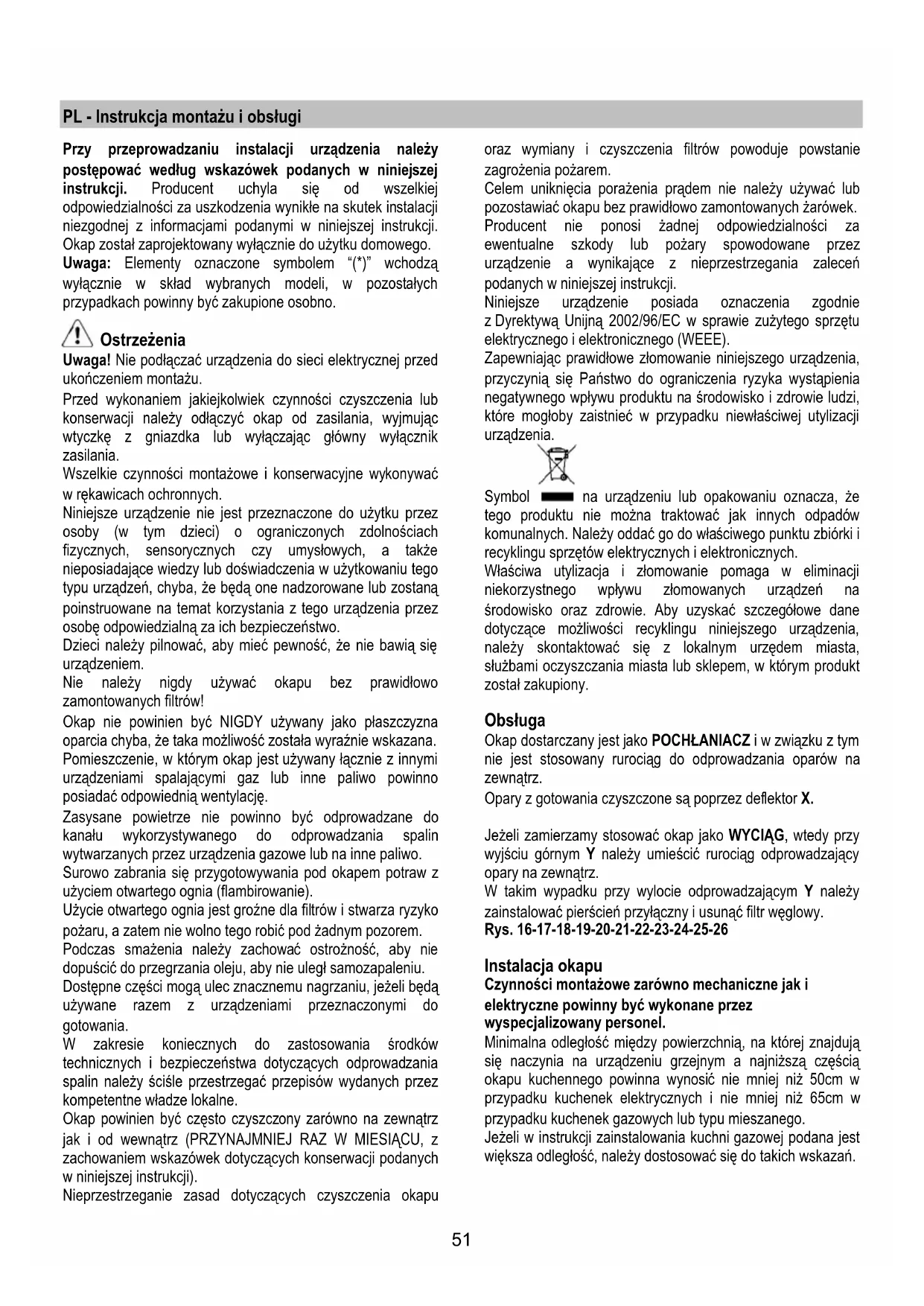 U některých modelů se mají instalovat postranní svítidla: Je třeba je vyměňovat svítidly stejné formy o max 40W (E14). K přístupu do úložného prostoru svítidel vyjměte kryt A. Jestliže osvětlení nefunguje, dříve než zavoláte servis si ověřte, zda jste správně nasadili žárovky do uložení.51 PL - Instrukcja montażu i obsługi Przy przeprowadzaniu instalacji urządzenia należy postępować według wskazówek podanych w niniejszej instrukcji. Producent uchyla się od wszelkiej odpowiedzialności za uszkodzenia wynikłe na skutek instalacji niezgodnej z informacjami podanymi w niniejszej instrukcji. Okap został zaprojektowany wyłącznie do użytku domowego. Uwaga: Elementy oznaczone symbolem “(*)” wchodzą wyłącznie w skład wybranych modeli, w pozostałych przypadkach powinny być zakupione osobno. Ostrzeżenia Uwaga! Nie podłączać urządzenia do sieci elektrycznej przed ukończeniem montażu. Przed wykonaniem jakiejkolwiek czynności czyszczenia lub konserwacji należy odłączyć okap od zasilania, wyjmując wtyczkę z gniazdka lub wyłączając główny wyłącznik zasilania. Wszelkie czynności montażowe i konserwacyjne wykonywać w rękawicach ochronnych. Niniejsze urządzenie nie jest przeznaczone do użytku przez osoby (w tym dzieci) o ograniczonych zdolnościach fizycznych, sensorycznych czy umysłowych, a także nieposiadające wiedzy lub doświadczenia w użytkowaniu tego typu urządzeń, chyba, że będą one nadzorowane lub zostaną poinstruowane na temat korzystania z tego urządzenia przez osobę odpowiedzialną za ich bezpieczeństwo. Dzieci należy pilnować, aby mieć pewność, że nie bawią się urządzeniem. Nie należy nigdy używać okapu bez prawidłowo zamontowanych filtrów! Okap nie powinien być NIGDY używany jako płaszczyzna oparcia chyba, że taka możliwość została wyraźnie wskazana. Pomieszczenie, w którym okap jest używany łącznie z innymi urządzeniami spalającymi gaz lub inne paliwo powinno posiadać odpowiednią wentylację. Zasysane powietrze nie powinno być odprowadzane do kanału wykorzystywanego do odprowadzania spalin wytwarzanych przez urządzenia gazowe lub na inne paliwo. Surowo zabrania się przygotowywania pod okapem potraw z użyciem otwartego ognia (flambirowanie). Użycie otwartego ognia jest groźne dla filtrów i stwarza ryzyko pożaru, a zatem nie wolno tego robić pod żadnym pozorem. Podczas smażenia należy zachować ostrożność, aby nie dopuścić do przegrzania oleju, aby nie uległ samozapaleniu. Dostępne części mog ą ulec znacznemu nagrzaniu, jeżeli będą używane razem z urządzeniami przeznaczonymi do gotowania. W zakresie koniecznych do zastosowania środków technicznych i bezpieczeństwa dotyczących odprowadzania spalin należy ściśle przestrzegać przepisów wydanych przez kompetentne władze lokalne. Okap powinien być często czyszczony zarówno na zewnątrz jak i od wewnątrz (PRZYNAJMNIEJ RAZ W MIESIĄCU, z zachowaniem wskazówek dotyczących konserwacji podanych w niniejszej instrukcji). Nieprzestrzeganie zasad dotyczących czyszczenia okapu oraz wymiany i czyszczenia filtrów powoduje powstanie zagrożenia pożarem. Celem uniknięcia porażenia prądem nie należy używać lub pozostawiać okapu bez prawidłowo zamontowanych żarówek. Producent nie ponosi żadnej odpowiedzialności za ewentualne szkody lub pożary spowodowane przez urządzenie a wynikające z nieprzestrzegania zaleceń podanych w niniejszej instrukcji. Niniejsze urządzenie posiada oznaczenia zgodnie z Dyrektywą Unijną 2002/96/EC w sprawie zuż ytego sprzętu elektrycznego i elektronicznego (WEEE). Zapewniając prawidłowe złomowanie niniejszego urządzenia, przyczynią się Państwo do ograniczenia ryzyka wystąpienia negatywnego wpływu produktu na środowisko i zdrowie ludzi, które mogłoby zaistnieć w przypadku niewłaściwej utylizacji urządzenia. Symbol na urządzeniu lub opakowaniu oznacza, że tego produktu nie można traktować jak innych odpadów komunalnych. Należy oddać go do właściwego punktu zbiórki i recyklingu sprzętów elektrycznych i elektronicznych. Właściwa utylizacja i złomowanie pomaga w eliminacji niekorzystnego wpływu złomowanych urządzeń na środowisko oraz zdrowie. Aby uzyskać szczegółowe dane dotyczące możliwości recyklingu niniejszego urządzenia, należy skontaktować się z lokalnym urzędem miasta, służbami oczyszczania miasta lub sklepem, w którym produkt został zakupiony. Obsługa Okap dostarczany jest jako POCHŁANIACZ i w związku z tym nie jest stosowany rurociąg do odprowadzania oparów na zewnątrz. Opary z gotowania czyszczone są poprzez deflektor X. Jeżeli zamierzamy stosować okap jako WYCIĄG, wtedy przy wyjściu górnym Y należy umieścić rurociąg odprowadzający opary na zewnątrz. W takim wypadku przy wylocie odprowadzającym Y należy zainstalować pierścień przyłączny i usunąć filtr węglowy. Rys. 16-17-18-19-20-21-22-23-24-25-26 Instalacja okapu Czynności montażowe zarówno mechaniczne jak i elektryczne powinny być wykonane przez wyspecjalizowany personel. Minimalna odległość między powierzchnią, na której znajdują się naczynia na urządzeniu grzejnym a najniższą częścią okapu kuchennego powinna wynosić nie mniej niż 50cm w przypadku kuchenek elektrycznych i nie mniej niż 65cm w przypadku kuchenek gazowych lub typu mieszanego. Jeżeli w instrukcji zainstalowania kuchni gazowej podana jest większa odległość, należy dostosować się do takich wskazań.52 Połączenie elektryczne Napięcie sieci powinno odpowiadać napięciu wskazanemu na tabliczce znamionowej umieszczonej wewnątrz okapu. Produkt jest przeznaczony do bezpośredniego podłączenia do sieci zasilania należy, zatem umieścić wyłącznik dwubiegunowy spełniający obowiązujące przepisy i który powinien zapewnić całkowite odłączenie od sieci w warunkach przeciążenia kategorii III, zgodnie z wymogami ins