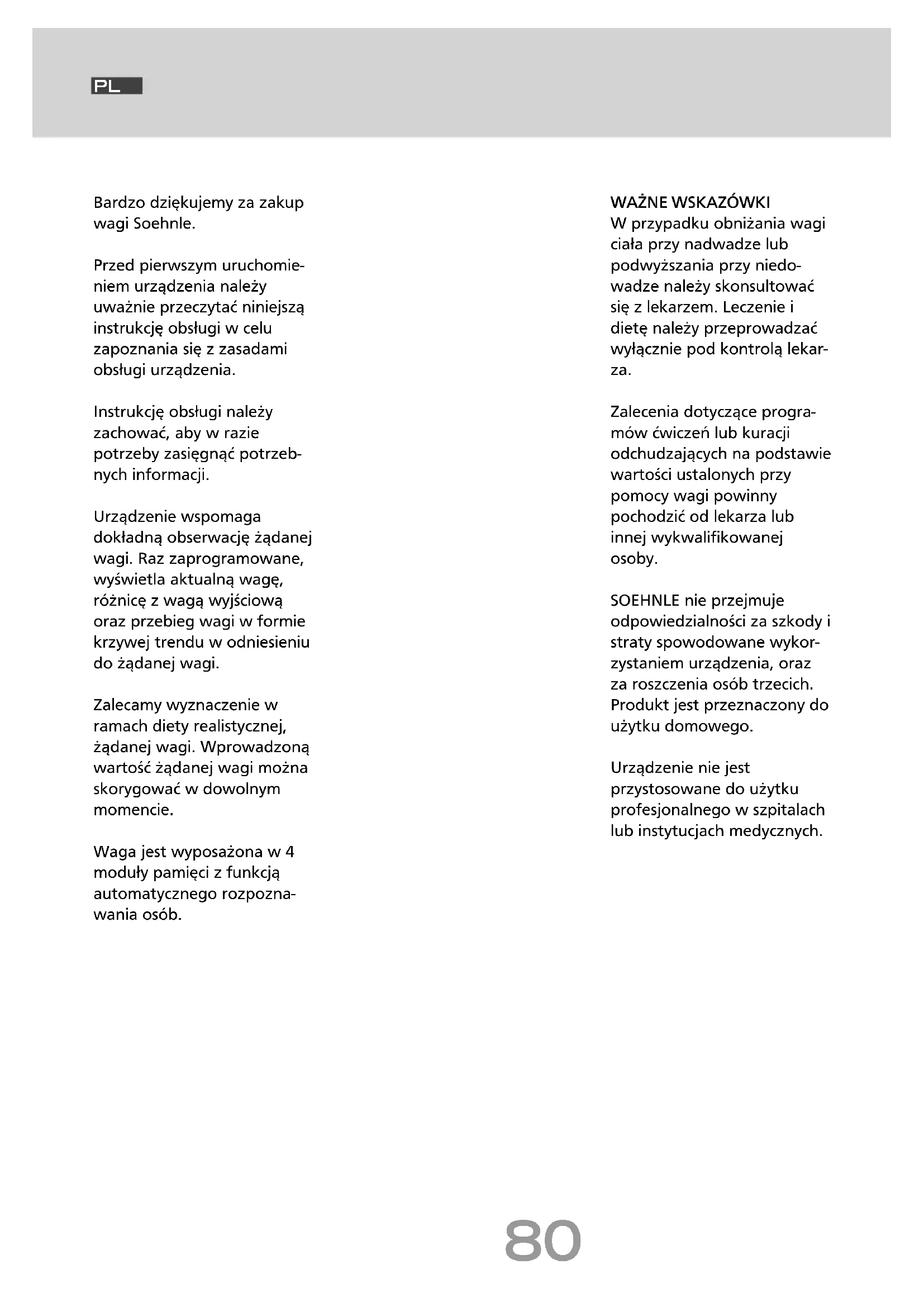 W przypadku obniżania wagi ciała przy nadwadze lub podwyższania przy niedo- wadze należy skonsultować się z lekarzem. Leczenie i dietę należy przeprowadzać wyłącznie pod kontrolą lekar- za. Zalecenia dotyczące progra- mów ćwiczeń lub kuracji odchudzających na podstawie wartości ustalonych przy pomocy wagi powinny pochodzić od lekarza lub innej wykwalifikowanej osoby. SOEHNLE nie przejmuje odpowiedzialności za szkody i straty spowodowane wykor- zystaniem urządzenia, oraz za roszczenia osób trzecich. Produkt jest przeznaczony do użytku domowego. Urządzenie nie jest przystosowane do użytku profesjonalnego w szpitalach lub instytucjach medycznych.
