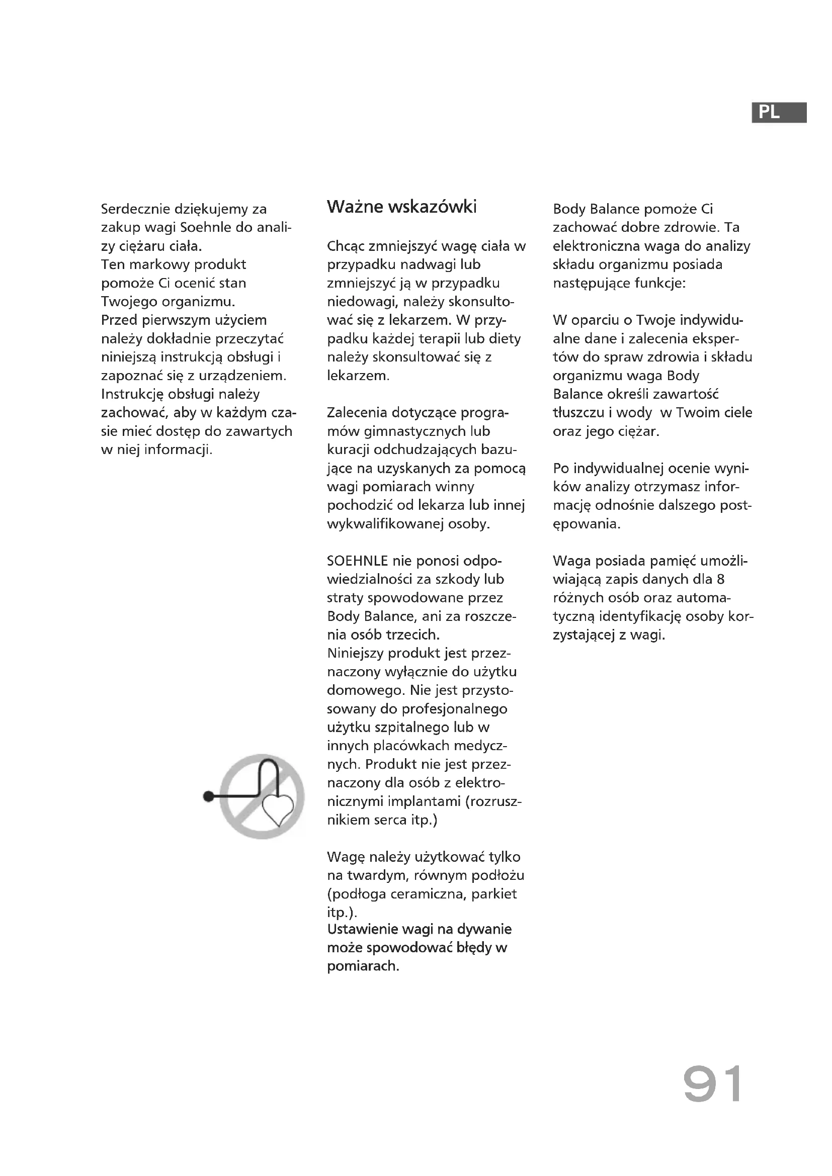 SOEHNLE nie ponosi odomowiedzialnosci za szkody lub straty spowodowane przy Body Balance, ani za roszczenia osob trzechich.