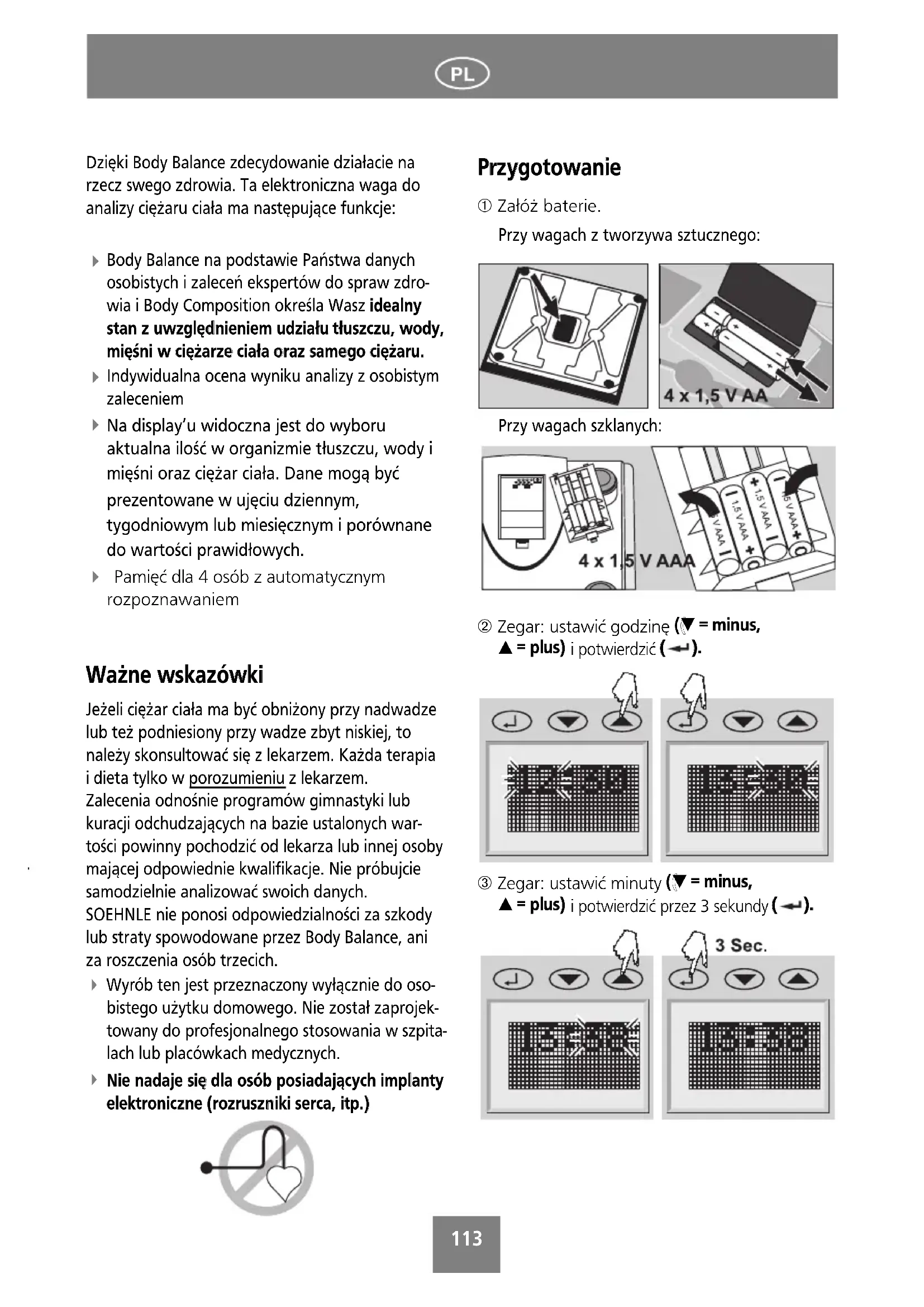 Na display’u widoczna jest do wyboru aktualna ilość w organizmie tłuszczu, wody i mięśni oraz ciężar ciała. Dane mogą być prezentowane w ujęciu dziennym, tygodniowym lub miesięcznym i porównane do wartości prawidłowych. Pamięć dla 4 osób z automatycznym rozpoznawaniem WWaażżnnee wwsskkaazzóówwkkii Jeżeli ciężar ciała ma być obniżony przy nadwadze lub też podniesiony przy wadze zbyt niskiej, to należy skonsultować się z lekarzem. Każda terapia i dieta tylko w por ozumieniu z lekarzem. Zalecenia odnośnie programów gimnastyki lub kuracji odchudzających na bazie ustalonych war- tości powinny pochodzić od lekarza lub innej osoby mającej odpowiednie kwalifikacje. Nie próbujcie samodzielnie analizować swoich danych. SOEHNLE nie ponosi odpowiedzialności za szkody lub straty spowodowane przez Body Balance, ani za roszczenia osób trzecich. Wyrób ten jest przeznaczony wyłącznie do oso- bistego użytku domowego. Nie został zaprojek- towany do profesjonalnego stosowania w szpita- lach lub placówkach medycznych.