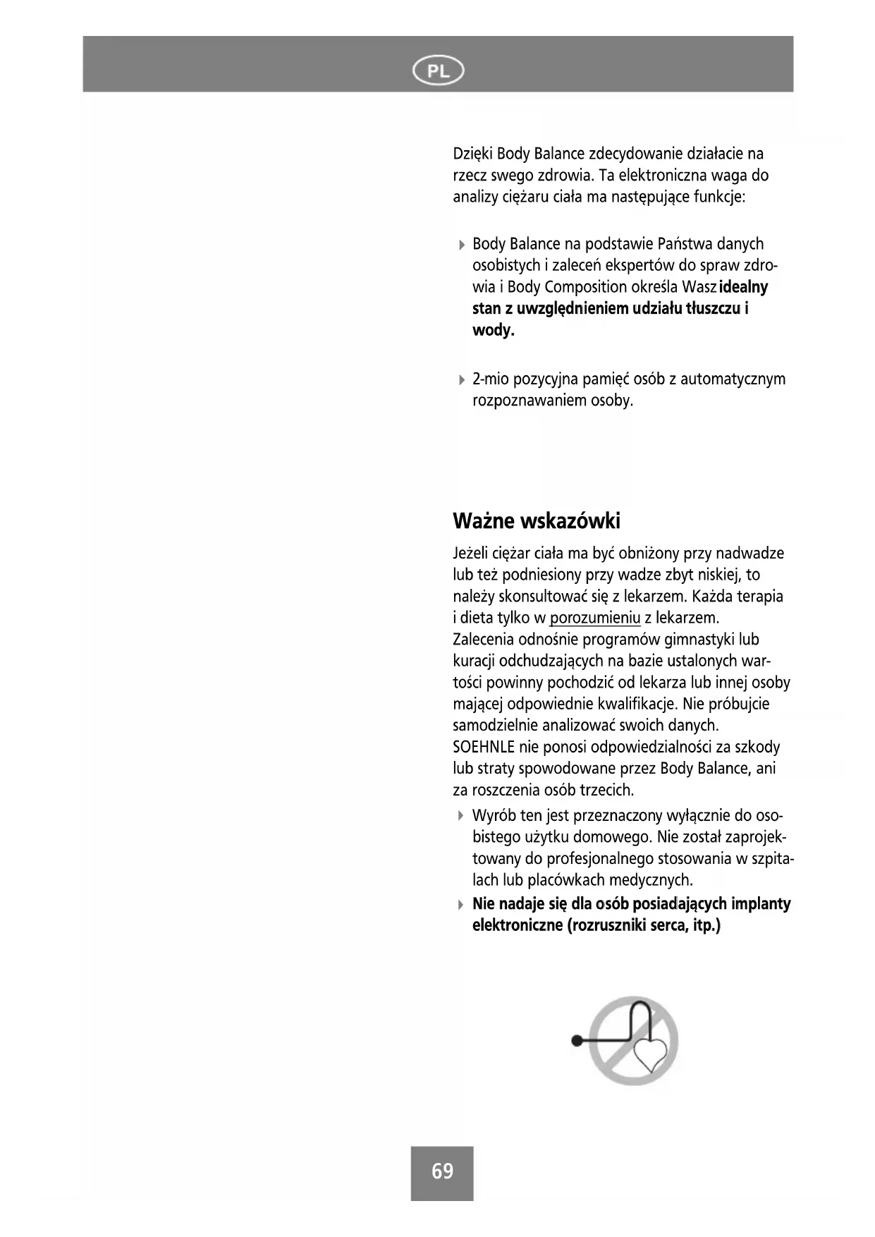 2-mio pozycyjna pamięć osób z automatycznym rozpoznawaniem osoby. WWaażżnnee wwsskkaazzóówwkkii Jeżeli ciężar ciała ma być obniżony przy nadwadze lub też podniesiony przy wadze zbyt niskiej, to należy skonsultować się z lekarzem. Każda terapia i dieta tylko w por ozumieniu z lekarzem. Zalecenia odnośnie programów gimnastyki lub kuracji odchudzających na bazie ustalonych war- tości powinny pochodzić od lekarza lub innej osoby mającej odpowiednie kwalifikacje. Nie próbujcie samodzielnie analizować swoich danych. SOEHNLE nie ponosi odpowiedzialności za szkody lub straty spowodowane przez Body Balance, ani za roszczenia osób trzecich. Wyrób ten jest przeznaczony wyłącznie do oso- bistego użytku domowego. Nie został zaprojek- towany do profesjonalnego stosowania w szpita- lach lub placówkach medycznych.