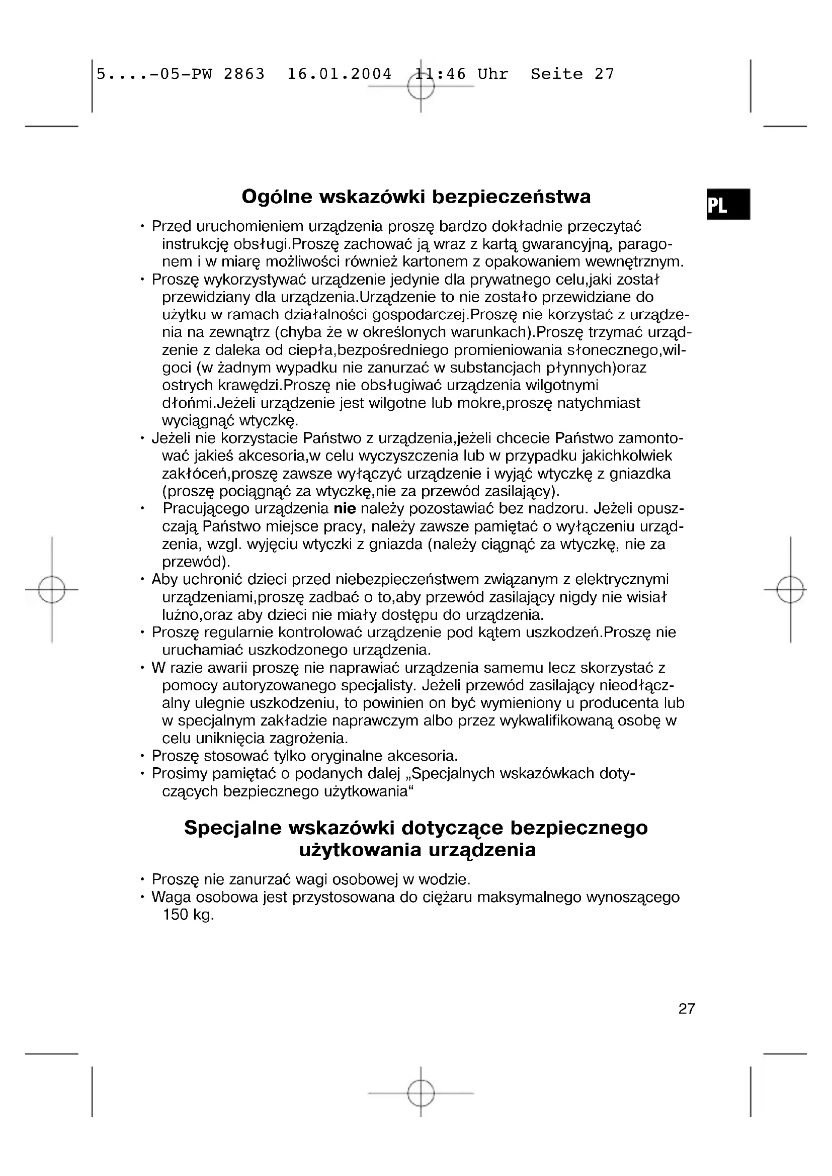 5....-05-PW 2863 16.01.2004 11:46 Uhr Seite 28• Proszę ostrożnie obchodzić się z wagą, ponieważ jest to instrument pomi- arowy. Proszę nie upuścić jej i nie wskakiwać na nią.