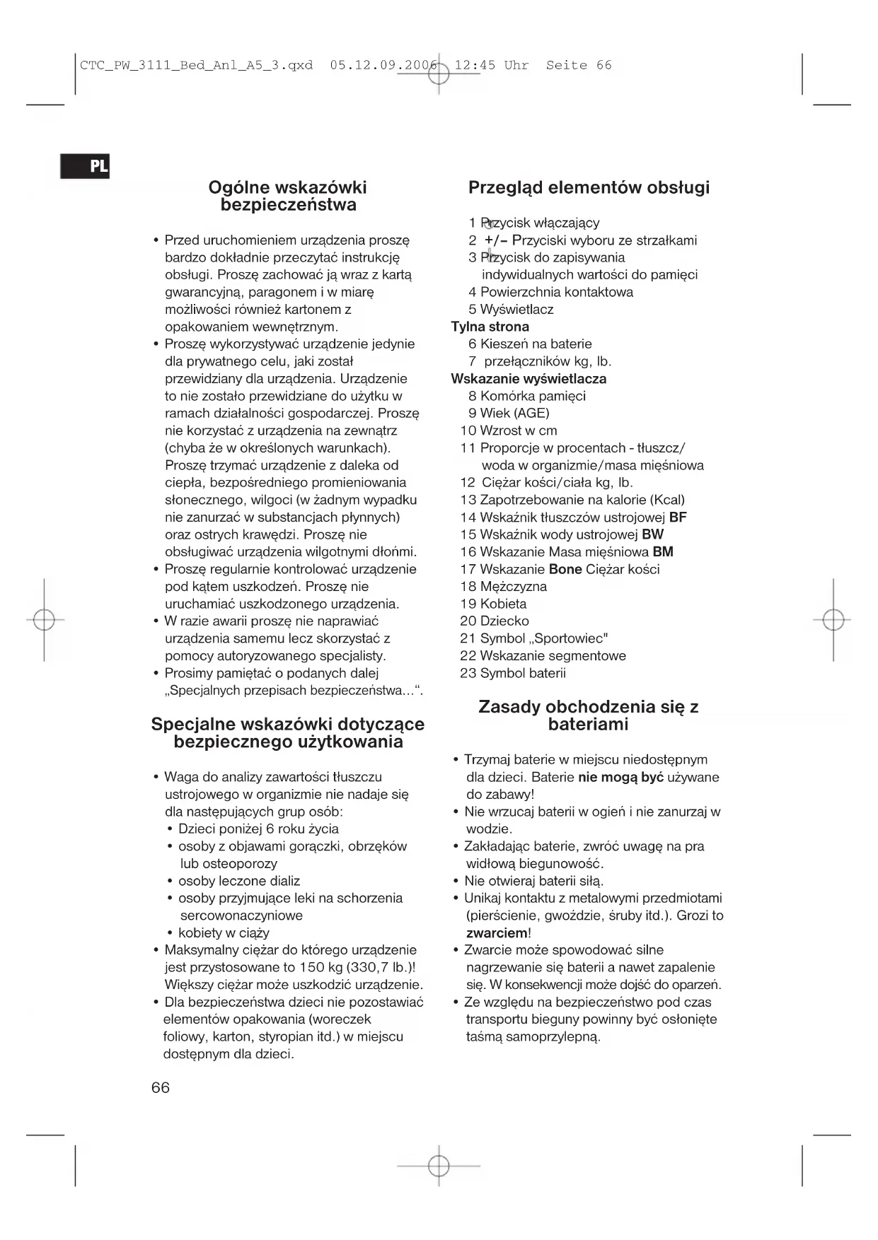 CTC_PW_3111_Bed_Anl_A5_3.qxd 05.12.09.2006 12:45 Uhr Seite 66• W razie wycieku elektrolitu z baterii, nie wetrzeć go w oczy ani śluzówki. W razie kontaktu umyć ręce wodą, oczy przepłukać czystą wodą, a w razie utrzymujących się dolegliwości skontaktować się z lekarzem.