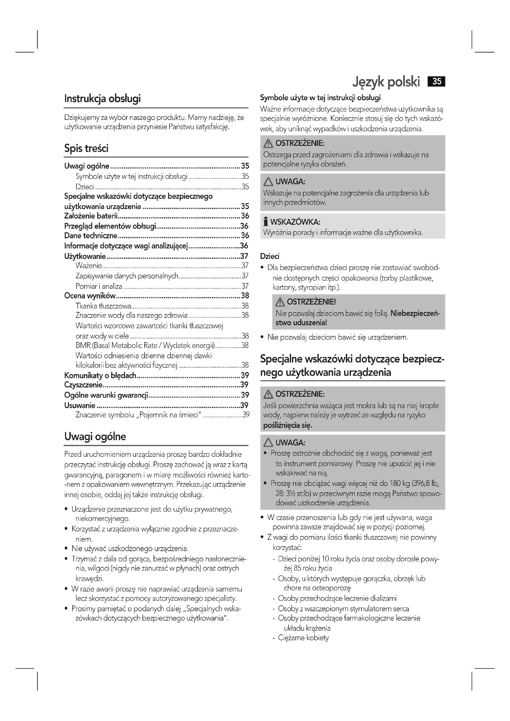 - Specjalne wskazówki dotyczące bezpiecznego użytkowania urządzenia p. 35