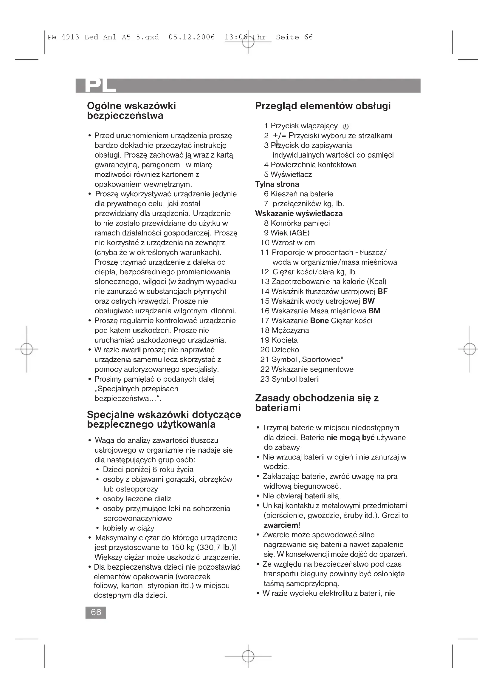 - Nie używać różnych typów baterii lub nowych i zużytych baterii w jednym zestawie. Uwaga: baterii nie należy wyrzucać do kosza na śmieci. Proszę pozbywać się zużytych baterii oddając je we właściwych punktach lub w sklepie. Proszę nigdy nie wrzucać baterii do ognia. Kieszeń na baterie (z tyu wagi) Obie baterie włożone do kieszeni są na czas transportu zabezpieczone folią. Przedłuża to trwałość baterii. Przed pierwszym użyciem zdejmij folię, aby umożliwić zasilanie wagi z baterii. Informacje dotyczące pomiaru tkanki tłuszczowej Odradzamy używanie tej wagi osobom, które mają wszczepiony stymulator serca lub inne elektroniczne implanty medyczne. Może to spowodować naruszenie sprawności pracy implantu. Urządzenie tylko wtedy będzie funkcjonowało prawidłowo, jeżeli staną Państwo boso, suchymi Stoppami na powierzchni kontaktowej! Zasada działania tego urządzenia oparta jest na pomiarze impedancji elektrycznej ciała. W tym celu urządzenie przepuszcza przez ciało słaby, niewyczuwalny sygnał elektryczny, na którego podstawie oblicza aktualne wskaźniki. Zasadniczo sygnał ten jest całkowicie niesz- kodliwy! Mimo to należy przestrzegać naszych szczególnych zasad bezpieczeństwa! Pomiar ten jest znany jako „Bioelektryczna Analiza Impedancji" (BAI), czynnik związany z zawartością tłuszczu ustrojowego i wody ustrojowej a także z innymi parametrami biologicznymi (wiek, płeć, wzrost). U pewnych osób istnieje równowaga między zawartością tkanki tłuszczowej i tkanki mięśniowej w organizmie, istnieją jednak także osoby, które można by uznać za szczupłe, u których równowaga ta została zachwiana wskutek zwiększenia masy tłuszczowej. Tkanka tłuszczowa w znaczny sposób wpływa na obciążenie organizmu, w szczególności układu krążenia. Kontrola obu wartości (tkanki tłuszczowej i ciężaru) to podstawa zachowania zdrowia i dobrej formy. Tłuszcz ustrojowy Tkanka tłuszczowa jest istotnym składnikiem organizmu. Tłuszcz spełnia ważną rolę począwszy od ochrony stawów, poprzez gromadzenie witamin, aż do regulacji temperatury ciała. Celem nie powinno więc być radykalne zmniejszenie zawartości tłuszczu PW_4913_Bed_Anl_A5_5.qxd 05.12.09.2006 13:06 Uhr Seite 67Cechy techniczne Wstępna konfi guracja pamięci: