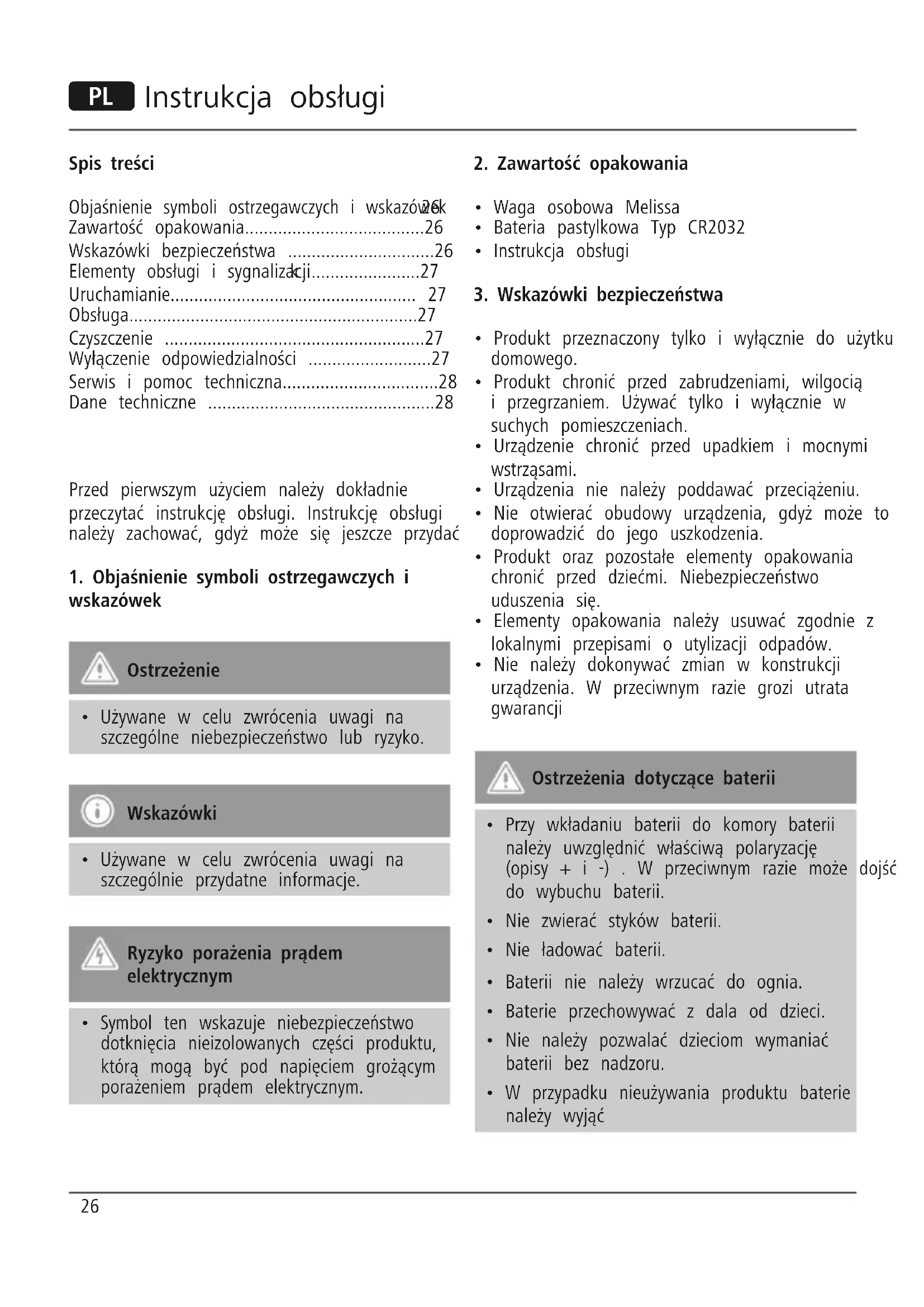 1 μικρή μπαταρία CR203226 P Instrukcja obsługi Spis treści Objaśnienie symboli ostrzegawczych i wskazówek