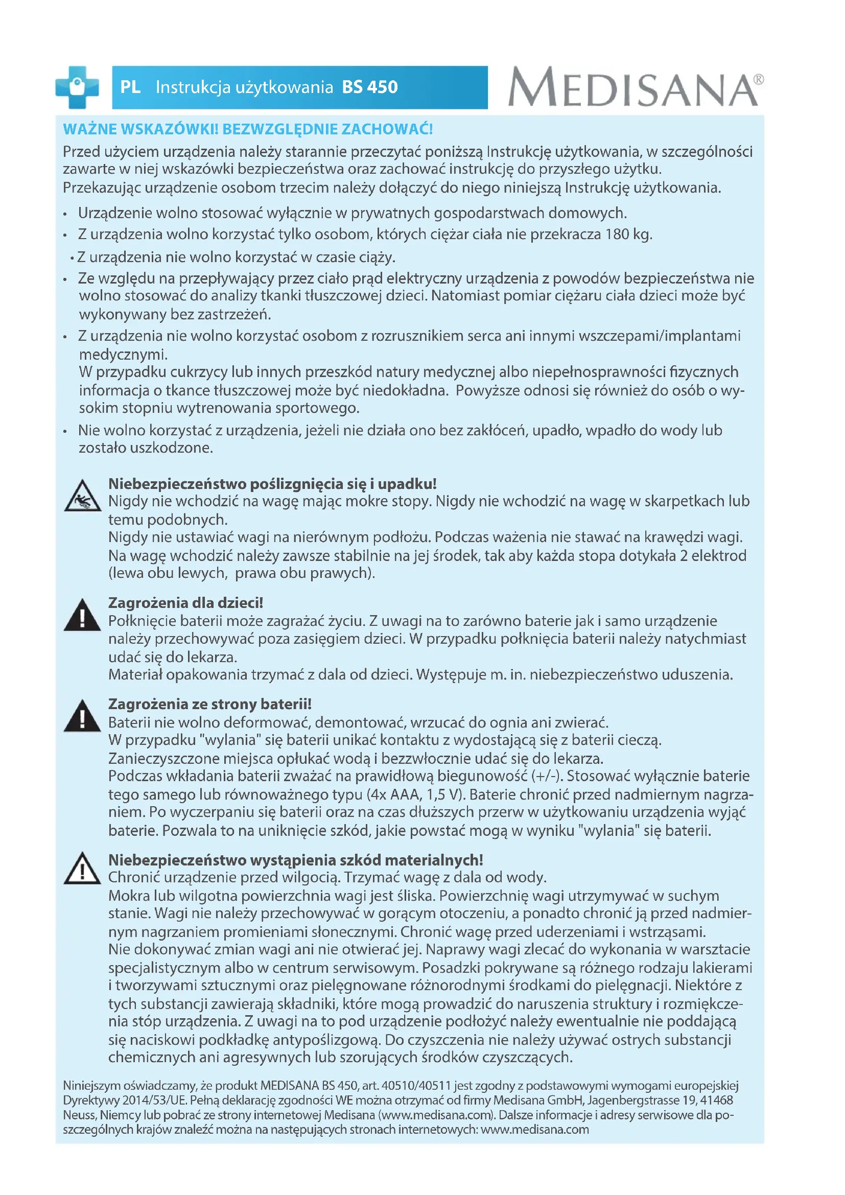 E-Mail: info@medisana.de Internet: www.medisana.com50 PL Instrukcja użytkowania BS 450 WAŻNE WSKAZÓWKI! BEZWZGLĘDNIE ZACHOWAĆ! Przed użyciem urządzenia należy starannie przeczytać poniższą Instrukcję użytkowania, w szczególności zawarte w niej wskazówki bezpieczeństwa oraz zachować instrukcję do przyszłego użytku. Przekazując urządzenie osobom trzecim należy dołączyć do niego niniejszą Instrukcję użytkowania.