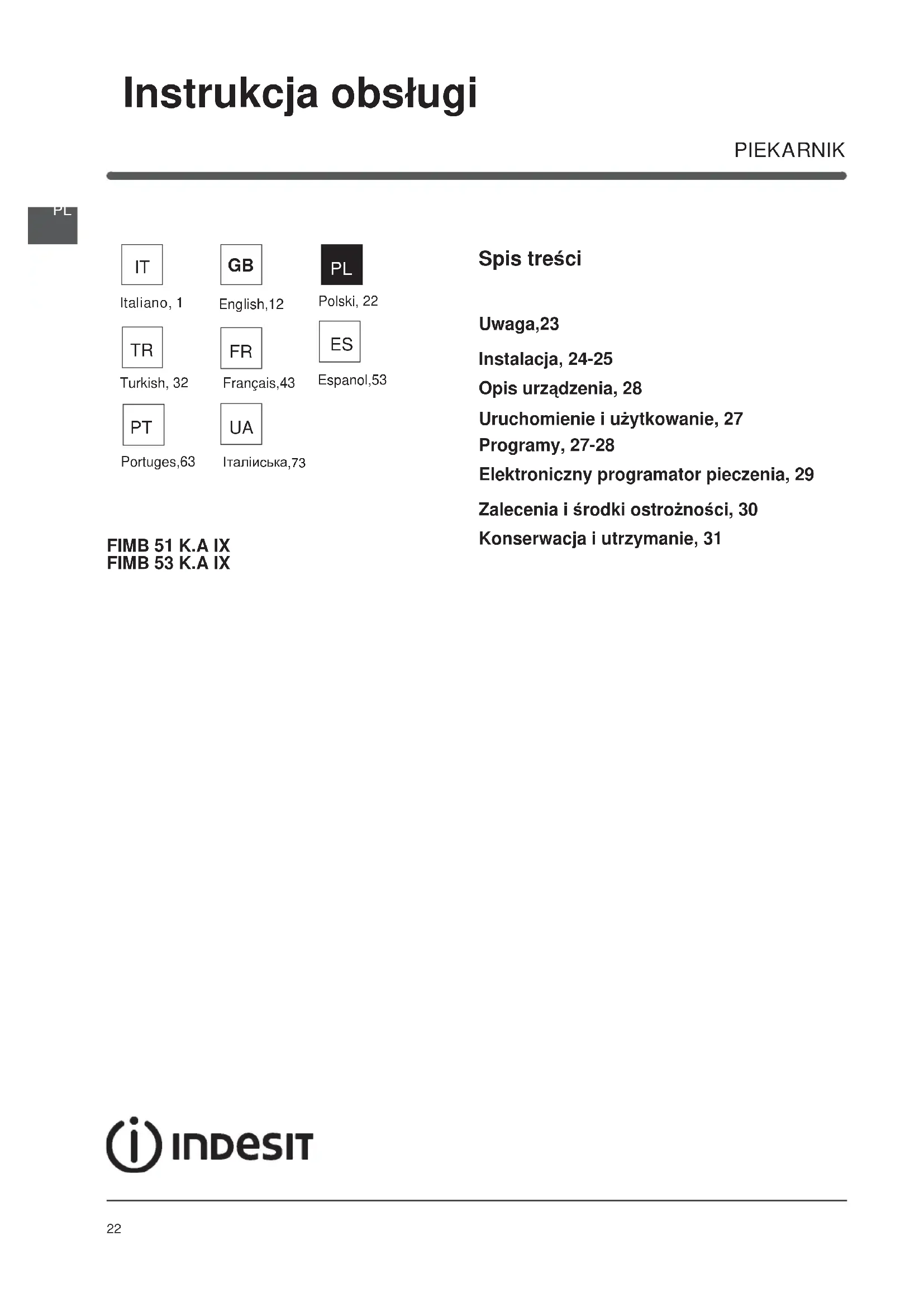 FIMB 51K.A IX - Piekarnik INDESIT - Bezpłatna instrukcja obsługi