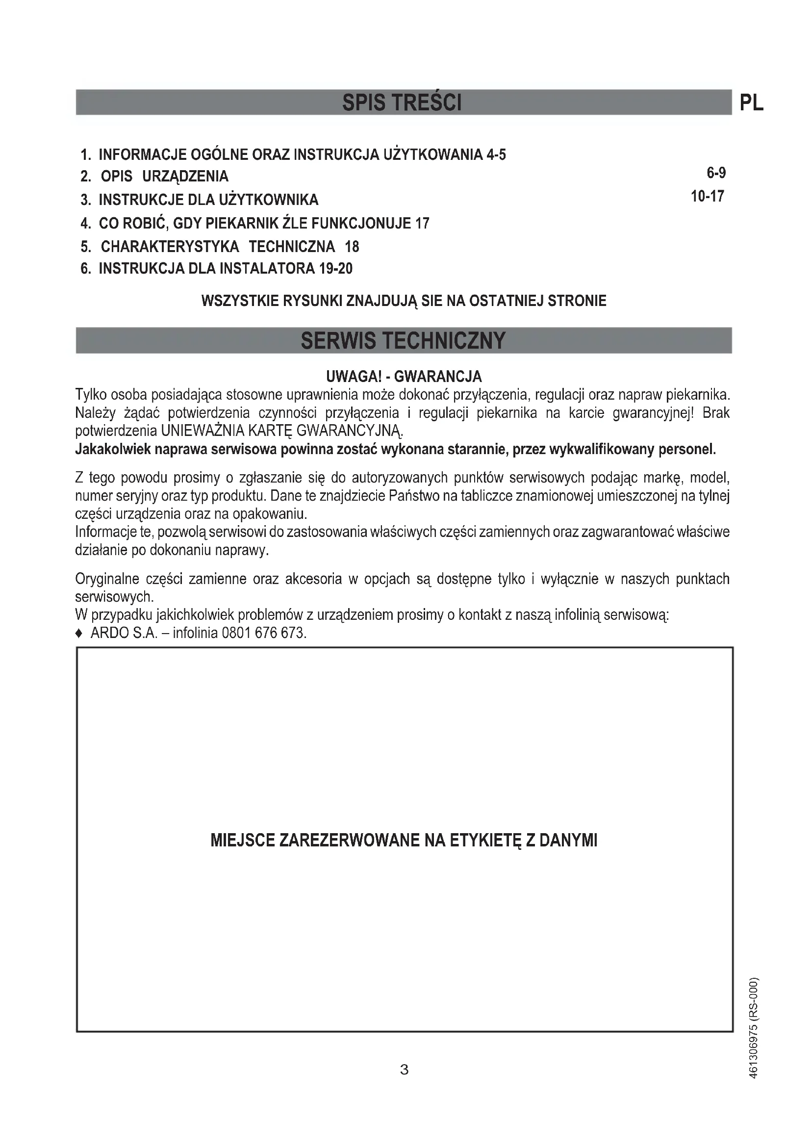 Tylko osoba posiadająca stosowne uprawnienia może dokonać przyłączenia, regulacji oraz napraw piekarnika. Należy żądać potwierdzenia czynności przyłączenia i regulacji piekarnika na karcie gwarancyjnej! Brak potwierdzenia UNIEWAŻNIA KARTĘ GWARANCYJNĄ. Jakakolwiek naprawa serwisowa powinna zostać wykonana starannie, przez wykwalifi kowany personel. Z tego powodu prosimy o zgłaszanie się do autoryzowanych punktów serwisowych podając markę, model, numer seryjny oraz typ produktu. Dane te znajdziecie Państwo na tabliczce znamionowej umieszczonej na tylnej części urządzenia oraz na opakowaniu. Informacje te, pozwolą serwisowi do zastosowania właściwych części zamiennych oraz zagwarantować właściwe działanie po dokonaniu naprawy. Oryginalne części zamienne oraz akcesoria w opcjach są dostępne tylko i wyłącznie w naszych punktach serwisowych. W przypadku jakichkolwiek problemów z urządzeniem prosimy o kontakt z naszą infolinią serwisową: ♦ ARDO S.A. – infolinia 0801 676 673.