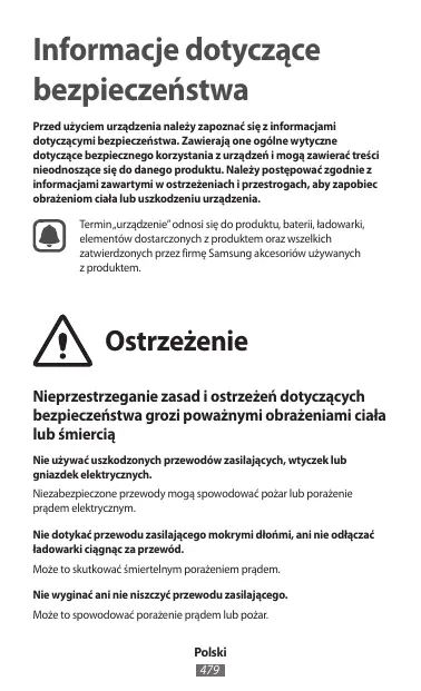 Informacje dotyczące bezpieczeństwa Przed użyciem urządzenia należy zapoznać się z informacjami dotyczącymi bezpieczeństwa. Zawierają one ogólne wytyczne dotyczące bezpiecznego korzystania z urządzeń i mogą zawierać treści nieodnoszące się do danego produktu. Należy postępować zgodnie z informacjami zawartymi w ostrzeżeniach i przestrogach, aby zapobiec obrażeniom ciała lub uszkodzeniu urządzenia. Termin „urządzenie” odnosi się do produktu, baterii, ładowarki, elementów dostarczonych z produktem oraz wszelkich zatwierdzonych przez firmę Samsung akcesoriów używanych z produktem. Ostrzeżenie Nieprzestrzeganie zasad i ostrzeżeń dotyczących bezpieczeństwa grozi poważnymi obrażeniami ciała lub śmiercią Nie używać uszkodzonych przewodów zasilających, wtyczek lub gniazdek elektrycznych. Niezabezpieczone przewody mogą spowodować pożar lub porażenie prądem elektrycznym. Nie dotykać przewodu zasilającego mokrymi dłońmi, ani nie odłączać ładowarki ciągnąc za przewód. Może to skutkować śmiertelnym porażeniem prądem. Nie wyginać ani nie niszczyć przewodu zasilającego. Może to spowodować porażenie prądem lub pożar. Polski