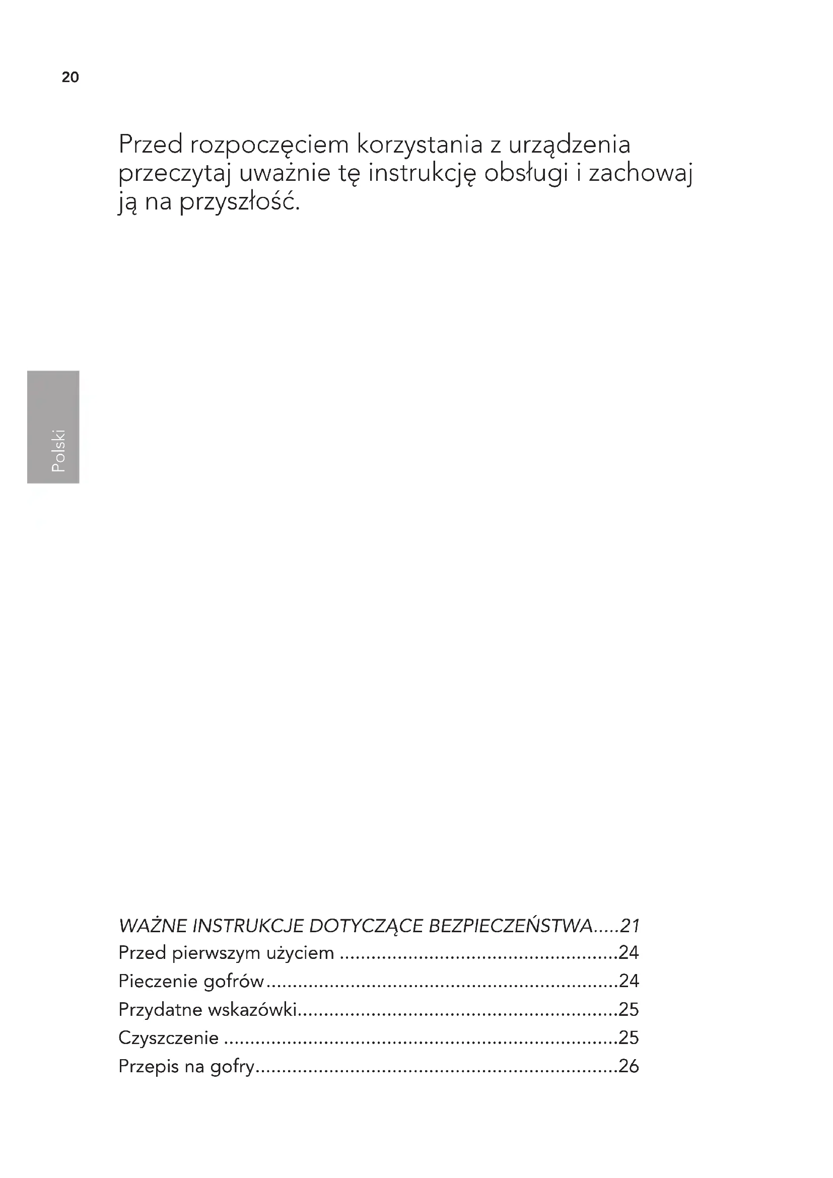 - Przepis na gofry Przed rozpoczęciem korzystania z urządzenia przeczytaj uważnie tę instrukcję obsługi i zachowaj ją na przyszłość.21 Polski p. 26