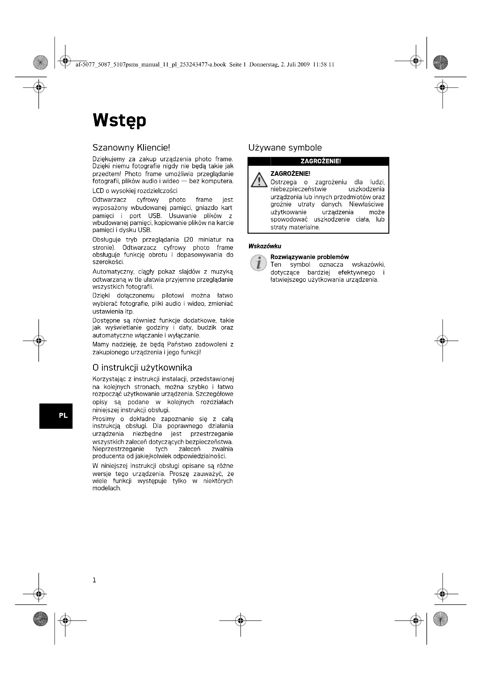 Dziekujemy za zakup urzadzenia photo frame. Dzieki niemu fotografie nigdy nie beda takie jak przydettem! Photo frame umozliwa przyegradinganie fotografii, plikow audio i video - bez komputera. LCD o wysokiej Rozdzielczość