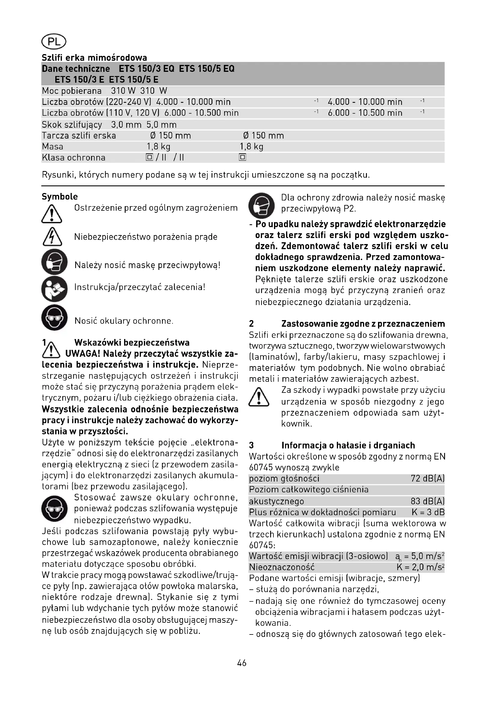 Niebezpieczeństwo porażenia prąde Należy nosić maskę przeciwpyłową! Instrukcja/przeczytać zalecenia! Nosić okulary ochronne. 1 Wskazówki bezpieczeństwa UWAGA! Należy przeczytać wszystkie za- lecenia bezpieczeństwa i instrukcje. Nieprze- strzeganie następujących ostrzeżeń i instrukcji może stać się przyczyną porażenia prądem elek- trycznym, pożaru i/lub ciężkiego obrażenia ciała. Wszystkie zalecenia odnośnie bezpieczeństwa pracy i instrukcje należy zachować do wykorzy- stania w przyszłości. Użyte w poniższym tekście pojęcie „elektrona- rzędzie“ odnosi się do elektronarzędzi zasilanych energią elektryczną z sieci (z przewodem zasila- jącym) i do elektronarzędzi zasilanych akumula- torami (bez przewodu zasilającego). Stosować zawsze okulary ochronne, poniewa podczas szlifowania wystpuje niebezpieczeństwo wypadku. Jeśli podczas szlifowania powstają pyły wybu- chowe lub samozapłonowe, należy koniecznie przestrzegać wskazówek producenta obrabianego materiału dotyczące sposobu obróbki. W trakcie pracy mogą powstawać szkodliwe/trują- ce pyły (np. zawierająca ołów powłoka malarska, niektóre rodzaje drewna). Stykanie się z tymi pyłami lub wdychanie tych pyłów może stanowić niebezpieczeństwo dla osoby obsługującej maszy- nę lub osób znajdujących się w pobliżu. Dla ochrony zdrowia należy nosić maskę przeciwpyłową P2. - Po upadku należy sprawdzić elektronarzędzie oraz talerz szlifi erski pod względem uszko- dzeń. Zdemontować talerz szlifi erski w celu dokładnego sprawdzenia. Przed zamontowa- niem uszkodzone elementy należy naprawić. Pęknięte talerze szlifi erskie oraz uszkodzone urządzenia mogą być przyczyną zranień oraz niebezpiecznego działania urządzenia. 2 Zastosowanie zgodne z przeznaczeniem Szlifi erki przeznaczone są do szlifowania drewna, tworzywa sztucznego, tworzyw wielowarstwowych (laminatów), farby/lakieru, masy szpachlowej i materiałów tym podobnych. Nie wolno obrabiać metali i materiałów zawierających azbest. Za szkody i wypadki powstałe przy użyciu urządzenia w sposób niezgodny z jego przeznaczeniem odpowiada sam użyt- kownik. 3 Informacja o hałasie i drganiach Wartości określone w sposób zgodny z normą EN 60745 wynoszą zwykle poziom głośności 72 dB(A) Poziom całkowitego ciśnienia akustycznego 83 dB(A) Plus różnica w dokładności pomiaru K = 3 dB Wartość całkowita wibracji (suma wektorowa w trzech kierunkach) ustalona zgodnie z normą EN 60745: Wartość emisji wibracji (3-osiowo) a