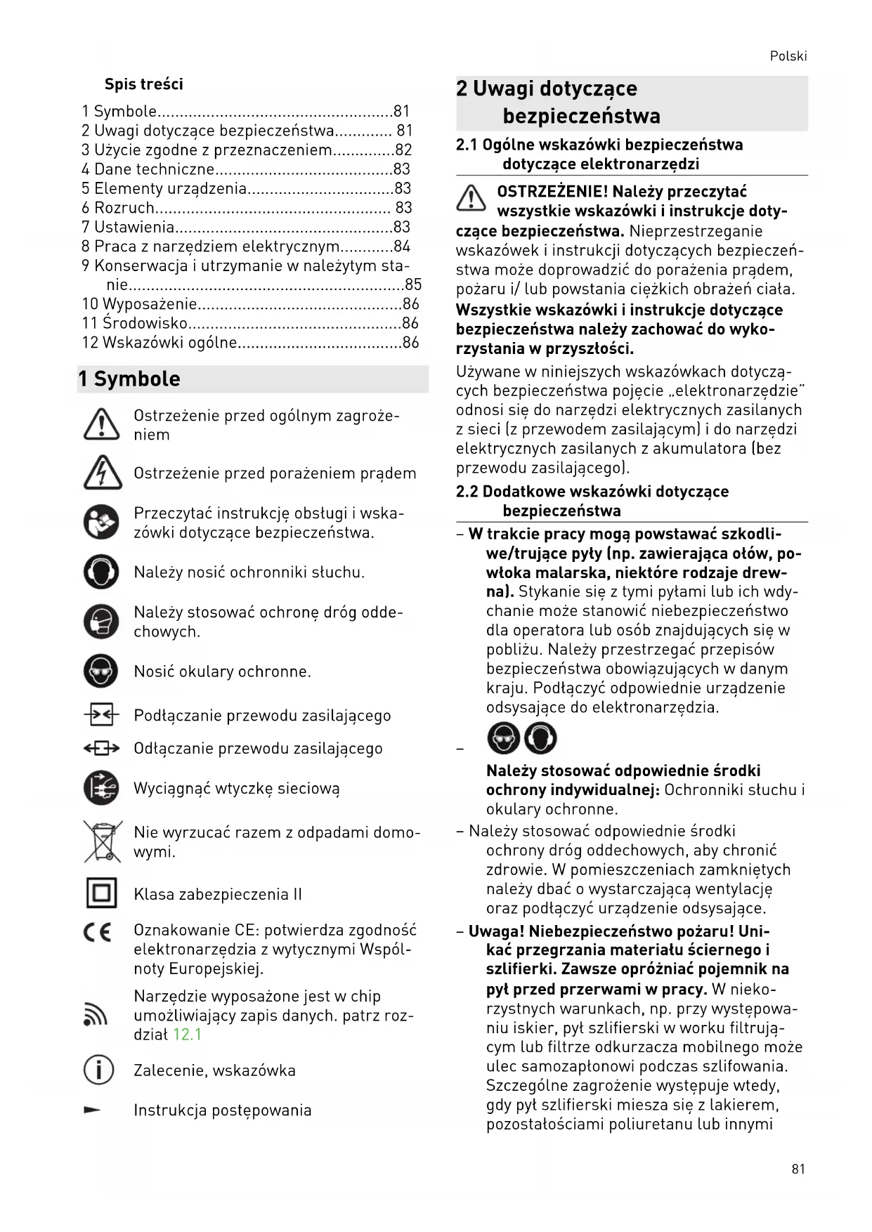 - 12 Wskazówki ogólne 1 Symbole Ostrzeżenie przed ogólnym zagroże niem Ostrzeżenie przed porażeniem prądem Przeczytać instrukcję obsługi i wska zówki dotyczące bezpieczeństwa. Należy nosić ochronniki słuchu. Należy stosować ochronę dróg odde chowych. Nosić okulary ochronne. Podłączanie przewodu zasilającego Odłączanie przewodu zasilającego Wyciągnąć wtyczkę sieciową Nie wyrzucać razem z odpadami domo wymi. Klasa zabezpieczenia II Oznakowanie CE: potwierdza zgodność elektronarzędzia z wytycznymi Wspól noty Europejskiej. Narzędzie wyposażone jest w chip umożliwiający zapis danych. patrz roz dział 12.1 Zalecenie, wskazówka Instrukcja postępowania 2 Uwagi dotyczące bezpieczeństwa p. 86