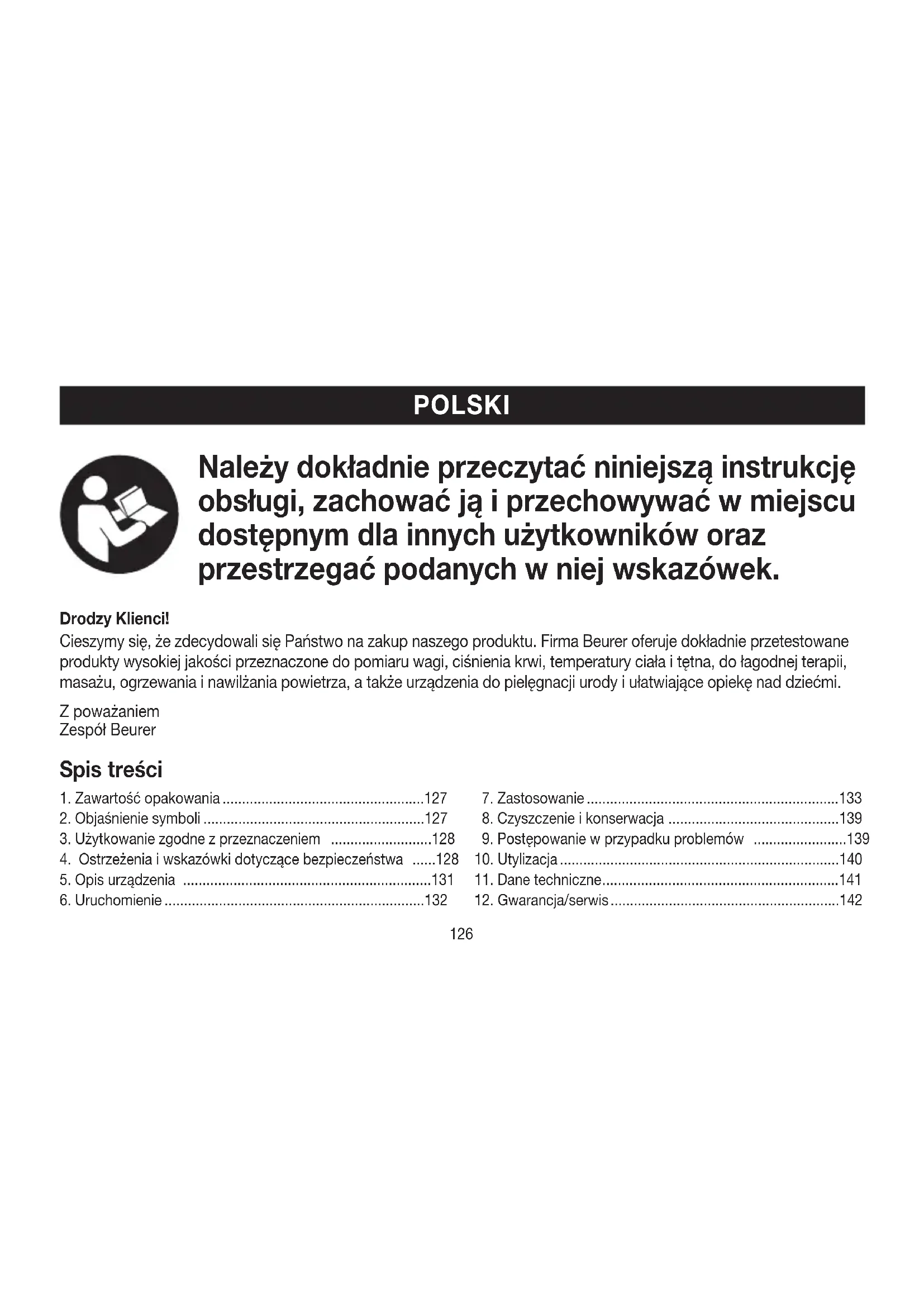 Firma Beurer GmbH, Söflinger Straße 218, D-89077 Ulm (zwana dalej „Beurer”) udziela gwarancji na ten pro- dukt na następujących warunkach iwponiżej opisanym zakresie. Poniższe warunki gwarancji nie naruszają ustawo- wych zobowiązań gwarancyjnych sprzedającego wynikających zumowy kupna zawartej zkupującym. Gwarancja obowiązuje również wsposób nienaru- szający bezwzględnie obowiązujących przepisów dot. odpowiedzialności. 142Firma Beurer gwarantuje bezawaryjne działanie oraz kompletność niniejszego produktu. Obowiązujący na całym świecie okres gwarancji obej- muje 5 lata/lat, licząc od zakupu nowego, nieużywanego produktu przez kupującego. Niniejsza gwarancja dotyczy tylko produktów nabytych przez kupującego jako konsumenta wyłącznie wcelach prywatnych wramach użytku domowego. Obowiązuje niemieckie prawo. Jeśli wokresie obowiązywania gwarancji produkt zosta- nie uznany za niekompletny lub wadliwy wdziałaniu zgodnie zponiższymi postanowieniami, firma Beurer bezpłatnie wymieni go lub naprawi zgodnie zniniejszymi warunkami gwarancji. Jeśli kupujący chce zgłosić reklamację gwarancyjną, najpierw kontaktuje się zlokalnym dealerem: patrz załączona lista „Service International” zadresami serwisowymi. Następnie kupujący otrzymuje dalsze informacje dot. rozpatrywania reklamacji gwarancyjnej, np. gdzie wysłać produkt ijakie dokumenty są wymagane. Roszczenie ztytułu gwarancji będzie rozpatrywane tylko wtedy, gdy kupujący może przedłożyć - kopię faktury/paragon zakupu oraz - oryginalny produkt firmie Beurer lub autoryzowanemu partnerowi firmy Beurer. Niniejsza gwarancja wyraźnie nie obejmuje: - zużycia wynikającego znormalnego użytkowania lub zużywania się produktu; - dostarczanych ztym produktem akcesoriów, które zużywają się lub ulegają zużyciu podczas prawidło- wego użytkowania (np. baterii, akumulatorów, man- kietów, uszczelek, elektrod, źródeł światła, nakładek iakcesoriów inhalatora); - produktów, które były używane, czyszczone, przecho- wywane lub konserwowane wniewłaściwy sposób i/ lub niezgodnie ztreścią instrukcji obsługi, atakże pro- duktów, które zostały otwarte, naprawione lub zmo- dyfikowane przez kupującego lub centrum serwisowe nieautoryzowane przez firmę Beurer; - uszkodzeń powstałych podczas transportu między producentem aklientem lub między centrum serwiso- wym aklientem; - produktów, które zostały zakupione jako artykuły grupy B(„B-Ware”) lub jako artykuły używane;