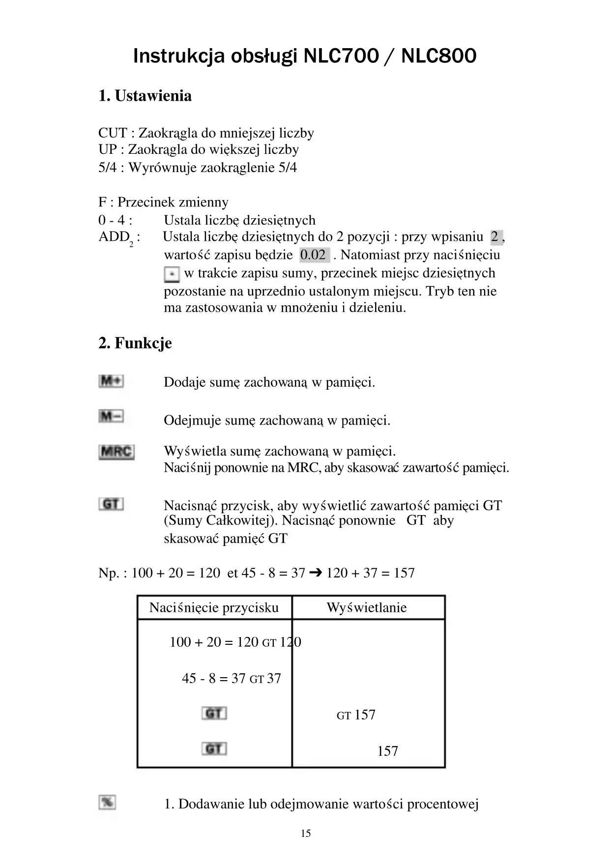 Dodaje sume zachowana w pamieci. Odejmuje sume zachowana w pamieci. Wy1wietla sume zachowana w pamieci. Naci1nij ponownie na MRC, aby skasowac zawarto1c pamieci. Nacisnac przycisk, aby wy1wietlic zawarto1c pamieci GT (Sumy Calkowitej). Nacisnac ponownie GT aby skasowac pamiec GT Np. : 100 + 20 = 120 et 45 - 8 = 37 ➔ 120 + 37 = 157 Naci1niecie przycisku Wy1wietlanie 100 + 20 = 120 GT 120