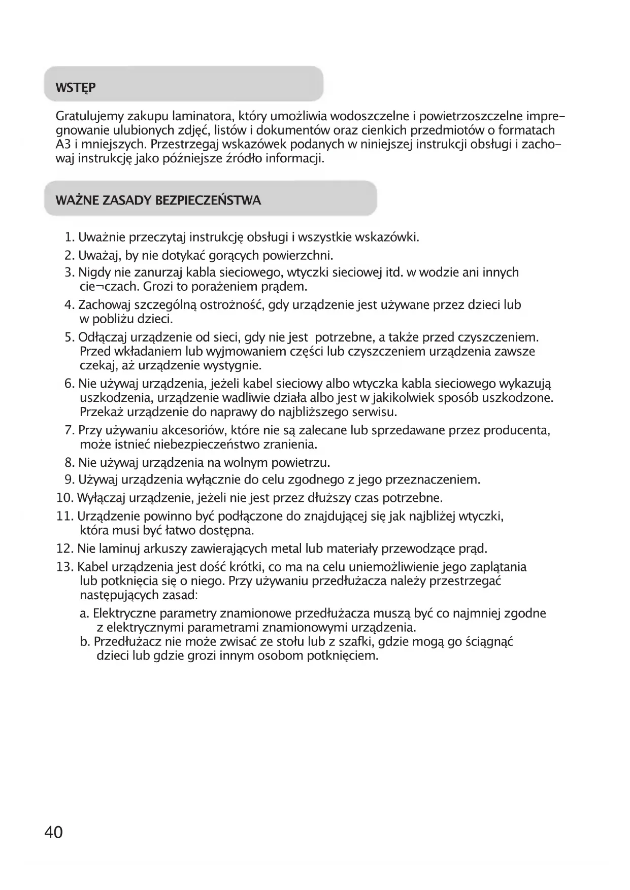- Nie laminuj grubych ani ciężkich dokumentów, które mogą się zablokować w laminatorze. Jeżeli w urządzeniu coś się zablokowało, przekaż je do naprawy do autoryzowanego miejscowego serwisu.