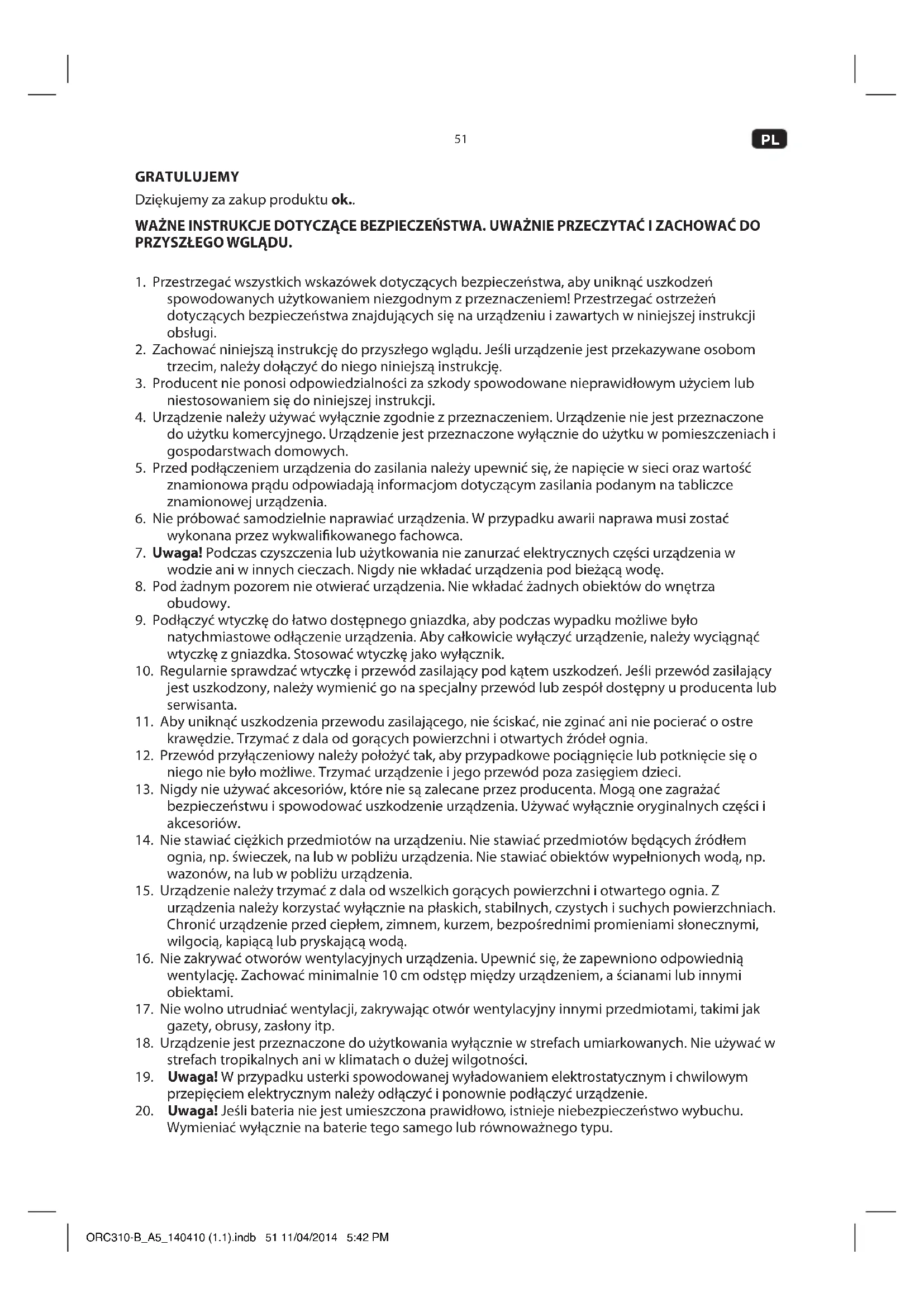 GRATULUJEMY Dziękujemy za zakup produktu ok.. WAŻNE INSTRUKCJE DOTYCZĄCE BEZPIECZEŃSTWA. UWAŻNIE PRZECZYTAĆ I ZACHOWAĆ DO PRZYSZŁEGO WGLĄDU.