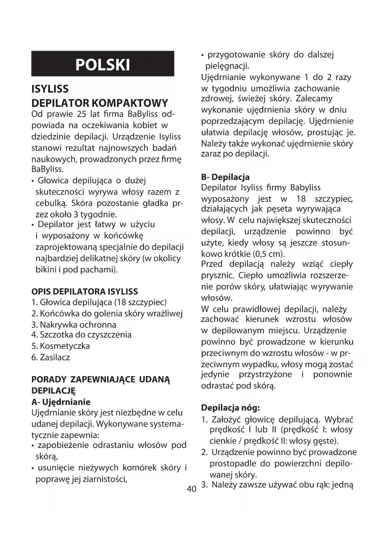 - przygotowanie skóry do dalszej pielęgnacji. Ujędrnianie wykonywane 1 do 2 razy w tygodniu umożliwia zachowanie zdrowej, świeżej skóry. Zalecamy wykonanie ujędrnienia skóry w dniu poprzedzającym depilację. Ujędrnienie ułatwia depilację włosów, prostując je. Należy także wykonać ujędrnienie skóry zaraz po depilacji. B- Depilacja Depilator Isyliss rmy Babyliss wyposażony jest w 18 szczypiec, działających jak pęseta wyrywająca włosy. W celu największej skuteczności depilacji, urządzenie powinno być użyte, kiedy włosy są jeszcze stosun- kowo krótkie (0,5 cm). Przed depilacją należy wziąć ciepły prysznic. Ciepło umożliwia rozszerze- nie porów skóry, ułatwiając wyrywanie włosów. W celu prawidłowej depilacji, należy zachować kierunek wzrostu włosów w depilowanym miejscu. Urządzenie powinno być prowadzone w kierunku przeciwnym do wzrostu włosów - w pr- zeciwnym wypadku, włosy mogą zostać jedynie przystrzyżone i ponownie odrastać pod skórą. Depilacja nóg: