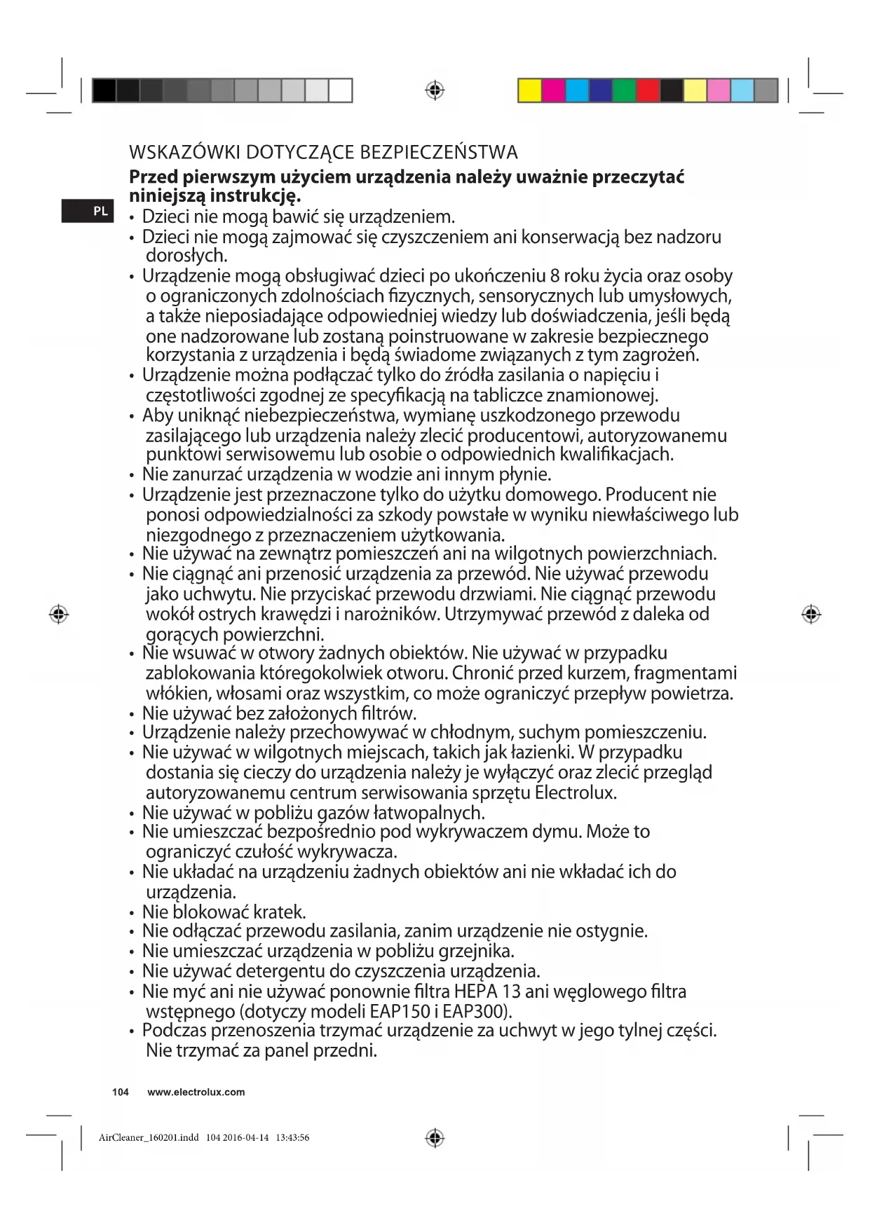 EAP150, EAP300, EAP450Występowanie Prawdopodobna przyczyna/rozwiązanieCzy ltr można myć w wodzie? Nie, ltry dostępne wraz z urządzeniem rozpadną się i ulegną zniszczeniu pod wpływem wody. (Filtry do modelu EAP450 są zmywalne).Czy ltr można czyścić odkurzaczem? Nie, czyszczenie odkurzaczem spowoduje jedynie rozprzestrzenienie się kurzu z powrotem w powietrzu. Jeśli uważasz, że ltr jest zbyt brudny, być może należy go wymienić. (Zmywalny ltr wstępny do modelu EAP450 można czyścić za pomocą odkurzacza lub miękkiej szczoteczki).Z urządzenia wydobywa się dziwny zapach, choć opakowanie dopiero zostało otwarte.Urządzenie było ciasno opakowane w karton i plastik. Ze względu na wentylator, który wprawia w ruch powietrze, z urządzenia mogą wydobywać się takie dziwne zapachy. W zależności od wrażliwości użytkownika, ich odczuwanie może osłabić się w ciągu kilku dni lub tygodnia. Wiąże się to z intensywnością używania urządzenia.Czy urządzenie jest w stanie oczyścić większą przestrzeń, niż wskazał producent?Wskaźniki CADR są nadawane na podstawie wyników testów przeprowadzanych w środowisku kontrolowanym. Zastosowanie w innym środowisku może wpłynąć na wydajności. W przypadku większych pomieszczeń w stosunku do wskaźników CADR, jakość powietrza poprawi się, jednak będzie to trwało trochę dłużej.Gdzie należy umieścić urządzenie? Powietrze musi swobodnie przepływać po bokach urządzenia oraz przed nim. Drzwi lub wąskie korytarze mogą ograniczyć dopływ powietrza do oczyszczacza. W takim przypadku cyrkulacja powietrza będzie zachodzić w pobliżu urządzenia.Kontrolka przycisku AIR QUALITY jest pomarańczowa lub czerwona, ale powietrze wydaje się czyste.Wyczyść czujnik za pomocą odkurzacza, ponieważ może być zablokowany lub zatkany.Czasami skompresowane powietrze może pomóc usunąć blokadę czujnika.Nadal widzę pył unoszący się w powietrzu lub na meblach.Urządzenie potra wychwycić większość kurzu i cząsteczek, jednak otwieranie drzwi i okien, uruchamianie centralnego ogrzewania lub klimatyzacji itp. może powodować przedostawanie się do powietrza widocznego kurzu.Nic nie utrzymuje ltrów na miejscu. Filtry mają spoczywać wewnątrz urządzenia. Po jego włączeniu siła powietrza przedostającego się przez urządzenie sprawi, że będą one ciasno przylegać.Słyszę odgłos silnika wentylatora. Jest to normalne, szczególnie w nocy. Gdy dźwięki pochodzące z otoczenia cichną, słyszalne stają się powtarzające się dźwięki pochodzące z silnika.Urządzenie przestało skutecznie usuwać zapachy. Wydaje się, że wydobywa się z niego dziwny zapach.Sprawdź, czy czujnik jakości powietrza nie został zablokowany lub zatkany.Przesuń urządzenie bliżej miejsca, w którym wyczuwalne są nieprzyjemne zapachy.Wymień ltry, gdyż ich możliwości wychwytywania zanieczyszczeń prawdopodobnie zostały przekroczone. Być może musisz częściej wymieniać ltry.Wskaźnik CHECK FILTER nadal świeci po wymianie ltra HEPA.Naciśnij delikatnie przycisk RESET FILTER, wkładając końcówkę spinacza do papieru w otwór, w którym znajduje przycisk RESET FILTER. Przytrzymaj go od 3 do 5 sekund, aż rozlegnie się krótki sygnał dźwiękowy oznaczający, że urządzenie zostało zresetowane. www.electrolux.com