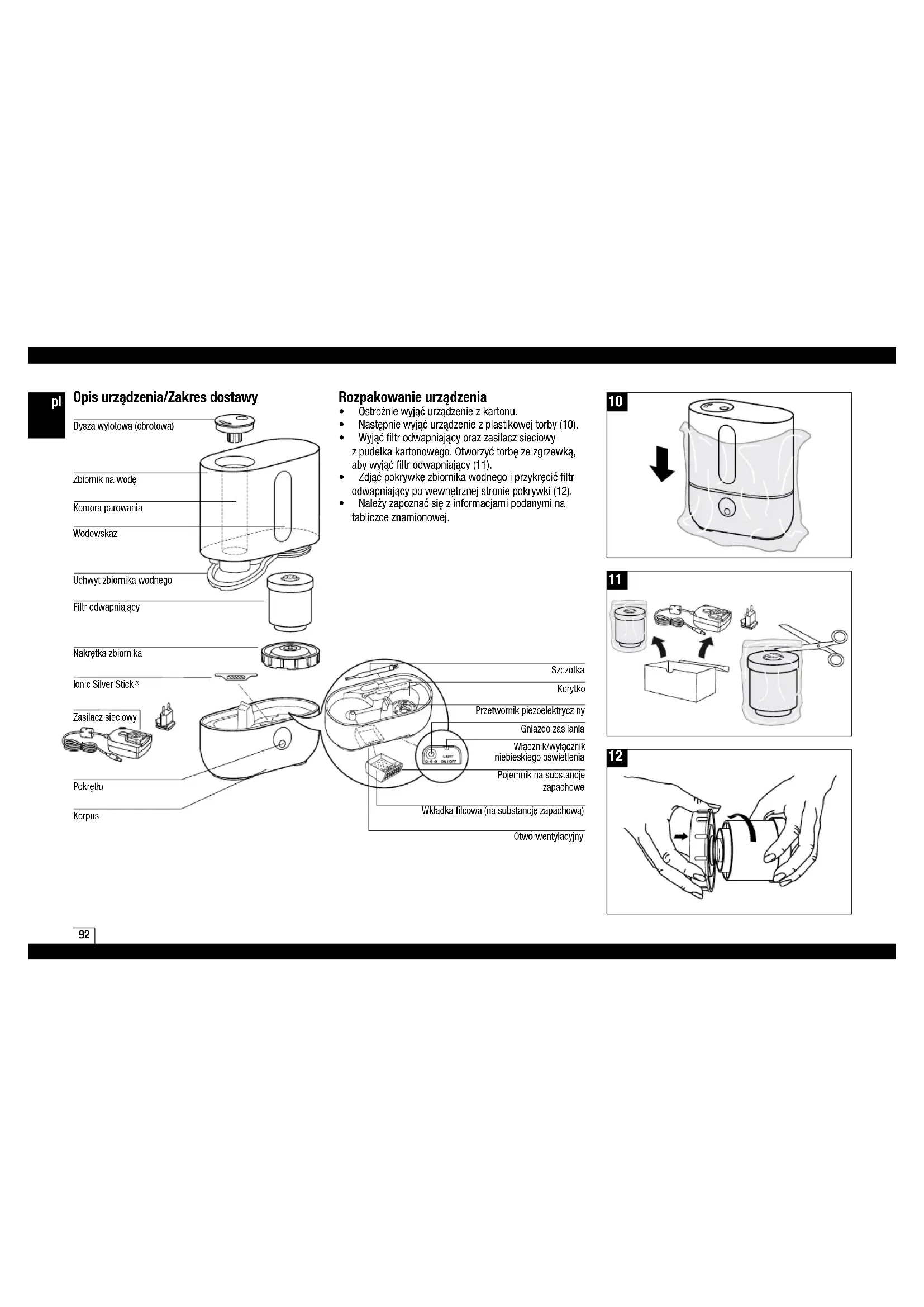 Zasilaczsieciowy Dysza wylotowa (obrotowa) Komora parowania Uchwytzbiornikawodnego Wodowskaz Zbiorniknawodę Szczotka Filtr odwapniający Korpus Pokrętło Nakrętkazbiornika Przetwornik piezoelektrycz ny Gniazdozasilania Wkładkafilcowa(nasubstancjęzapachową) Otwór wentylacyjny Rozpakowanie urządzenia