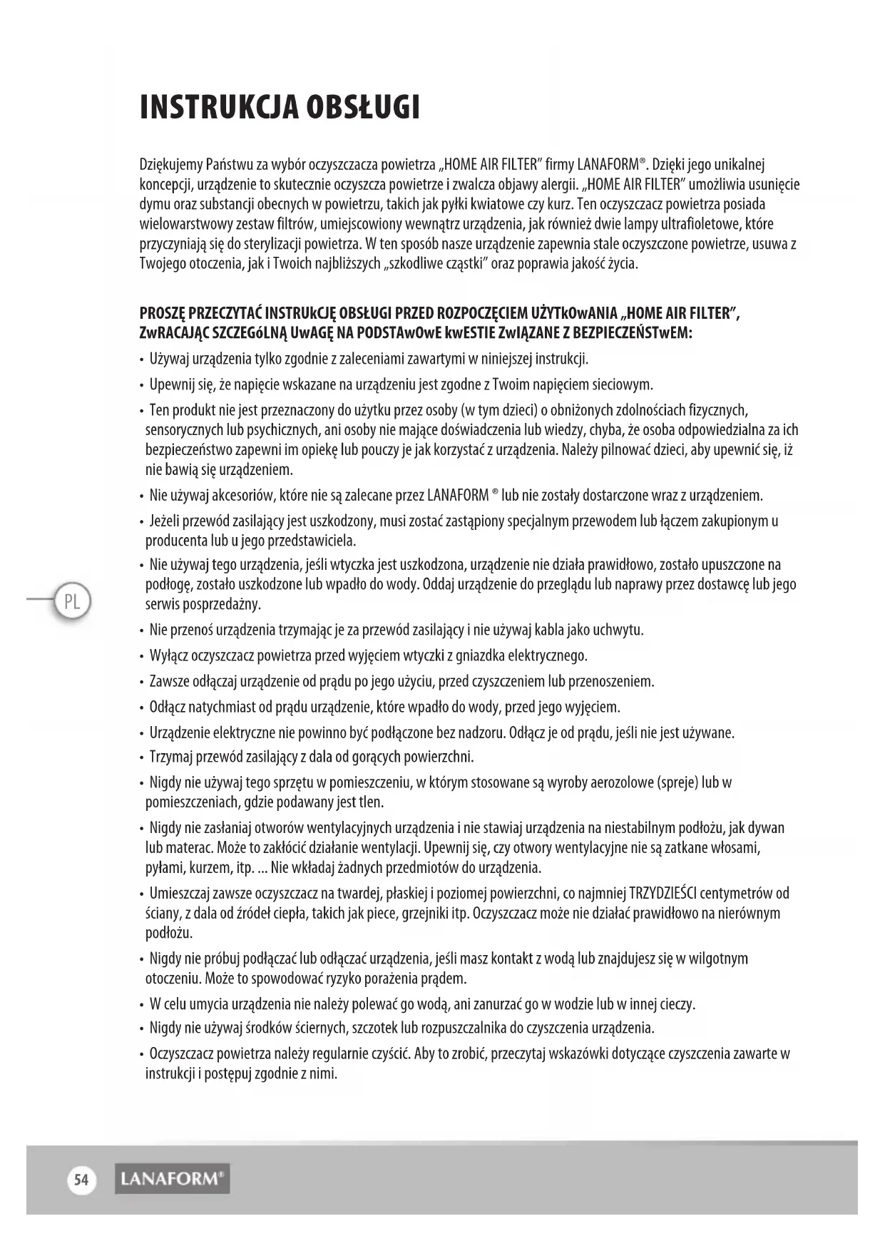 Dziękujemy Państwu za wybór oczyszczacza powietrza „HOME AIR FILTER” firmy LANAFORM®. Dzięki jego unikalnej koncepcji, urządzenie to skutecznie oczyszcza powietrze i zwalcza objawy alergii. „HOME AIR FILTER” umożliwia usunięcie dymu oraz substancji obecnych w powietrzu, takich jak pyłki kwiatowe czy kurz. Ten oczyszczacz powietrza posiada wielowarstwowy zestaw filtrów, umiejscowiony wewnątrz urządzenia, jak również dwie lampy ultrafioletowe, które przyczyniają się do sterylizacji powietrza. W ten sposób nasze urządzenie zapewnia stale oczyszczone powietrze, usuwa z Twojego otoczenia, jak i Twoich najbliższych „szkodliwe cząstki” oraz poprawia jakość życia. PROSZĘ PRZECZYTAĆ INSTRUkCJĘ OBSŁUGI PRZED ROZPOCZĘCIEM UŻYTkOwANIA „HOME AIR FILTER”, ZwRACAJĄC SZCZEGóLNĄ UwAGĘ NA PODSTAwOwE kwESTIE ZwIĄZANE Z BEZPIECZEŃSTwEM: