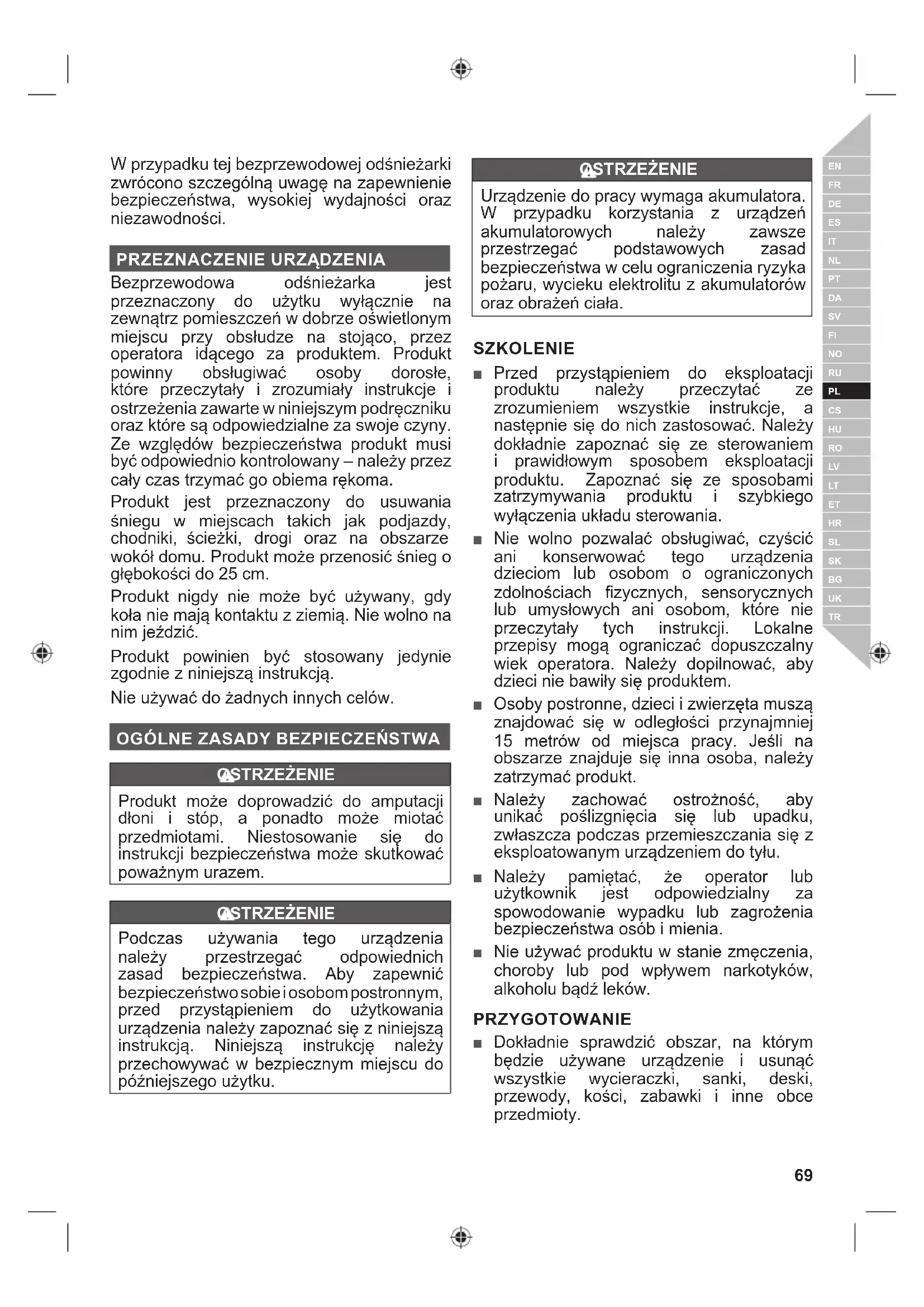 ● po uderzeniu obcego przedmiotu w celu sprawdzenia, czy produkt nie został uszkodzony ● Jeśli produkt zaczyna nienaturalnie wibrować, należy natychmiast rozpocząć poszukiwanie przyczyny. Wibracje to generalnie objaw usterki. ● przed czyszczeniem lub usuwaniem zablokowanego materiału ● przed pozostawieniem produktu bez nadzoru ● przed sprawdzeniem, konserwacją lub obsługą produktu ■ Nie odśnieżać w poprzek zasp. Zachować szczególną ostrożność podczas zmiany kierunku jazdy na pochyłym terenie. Nie należy próbować odśnieżać stromych zasp. ■ Nigdy nie należy obsługiwać produktu bez założonych odpowiednich osłon, płyt lub innych elementów zabezpieczających. ■ Pod żadnym pozorem nie kierować wylotu w stronę ludzi lub obszarów, w których może to doprowadzić do uszkodzenia majątku. Polecić dzieciom i innym osobom, aby się nie zbliżały. ■ Nie przeciążać maszyny, próbując zbyt szybko zbierać śnieg. ■ Nigdy używać produktu na śliskich powierzchniach przy wysokich prędkościach transportu. Spoglądać za siebie i zachować ostrożność podczas przemieszczania się z eksploatowanym urządzeniem do tyłu. ■ Gdy produkt jest transportowany lub gdy nie jest eksploatowany, dopływ napięcia do zbiornika/wirnika powinien być wyłączony. ■ Należy stosować wyłącznie oryginalne części zamienne, akcesoria oraz przystawki producenta. ■ Nie należy używać produktu w warunkach słabej widoczności lub przy słabym oświetleniu. Należy uważać, aby nie stracić równowagi, mocno trzymając uchwyty. Podczas pracy należy chodzić, nie wolno biegać. ■ Nigdy nie należy umieszczać produktu na powierzchni innej niż twarde, czyste podłoże, gdy silnik pracuje. Żwir, piasek oraz inny drobny materiał może dostać się do wlotu powietrza i może być odrzucony w stronę operatora lub przechodniów, powodując poważne urazy ciała. ■ Nigdy nie należy używać produktu w pobliżu szklanych powierzchni, pojazdów, okien lub drzwi bez odpowiedniego ustawienia kąta wyrzutu śniegu. Osoby postronne, a szczególnie dzieci i zwierzęta, należy trzymać z dala od miejsca pracy. ■ Nie wolno używać produktu, gdy występuje ryzyko burzy lub wyładowań atmosferycznych. ■ Nie używać urządzenia w atmosferze wybuchowej, np. w obecności łatwopalnych cieczy, gazów i pyłów. ■ Nie wychylać się nadmiernie. Sięganie zbyt daleko grozi utratą równowagi. ■ Posługując się urządzeniem, należy zachować czujność i kierować się zdrowym rozsądkiem. Chwila nieuwagi podczas obsługi urządzenia może spowodować poważne urazy ciała. OSTRZEŻENIE W przypadku upuszczenia produktu, narażenia go na silne uderzenie lub w przypadku zaobserwowania nadmiernych drgań, należy natychmiast wyłączyć urządzenie i sprawdzić, czy nie wykazuje ono uszkodzeń oraz ustalić przyczynę drgań. Wszelkie uszkodzone części muszą być odpowiednio naprawione lub wymienione w autoryzowanym punkcie serwisowym. AKUMULATOR — DODATKOWE