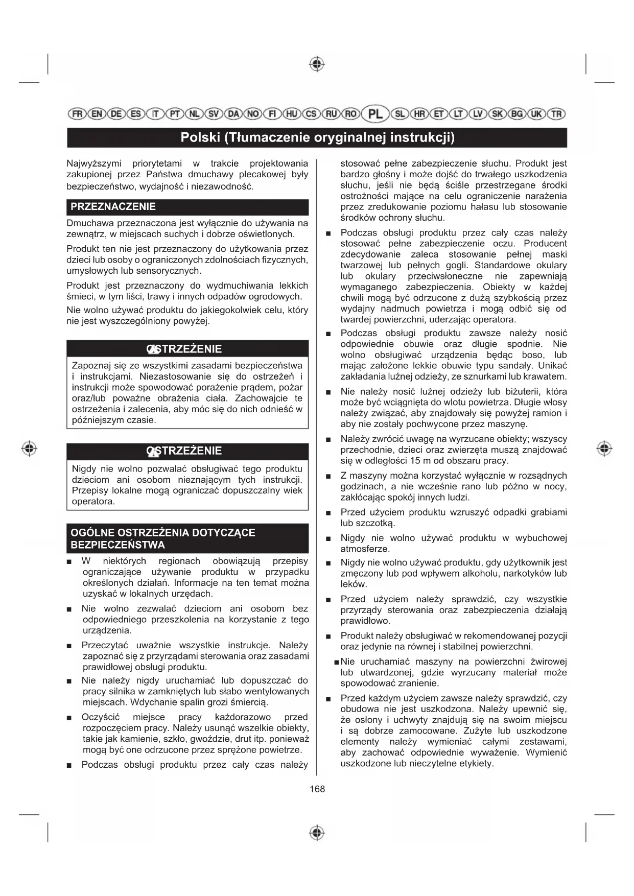 NOTE: ■ Întreţinerea trebuie îndeplinită mai frecvent atunci când produsul este folosit într-o zonă cu praf. ■ Chiar dacă sunt depăşite intervalele maxime indicate în tabel, întreţinerea va fi efectuatăîn continuare la intervalele de funcţionare specificate aici.168 Polski (Tłumaczenie oryginalnej instrukcji) Najwyższymi priorytetami w trakcie projektowania zakupionej przez Państwa dmuchawy plecakowej były bezpieczeństwo, wydajność i niezawodność. PRZEZNACZENIE Dmuchawa przeznaczona jest wyłącznie do używania na zewnątrz, w miejscach suchych i dobrze oświetlonych. Produkt ten nie jest przeznaczony do użytkowania przez dzieci lub osoby o ograniczonych zdolnościach fi zycznych, umysłowych lub sensorycznych. Produkt jest przeznaczony do wydmuchiwania lekkich śmieci, w tym liści, trawy i innych odpadów ogrodowych. Nie wolno używać produktu do jakiegokolwiek celu, który nie jest wyszczególniony powyżej. OSTRZEŻENIE Zapoznaj się ze wszystkimi zasadami bezpieczeństwa i instrukcjami. Niezastosowanie się do ostrzeżeń i instrukcji może spowodować porażenie prądem, pożar oraz/lub poważne obrażenia ciała. Zachowajcie te ostrzeżenia i zalecenia, aby móc się do nich odnieść w późniejszym czasie. OSTRZEŻENIE Nigdy nie wolno pozwalać obsługiwać tego produktu dzieciom ani osobom nieznającym tych instrukcji. Przepisy lokalne mogą ograniczać dopuszczalny wiek operatora.