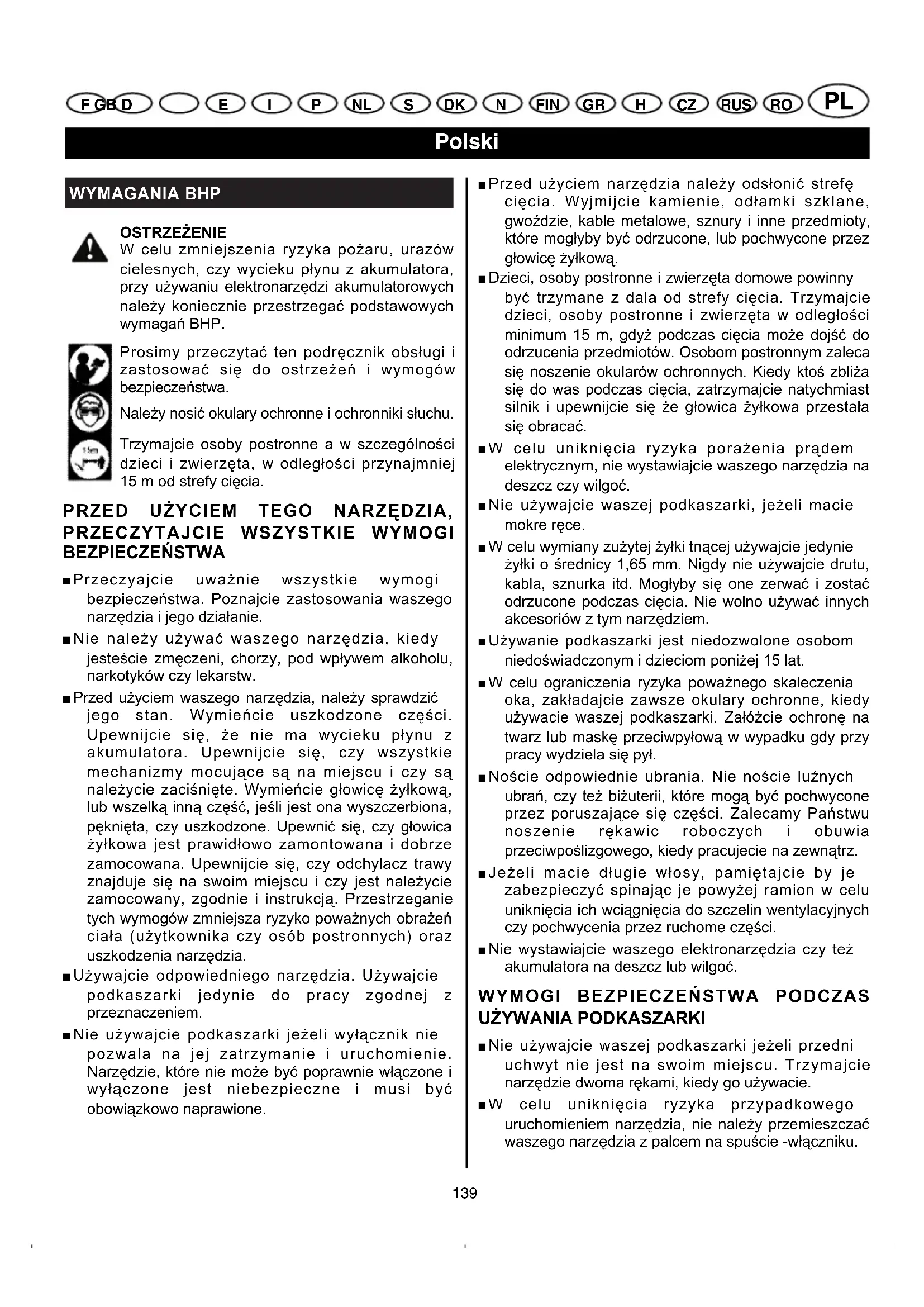 F GB D Română E I P NL S DK N FIN GR H CZ RUS PL CLT-1423P / 1823 P manual 24/11/04 11:57 Page 138WYMAGANIA BHP OSTRZEŻENIE W celu zmniejszenia ryzyka pożaru, urazów cielesnych, czy wycieku płynu z akumulatora, przy używaniu elektronarzędzi akumulatorowych należy koniecznie przestrzegać podstawowych wymagań BHP. Prosimy przeczytać ten podręcznik obsługi i zastosować się do ostrzeżeń i wymogów bezpieczeństwa. Należy nosić okulary ochronne i ochronniki słuchu. Trzymajcie osoby postronne a w szczególności dzieci i zwierzęta, w odległości przynajmniej 15 m od strefy cięcia. PRZED UŻYCIEM TEGO NARZĘDZIA,
