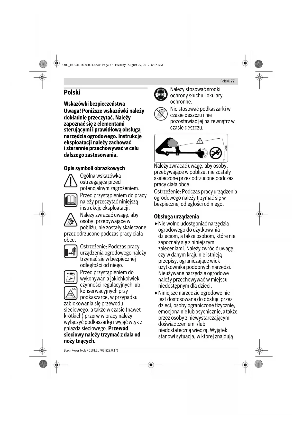 İşlemin amacı Şekil Sayfa Hata göstergesi Olası neden Giderilme yolu Misinalı çim biçme makinesi çalışmıyor Şebeke gerilimi yok Kontrol edin ve açın Şebeke prizi arızalı Başka bir priz kullanın Uzatma kablosunda hasar var Kabloyu kontrol edin ve hasarlı ise değiştirin Sigorta atmış durumda Sigortayı değiştirin Misinalı çim biçme makinesi kesintili olarak çalışıyor Uzatma kablosunda hasar var Kabloyu kontrol edin ve hasarlı ise değiştirin Müşteri servisine başvurun Bahçe aletinin içindeki kablo sisteminde hata var Müşteri servisine başvurun Bahçe aleti zorlanıyor Çimler çok yüksek Çimleri kademeli olarak kesin Bahçe aleti kesme yapmıyor Kesici elemanlar çok kısa/kırılmış Kesici elemanları değiştirin Kesici misina beslenmiyor Misina bobini boş Misina bobinini yenileyin Misina bobinde sarılmış Misina bobinini kontrol edin ve gerekiyorsa misinayı yeniden sarın Misina bobine geri çekiliyor Yere dokunulduğunda misina beslenmiyor Misina bobinini yeniden sarın (Bakınız: Şekil 11) Kesici misina kopuyor Misina bobinde sarılmış Misina bobinini kontrol edin ve gerekiyorsa misinayı yeniden sarın Misinalı çim biçme makinesinin hatalı kullanılıyor Sadece kesici misinanın ucuyla biçme yapın; taşlara, duvarlara veya başka sert nesnelere temastan kaçının. Bütün kesme çapında yararlanabilmek için kesici misinaları düzenli olarak besleyin. OBJ_BUCH-1800-004.book Page 75 Tuesday, August 29, 2017 9:04 AM76 | Türkçe F 016 L81 763 | (29.8.17) Bosch Power Tools Türkçe Bosch Sanayi ve Ticaret A.Ş. Elektrikli El Aletleri Aydınevler Mah. İnönü Cad. No: 20 Küçükyalı Ofis Park A Blok 34854 Maltepe-İstanbul Tel.: 444 80 10 Fax: +90 216 432 00 82 E-mail: iletisim@bosch.com.tr www.bosch.com.tr Bulsan Elektrik İstanbul Cad. Devrez Sok. İstanbul Çarşısı No: 48/29 İskitler Ankara Tel.: +90 312 3415142 Tel.: +90 312 3410302 Fax: +90 312 3410203 E-mail: bulsanbobinaj@gmail.com Faz Makine Bobinaj Cumhuriyet Mah. Sanayi Sitesi Motor İşleri Bölümü 663 Sk. No:18 Antalya Tel.: +90 242 3465876 Tel.: +90 242 3462885 Fax: +90 242 3341980 E-mail: info@fazmakina.com.tr Körfez Elektrik Karaağaç Mah. Sümerbank Cad. No:18/2 Erzincan Tel.: +90 446 2230959 Fax: +90 446 2240132 E-mail: bilgi@korfezelektrik.com.tr Değer İş Bobinaj İsmetpaşa Mah. İlk Belediye Başkan Cad. 5/C Şahinbey/Gaziantep Tel.: +90 342 2316432 Fax: +90 342 2305871 E-mail: degerisbobinaj@hotmail.com Tek Çözüm Bobinaj Küsget San.Sit.A Blok 11Nolu Cd.No:49/A Şehitkamil/Gaziantep Tel.: +90 342 2351507 Fax: +90 342 2351508 E-mail: cozumbobinaj2@hotmail.com Günşah Otomotiv Beylikdüzü Sanayi Sit. No: 210 Beylikdüzü İstanbul Tel.: +90 212 8720066 Fax: +90 212 8724111 E-mail: gunsahelektrik@ttmail.com Aygem 10021 Sok. No: 11 AOSB Çiğli İzmir Tel.: +90232 3768074 Fax: +90 232 3768075 E-mail: boschservis@aygem.com.tr Sezmen Bobinaj Ege İş Merkezi 1201/4 Sok. No: 4/B Yenişehir İzmir Tel.: +90 232 4571465 Tel.: +90 232 4584480 Fax: +90 232 4573719 E-mail: info@sezmenbobinaj.com.tr Ankaralı Elektrik Eski Sanayi Bölgesi 3. Cad. No: 43 Kocasinan Kayseri Tel.: +90 352 3364216 Tel.: +90 352 3206241 Fax: +90 352 3206242 E-mail: gunay@ankarali.com.tr Asal Bobinaj Eski Sanayi Sitesi Barbaros Cad. No: 24/C Samsun Tel.: +90 362 2289090 Fax: +90 362 2289090 E-mail: bpsasalbobinaj@hotmail.com Üstündağ Elektrikli Aletler Nusretiye Mah. Boyacılar Aralığı No: 9 Tekirdağ Tel.: +90 282 6512884 Fax: +90 282 6521966 E-mail: info@ustundagsogutma.com Marmara Elektrik Tersane cd. Zencefil Sok.No:6 Karaköy İstanbul Tel.: +90 212 2974320 Fax: +90 212 2507200 E-mail: info@marmarabps.com Bağrıaçıklar Oto Elektrik Motorlu Sanayi Çarşısı Doğruer Sk. No:9 Selçuklu Konya Tel.: +90 332 2354576 Tel.: +90 332 2331952 Fax: +90 332 2363492 E-mail: bagriaciklarotoelektrik@gmail.com Tasfiye Bahçe aletlerini evsel çöplerin içine atmayın! Sadece AB üyesi ülkeler için: Elektronik ve elektrikli aletlere ilişkin 2012/19/EU sıyılı Avrupa yönetmeliği ve bu yönetmeliğin ulusal hukuka uyarlanmış hükümleri uyarınca kullanım ömrünü tamamlamış elektronik ve elektrikli aletler ayrı ayrı toplanmak ve çevre dostu tasfiye amacıyla geri kazanım merkezlerine gönderilmek zorundadır. Değişiklik haklarımız saklıdır. OBJ_BUCH-1800-004.book Page 76 Tuesday, August 29, 2017 8:22 AMPolski | 77 Bosch Power Tools F 016 L81 763 | (29.8.17) Polski Wskazówki bezpieczeństwa Uwaga! Poniższe wskazówki należy dokładnie przeczytać. Należy zapoznać się z elementami sterującymi i prawidłową obsługą narzędzia ogrodowego. Instrukcję eksploatacji należy zachować i starannie przechowywać w celu dalszego zastosowania. Opis symboli obrazkowych Ogólna wskazówka ostrzegająca przed potencjalnym zagrożeniem. Przed przystąpieniem do pracy należy przeczytać niniejszą instrukcję eksploatacji. Należy zwracać uwagę, aby osoby, przebywające w pobliżu, nie zostały skaleczone przez odrzucone podczas pracy ciała obce. Ostrzeżenie: Podczas pracy urządzenia ogrodowego należy trzymać się w bezpiecznej odległości od niego. Przed przystąpieniem do wykonywania jakichkolwiek czynności regulacyjnych lub konserwacyjnych przy podkaszarce, w przypadku zablokowania się przewodu sieciowego, a także w czasie (nawet krótkich) przerw w pracy należy wyłączyć podkaszarkę i wyjąć wtyk z gniazda sieciowego. Przewód sieciowy należy trzymać z dala od noży tnących. Należy stosować środki ochrony słuchu i okulary ochronne. Nie stosować podkaszarki w czasie deszczu i nie pozostawiać jej na zewnątrz w czasie deszczu. Należy zwracać uwagę, aby osoby, przebywające w pobliżu, nie zostały skaleczone przez odrzucone podczas pracy ciała obce. Ostrzeżenie: Podczas pracy urządzenia ogrodowego należy trzymać się w bezpiecznej odległości od niego. Obsługa urządzenia Nie wolno udostępniać narzędzia ogrodowego 