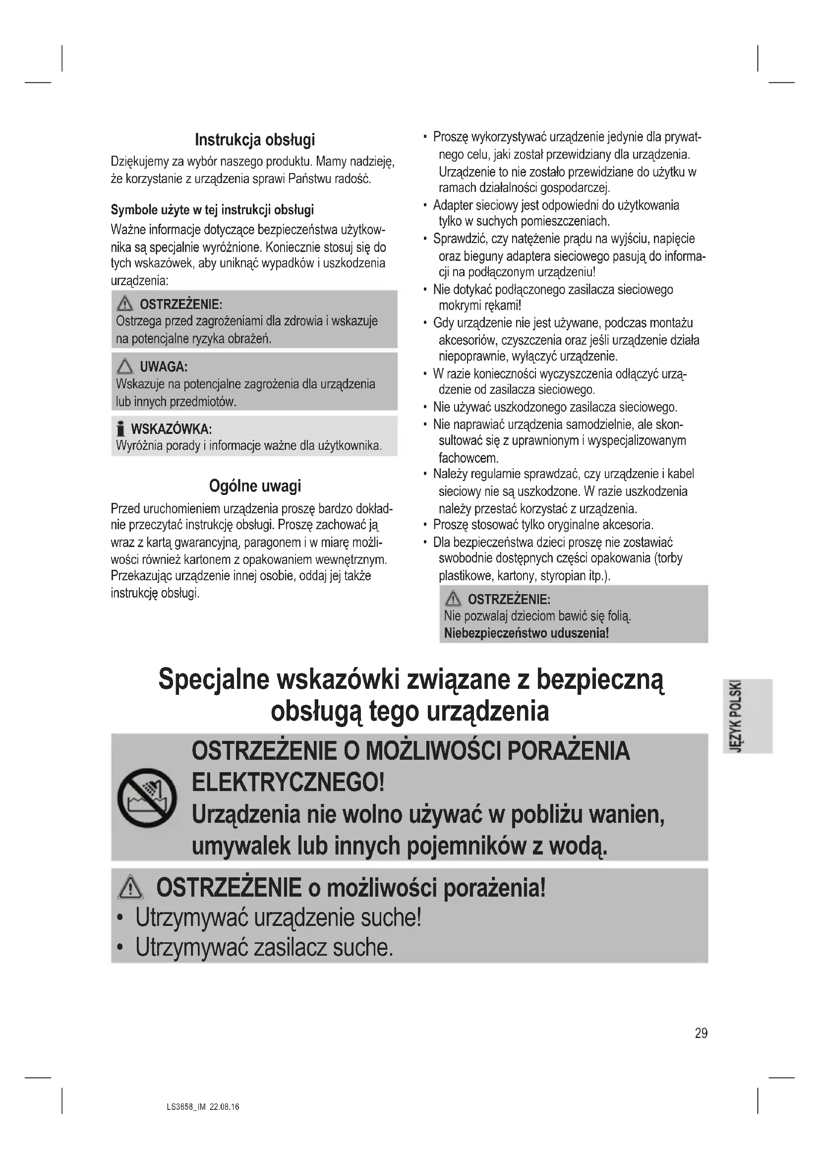 - Utrzymywać urzadzeniaicine suche!