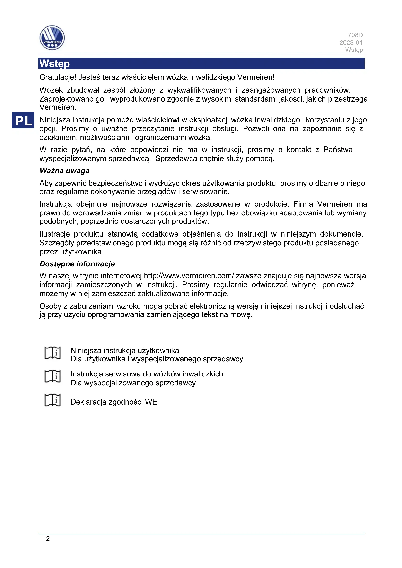 Wstęp Gratulacje! Jesteś teraz właścicielem wózka inwalidzkiego Vermeiren! Wózek zbudował zespół złożony z wykwalifikowanych i zaangażowanych pracowników. Zaprojektowano go i wyprodukowano zgodnie z wysokimi standardami jakości, jakich przestrzega Vermeiren. Niniejsza instrukcja pomoże właścicielowi w eksploatacji wózka inwalidzkiego i korzystaniu z jego opcji. Prosimy o uważne przeczytanie instrukcji obsługi. Pozwoli ona na zapoznanie się z działaniem, możliwościami i ograniczeniami wózka. W razie pytań, na które odpowiedzi nie ma w instrukcji, prosimy o kontakt z Państwa wyspecjalizowanym sprzedawcą. Sprzedawca chętnie służy pomocą. Ważna uwaga Aby zapewnić bezpieczeństwo i wydłużyć okres użytkowania produktu, prosimy o dbanie o niego oraz regularne dokonywanie przeglądów i serwisowanie. Instrukcja obejmuje najnowsze rozwiązania zastosowane w produkcie. Firma Vermeiren ma prawo do wprowadzania zmian w produktach tego typu bez obowiązku adaptowania lub wymiany podobnych, poprzednio dostarczonych produktów. Ilustracje produktu stanowią dodatkowe objaśnienia do instrukcji w niniejszym dokumencie. Szczegóły przedstawionego produktu mogą się różnić od rzeczywistego produktu posiadanego przez użytkownika. Dostępne informacje W naszej witrynie internetowej http://www.vermeiren.com/ zawsze znajduje się najnowsza wersja informacji zamieszczonych w instrukcji. Prosimy regularnie odwiedzać witrynę, ponieważ możemy w niej zamieszczać zaktualizowane informacje. Osoby z zaburzeniami wzroku mogą pobrać elektroniczną wersję niniejszej instrukcji i odsłuchać ją przy użyciu oprogramowania zamieniającego tekst na mowę.