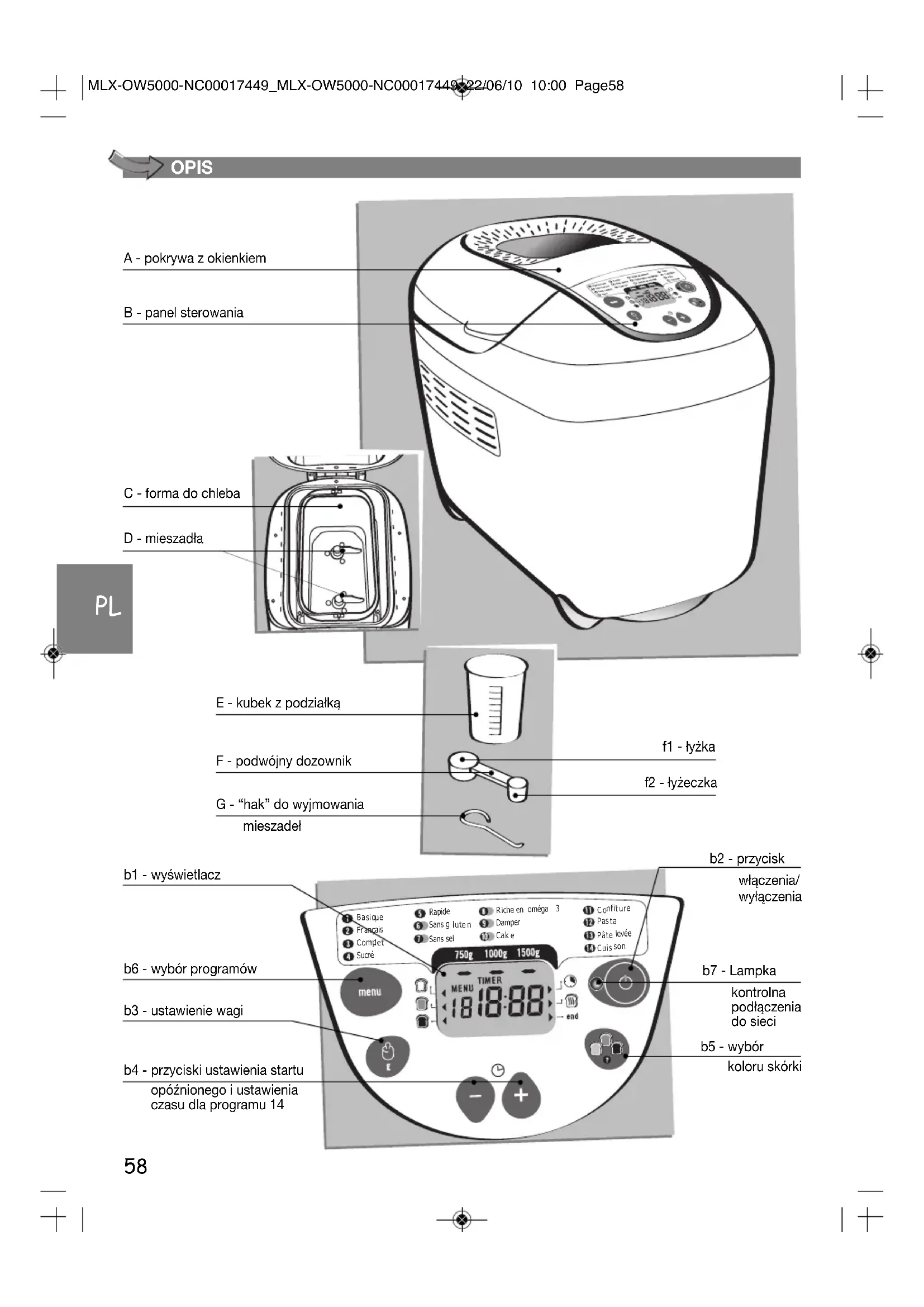 Pâte levée Cuis son A - pokrywa z okienkiem b6 - wybór programów b4 - przyciski ustawienia startu opóźnionego i ustawienia czasu dla programu 14 b1 - wyświetlacz b3 - ustawienie wagi b2 - przycisk włączenia/ wyłączenia b7 - Lampka kontrolna podłączenia do sieci b5 - wybór koloru skórki B - panel sterowania C - forma do chleba D - mieszadła E - kubek z podziałką F - podwójny dozownik f1 - łyżka f2 - łyżeczka G - “hak” do wyjmowania mieszadeł MLX-OW5000-NC00017449_MLX-OW5000-NC00017449 22/06/10 10:00 Page5859