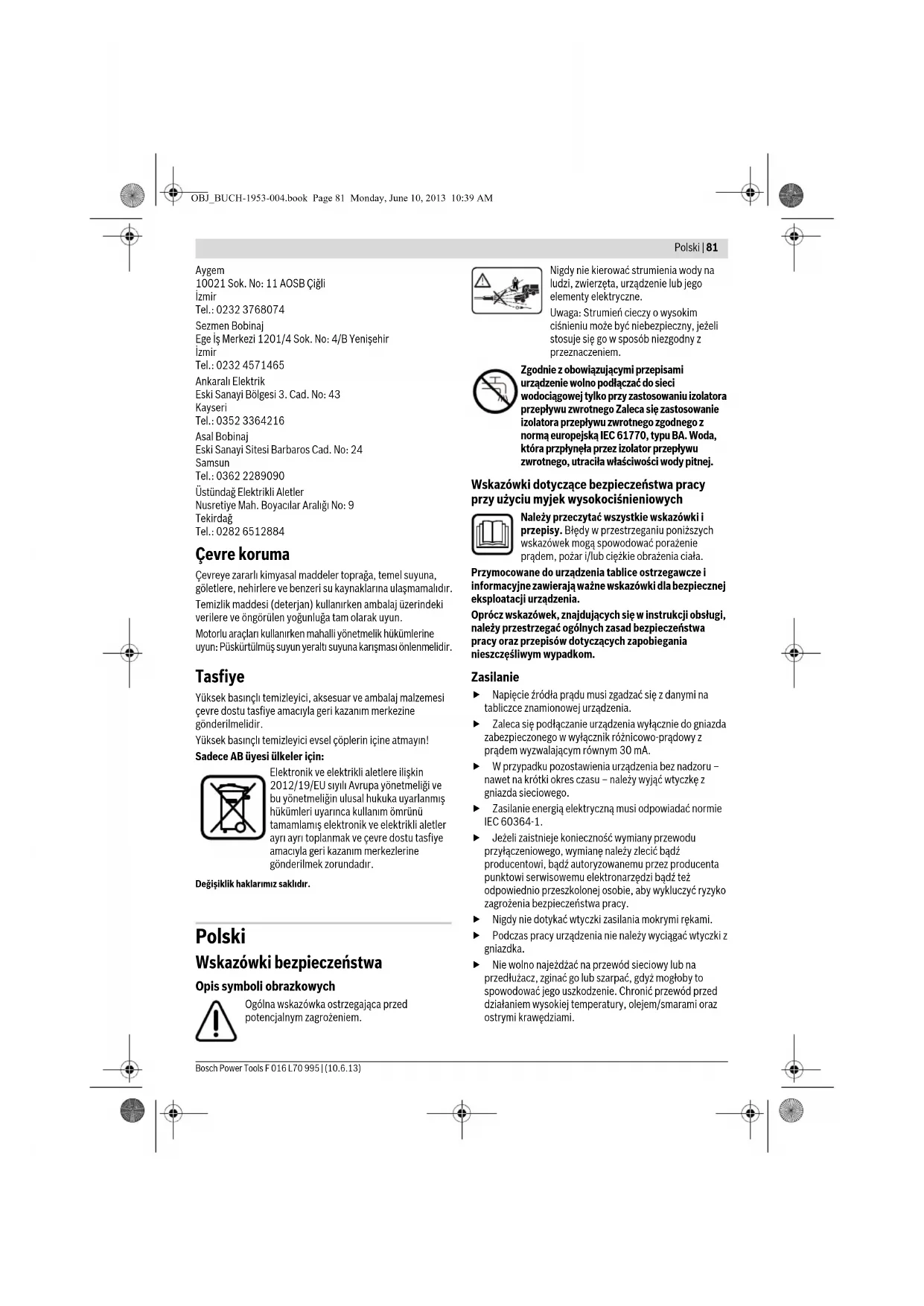 Denizli Tel.: 0258 2620666 Bulut Elektrik İstasyon Cad. No: 52/B Devlet Tiyatrosu Karşısı Elazığ Tel.: 0424 2183559 Körfez Elektrik Sanayi Çarşısı 770 Sok. No: 71 Erzincan Tel.: 0446 2230959 Ege Elektrik İnönü Bulvaro No: 135 Muğla Makasarası Fethiye Fethiye Tel.: 0252 6145701 Değer İş Bobinaj İsmetpaşa Mah. İlk Belediye Başkan Cad. 5/C Şahinbey Gaziantep Tel.: 0342 2316432 Çözüm Bobinaj İsmetpaşa Mah. Eski Şahinbey Belediyesi altı Cad. No: 3/C Gaziantep Tel.: 0342 2319500 Onarım Bobinaj Raifpaşa Cad. No: 67 İskenderun Hatay Tel.: 0326 6137546 Günşah Otomotiv Beylikdüzü Sanayi Sit. No: 210 Beylikdüzü İstanbul Tel.: 0212 8720066 Temizlik maddesi emilmiyor Ayarlanır meme yüksek basınç konumunda Köpük ayarını 3/1 memede kullanın Temizlik maddesi çok kıvamlı Su ile inceltin Yüksek basınç hortumu uzatılmış. Orijinal hortumu bağlayın. Temizlik maddesi dolaşımında kalıntılar ve daralma var Temiz su ile durulayarak daralmayı giderin. Sorun devam ederse Bosch servis merkezine başvurun. Hata göstergesi Olası neden Giderilme yolu OBJ_BUCH-1953-004.book Page 80 Monday, June 10, 2013 10:39 AMPolski | 81 Bosch Power Tools F 016 L70 995 | (10.6.13) Aygem 10021 Sok. No: 11 AOSB Çiğli İzmir Tel.: 0232 3768074 Sezmen Bobinaj Ege İş Merkezi 1201/4 Sok. No: 4/B Yenişehir İzmir Tel.: 0232 4571465 Ankaralı Elektrik Eski Sanayi Bölgesi 3. Cad. No: 43 Kayseri Tel.: 0352 3364216 Asal Bobinaj Eski Sanayi Sitesi Barbaros Cad. No: 24 Samsun Tel.: 0362 2289090 Üstündağ Elektrikli Aletler Nusretiye Mah. Boyacılar Aralığı No: 9 Tekirdağ Tel.: 0282 6512884 Çevre koruma Çevreye zararlı kimyasal maddeler toprağa, temel suyuna, göletlere, nehirlere ve benzeri su kaynaklarına ulaşmamalıdır. Temizlik maddesi (deterjan) kullanırken ambalaj üzerindeki verilere ve öngörülen yoğunluğa tam olarak uyun. Motorlu araçları kullanırken mahalli yönetmelik hükümlerine uyun: Püskürtülmüş suyun yeraltı suyuna karışması önlenmelidir. Tasfiye Yüksek basınçlı temizleyici, aksesuar ve ambalaj malzemesi çevre dostu tasfiye amacıyla geri kazanım merkezine gönderilmelidir. Yüksek basınçlı temizleyici evsel çöplerin içine atmayın! Sadece AB üyesi ülkeler için: Elektronik ve elektrikli aletlere ilişkin 2012/19/EU sıyılı Avrupa yönetmeliği ve bu yönetmeliğin ulusal hukuka uyarlanmış hükümleri uyarınca kullanım ömrünü tamamlamış elektronik ve elektrikli aletler ayrı ayrı toplanmak ve çevre dostu tasfiye amacıyla geri kazanım merkezlerine gönderilmek zorundadır. Değişiklik haklarımız saklıdır. Polski Wskazówki bezpieczeństwa Opis symboli obrazkowych Ogólna wskazówka ostrzegająca przed potencjalnym zagrożeniem. Nigdy nie kierować strumienia wody na ludzi, zwierzęta, urządzenie lub jego elementy elektryczne. Uwaga: Strumień cieczy o wysokim ciśnieniu może być niebezpieczny, jeżeli stosuje się go w sposób niezgodny z przeznaczeniem. Zgodnie z obowiązującymi przepisami urządzenie wolno podłączać do sieci wodociągowej tylko przy zastosowaniu izolatora przepływu zwrotnego Zaleca się zastosowanie izolatora przepływu zwrotnego zgodnego z normą europejską IEC 61770, typu BA. Woda, która przpłynęła przez izolator przepływu zwrotnego, utraciła właściwości wody pitnej. Wskazówki dotyczące bezpieczeństwa pracy przy użyciu myjek wysokociśnieniowych Należy przeczytać wszystkie wskazówki i przepisy. Błędy w przestrzeganiu poniższych wskazówek mogą spowodować porażenie prądem, pożar i/lub ciężkie obrażenia ciała. Przymocowane do urządzenia tablice ostrzegawcze i informacyjne zawierają ważne wskazówki dla bezpiecznej eksploatacji urządzenia. Oprócz wskazówek, znajdujących się w instrukcji obsługi, należy przestrzegać ogólnych zasad bezpieczeństwa pracy oraz przepisów dotyczących zapobiegania nieszczęśliwym wypadkom. Zasilanie Napięcie źródła prądu musi zgadzać się z danymi na tabliczce znamionowej urządzenia. Zaleca się podłączanie urządzenia wyłącznie do gniazda zabezpieczonego w wyłącznik różnicowo-prądowy z prądem wyzwalającym równym 30 mA. W przypadku pozostawienia urządzenia bez nadzoru – nawet na krótki okres czasu – należy wyjąć wtyczkę z gniazda sieciowego. Zasilanie energią elektryczną musi odpowiadać normie IEC 60364-1. Jeżeli zaistnieje konieczność wymiany przewodu przyłączeniowego, wymianę należy zlecić bądź producentowi, bądź autoryzowanemu przez producenta punktowi serwisowemu elektronarzędzi bądź też odpowiednio przeszkolonej osobie, aby wykluczyć ryzyko zagrożenia bezpieczeństwa pracy. Nigdy nie dotykać wtyczki zasilania mokrymi rękami. Podczas pracy urządzenia nie należy wyciągać wtyczki z gniazdka. Nie wolno najeżdżać na przewód sieciowy lub na przedłużacz, zginać go lub szarpać, gdyż mogłoby to spowodować jego uszkodzenie. Chronić przewód przed działaniem wysokiej temperatury, olejem/smarami oraz ostrymi krawędziami. OBJ_BUCH-1953-004.book Page 81 Monday, June 10, 2013 10:39 AM82 | Polski F 016 L70 995 | (10.6.13) Bosch Power Tools Nie wolno korzystać z urządzenia, jeśli któryś przewód przyłączeniowy lub ważne części urządzenia, takie jak wąż wysokociśnieniowy, pistolet natryskowy lub urządzenia zabezpieczające są uszkodzone. Uwaga: Przedłużacze niezgodne z przepisami mogą stanowić zagrożenie. Stosując przedłużacz, należy upewnić się, że wtyczka i łącznik wtykowy mają wodoszczelną budowę. Przedłużacz musi mieć przekrój zgodny z danymi podanymi w instrukcji obsługi i musi być zaopatrzony w zabezpieczenie przez rozpryskami wody. Połączenie wtykowe przewodu z przedłużaczem nie może leżeć w wodzie. W razie wymiany złącz zasilania sieciowego lub kabla przedłużającego, należy upewnić się, że nowe złącza są bryzgoszczelne i mają odpowiednią wytrzymałość mechaniczną. Podłącz