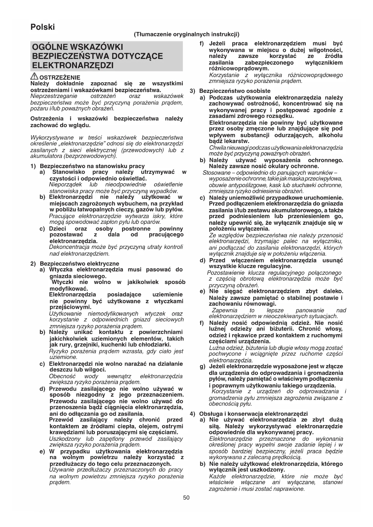 ELEKTRONARZĘDZI OSTRZEŻENIE Należy dokładnie zapoznać się ze wszystkimi ostrzeżeniami i wskazówkami bezpieczeństwa. Nieprzestrzeganie ostrzeżeń oraz wskazówek bezpieczeństwa może być przyczyną porażenia prądem, pożaru i/lub poważnych obrażeń. Ostrzeżenia i wskazówki bezpieczeństwa należy zachować do wglądu. Wykorzystywane w treści wskazówek bezpieczeństwa określenie „elektronarzędzie” odnosi się do elektronarzędzi zasilanych z sieci elektrycznej (przewodowych) lub z akumulatora (bezprzewodowych).