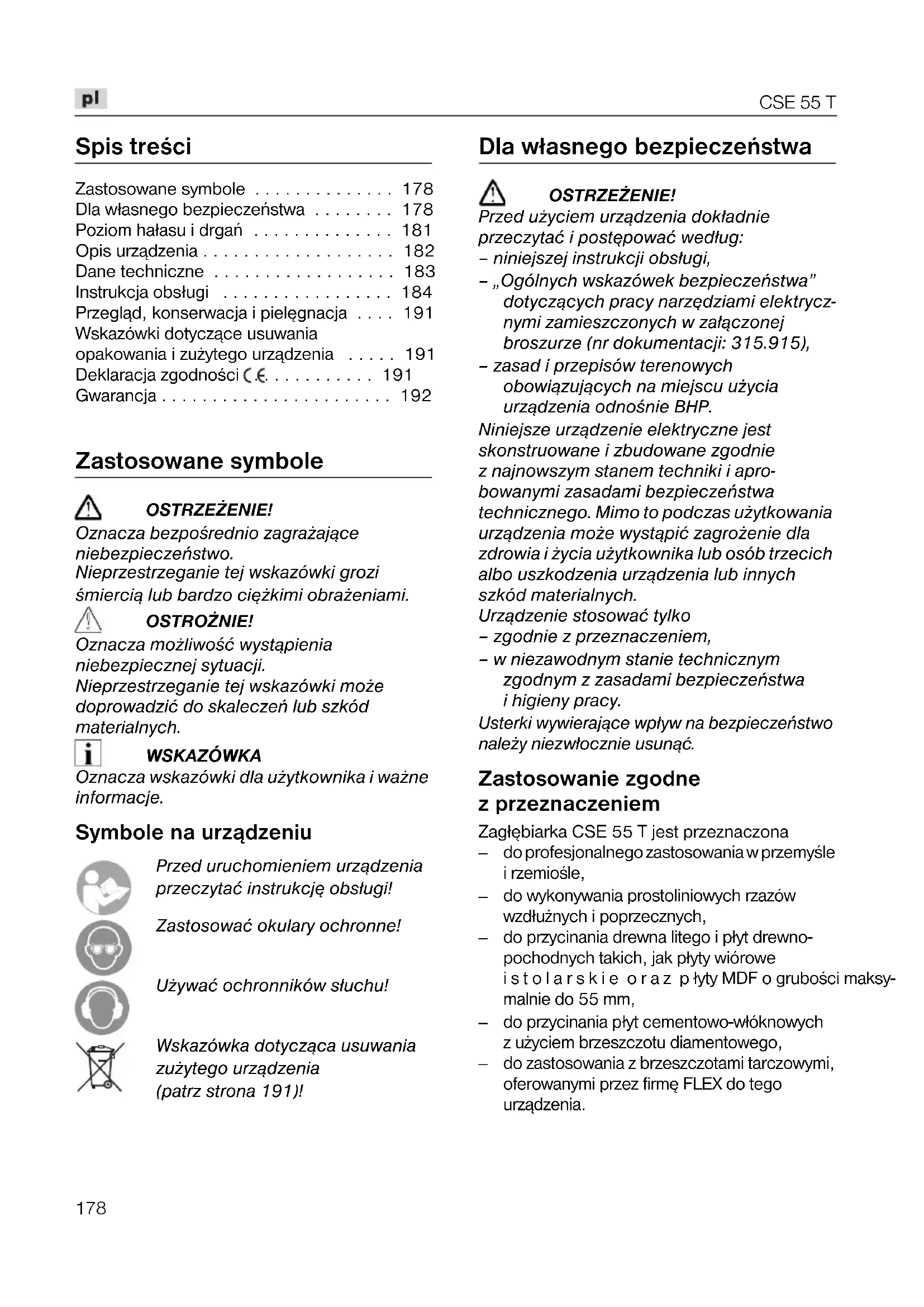 Gwarancja Przy zakupie nowego urz¹dzenia firma FLEX udziela 2 lata gwarancji producenta, poczynaj¹c od daty nabycia przez u¿ytkownika. Gwarancj¹ objête s¹ tylko wady urz¹dzenia wynikaj¹ce z błêdów materiałowych i/lub produkcyjnych, oraz niespełnienia zapewnionych właœciwoœci. W przypadku wyst¹pienia roszczenia gwarancyjnego nale¿y doł¹czyć oryginalny dowód sprzeda¿y z dat¹ zakupu Naprawy mo¿e dokonać wył¹cznie warsztat lub serwis posiadaj¹cy autoryzacjê firmy FLEX. Prawo do roszczeñ gwarancyjnych przysługuje tylko w przypadku u¿ycia urz¹dzenia zgodnie z jego przeznaczeniem. Gwarancja nie obejmuje w szczególnoœci zu¿ycia wynikaj¹cego z eksploatacji, usterek spowodowanych niewłaœciw¹ obsług¹ i u¿ytkowaniem, czêœciowo lub całkowicie zdemontowanych urz¹dzeñ, jak równie¿ szkód spowodowanych przeci¹¿eniem urz¹dzenia, u¿yciem niedopuszczonych, uszkodzonych, lub niewłaœciwie zastosowanych narzêdzi, szkód spowodowanych przez maszynê na narzêdziach lub materiale obrabianym, szkód spowodowanych przez u¿ycie siły, oraz nastêpstw niewłaœciwych lub niewystarczaj¹cych przegl¹dów i konserwacji wykonywanych przez u¿ytkownika lub osoby trzecie, uszkodzeñ spowodowanych działaniami zewnêtrznymi lub ciałami obcymi, jak np. piasek, kamienie, jak równie¿ szkód spowodowanych nieprzestrzeganiem niniejszej instrukcji u¿ytkowania i obsługi, jak np. podł¹czenie do Ÿródła pr¹du oniewłaœciwym napiêciu lub rodzaju pr¹du. Narzêdzia i wyposa¿enie dodatkowe objête s¹ gwarancj¹ tylko wtedy, je¿eli zastosowane zostały z maszyn¹, dla której takie u¿ycie jest przewidziane lub dopuszczone. Wył¹czenie z odpowiedzialnoœci Producent nie odpowiada za szkody i stracone zyski spowodowane przerw¹ w działalnoœci gospodarczej zakładu, której przyczyn¹ był nasz wyrób lub niemo¿liwoœć jego zastosowania. Producent i jego przedstawiciel nie odpowiadaj¹ za szkody spowodowane niewłaœciwym u¿yciem urz¹dzenia lub powstałe przy u¿yciu urz¹dzenia w powi¹zaniu z wyrobami innych producentów.CSE 55 T