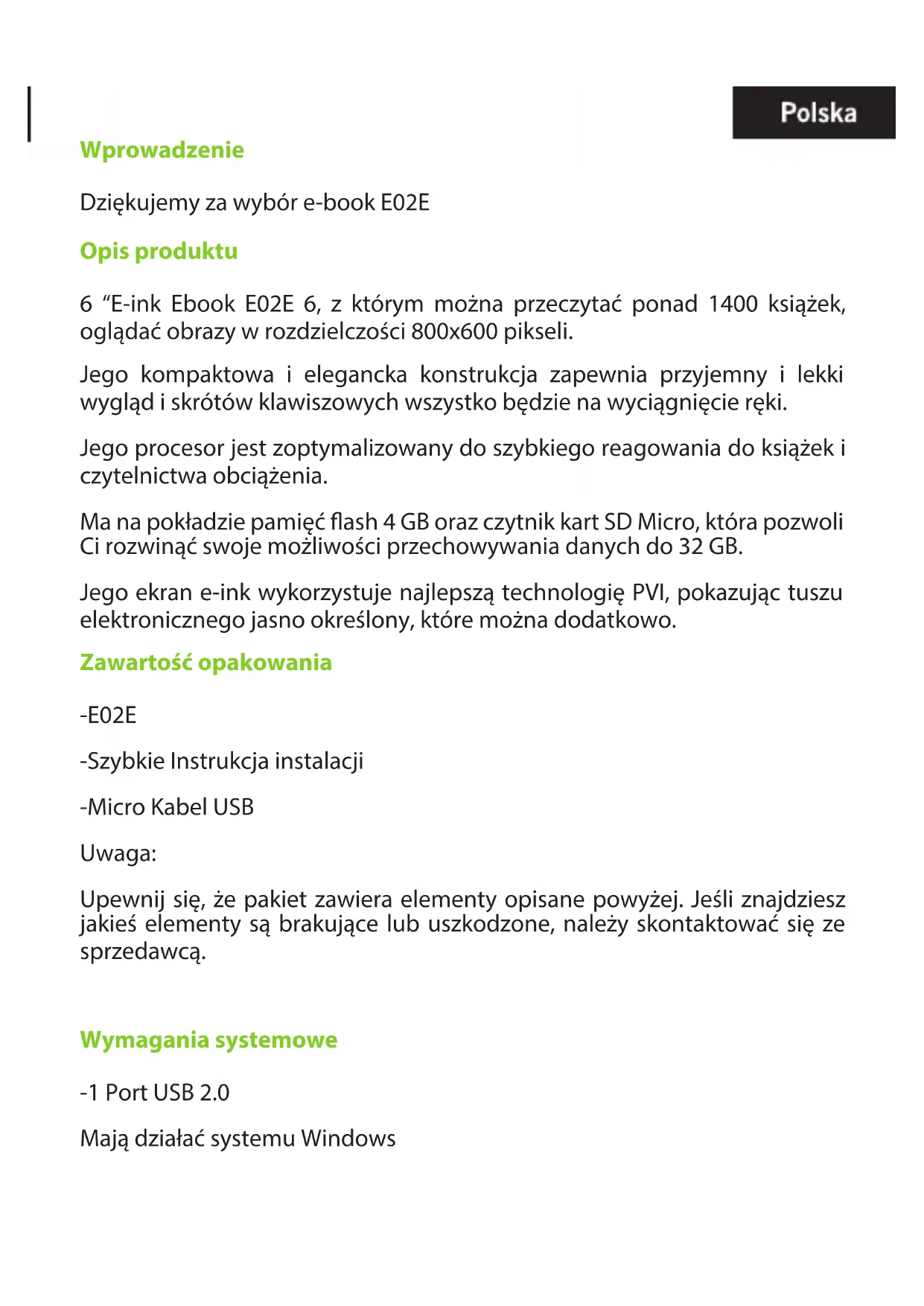 Vanuit het hoofdmenu gebruikershandleiding en druk op Enter. De eBook gebruikershandleiding openen Technische Ondersteuning Voor meer informatie over dit product kunt u terecht op onze support sectie op onze website www.billowtechnology.com of stuur een e-mail naar Support@billowtechnology.comNederlands Wprowadzenie Dziękujemy za wybór e-book E02E Opis produktu 6 “E-ink Ebook E02E 6, z którym można przeczytać ponad 1400 książek, oglądać obrazy w rozdzielczości 800x600 pikseli. Jego kompaktowa i elegancka konstrukcja zapewnia przyjemny i lekki wygląd i skrótów klawiszowych wszystko będzie na wyciągnięcie ręki. Jego procesor jest zoptymalizowany do szybkiego reagowania do książek i czytelnictwa obciążenia. Ma na pokładzie pamięć ash 4 GB oraz czytnik kart SD Micro, która pozwoli Ci rozwinąć swoje możliwości przechowywania danych do 32 GB. Jego ekran e-ink wykorzystuje najlepszą technologię PVI, pokazując tuszu elektronicznego jasno określony, które można dodatkowo. Zawartość opakowania -E02E -Szybkie Instrukcja instalacji -Micro Kabel USB Uwaga: Upewnij się, że pakiet zawiera elementy opisane powyżej. Jeśli znajdziesz jakieś elementy są brakujące lub uszkodzone, należy skontaktować się ze sprzedawcą. Wymagania systemowe -1 Port USB 2.0 Mają działać systemu WindowsOpis części