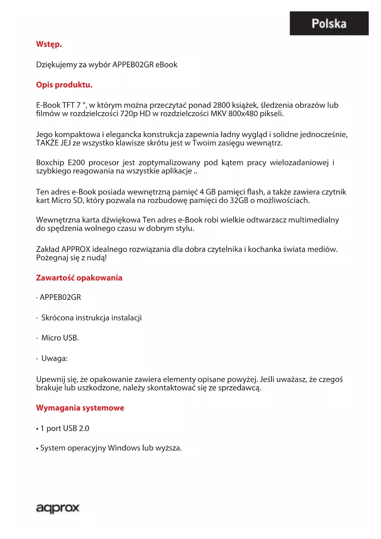 APPEB02GR - Czytnik e-booków Approx - Bezpłatna instrukcja obsługi