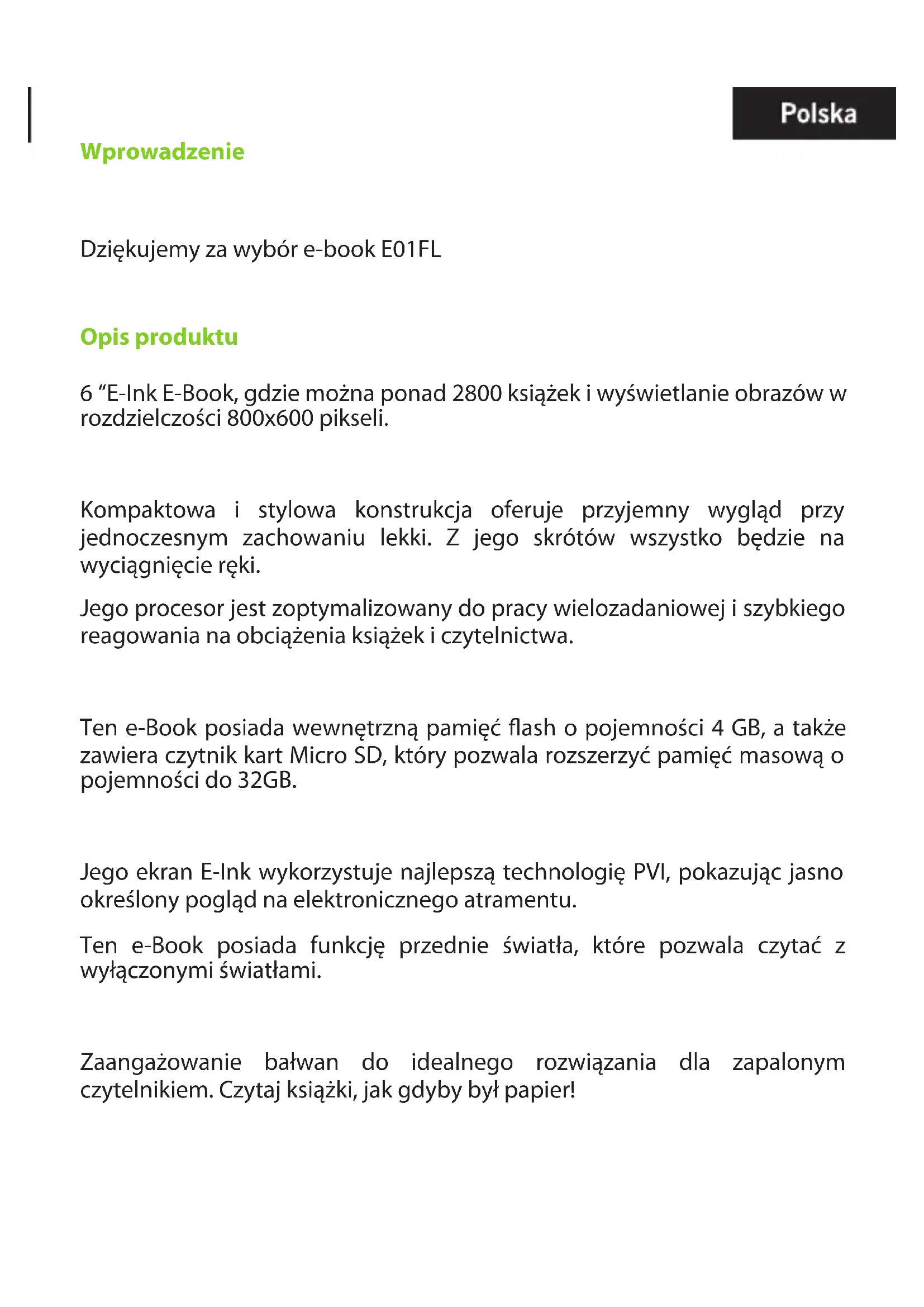 Vanuit het hoofdmenu, selecteer gebruikershandleiding en druk op Enter. De eBook gebruikershandleiding openen Technische ondersteuning Voor meer informatie over dit product kunt u terecht op onze support sectie op onze website www.billowtechnology.com of stuur een e-mail naar Support@billowtechnology.comNederlands Wprowadzenie Dziękujemy za wybór e-book E01FL Opis produktu 6 “E-Ink E-Book, gdzie można ponad 2800 książek i wyświetlanie obrazów w rozdzielczości 800x600 pikseli. Kompaktowa i stylowa konstrukcja oferuje przyjemny wygląd przy jednoczesnym zachowaniu lekki. Z jego skrótów wszystko będzie na wyciągnięcie ręki. Jego procesor jest zoptymalizowany do pracy wielozadaniowej i szybkiego reagowania na obciążenia książek i czytelnictwa. Ten e-Book posiada wewnętrzną pamięć ash o pojemności 4 GB, a także zawiera czytnik kart Micro SD, który pozwala rozszerzyć pamięć masową o pojemności do 32GB. Jego ekran E-Ink wykorzystuje najlepszą technologię PVI, pokazując jasno określony pogląd na elektronicznego atramentu. Ten e-Book posiada funkcję przednie światła, które pozwala czytać z wyłączonymi światłami. Zaangażowanie bałwan do idealnego rozwiązania dla zapalonym czytelnikiem. Czytaj książki, jak gdyby był papier!Zawartość opakowania -E01FL -Instrukcja szybkiej instalacji Kabel mini USB Uwaga: Upewnij się, że pakiet zawiera elementy opisane powyżej. Jeśli uważasz, brakuje jakichkolwiek elementów lub uszkodzony, należy skontaktować się ze sprzedawcą. Wymagania systemowe -1 Port USB 2.0 -System operacyjny Windows Opis części
