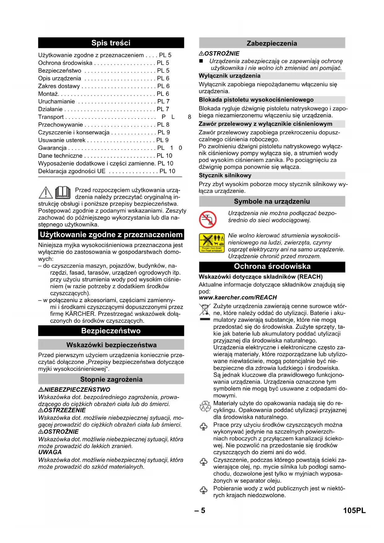 92 dB(A) Pridržujemo si pravico do tehničnih sprememb. Pribor in nadomestni deli ES-izjava o skladnosti Proizvod: visokotlačni čistilec Tip: 1.324-xxx Zadevne ES-direktive: 2000/14/ES 2014/30/EU 2006/42/ES (+2009/127/ES) 2011/65/ЕU Uporabljene usklajene norme: EN 50581 EN 55014–1: 2006+A1: 2009+A2: 2011 EN 55014–2: 1997+A1: 2001+A2: 2008 EN 60335–1 EN 60335–2–79 EN 61000–3–2: 2014 EN 61000–3–3: 2013 EN 62233: 2008 Postopek ocenjevanja skladnosti: 2000/14/ES: Priloga V Raven zvočne moči dB(A) Izmerjeno: 89 Zajamčeno: 92 Winnenden, 2016/01/01 CEO Head of Approbation 104 SL– 5 Przed rozpoczęciem użytkowania urzą- dzenia należy przeczytać oryginalną in- strukcję obsługi i poniższe przepisy bezpieczeństwa. Postępować zgodnie z podanymi wskazaniami. Zeszyty zachować do późniejszego wykorzystania lub dla na- stępnego użytkownika. Niniejsza myjka wysokociśnieniowa przeznaczona jest wyłącznie do zastosowania w gospodarstwach domo- wych: – do czyszczenia maszyn, pojazdów, budynków, na- rzędzi, fasad, tarasów, urządzeń ogrodowych itp. przy użyciu strumienia wody pod wysokim ciśnie- niem (w razie potrzeby z dodatkiem środków czyszczących). – w połączeniu z akcesoriami, częściami zamienny- mi i środkami czyszczącymi dopuszczonymi przez firmę KÄRCHER. Przestrzegać wskazówek dołą- czonych do środków czyszczących. Przed pierwszym użyciem urządzenia koniecznie prze- czytać dołączone „Przepisy bezpieczeństwa dotyczące myjki wysokociśnieniowej“. NIEBEZPIECZEŃSTWO Wskazówka dot. bezpośredniego zagrożenia, prowa- dzącego do ciężkich obrażeń ciała lub do śmierci. 몇 OSTRZEŻENIE Wskazówka dot. możliwie niebezpiecznej sytuacji, mo- gącej prowadzić do ciężkich obrażeń ciała lub śmierci. 몇 OSTROŻNIE Wskazówka dot. możliwie niebezpiecznej sytuacji, która może prowadzić do lekkich zranień. UWAGA Wskazówka dot. możliwie niebezpiecznej sytuacji, która może prowadzić do szkód materialnych. 몇 OSTROŻNIE Urządzenia zabezpieczają ce zapewniają ochronę użytkownika i nie wolno ich zmieniać ani pomijać. Wyłącznik zapobiega niepożądanemu włączeniu się urządzenia. Blokada rygluje dźwignię pistoletu natryskowego i zapo- biega niezamierzonemu włączeniu się urządzenia. Zawór przelewowy zapobiega przekroczeniu dopusz- czalnego ciśnienia roboczego. Po zwolnieniu dźwigni pistoletu natryskowego wyłącz- nik ciśnieniowy pompy wyłącza się, a strumień wody pod wysokim ciśnieniem zanika. Po pociągnięciu za dźwignię pompa ponownie się włącza. Przy zbyt wysokim poborze mocy stycznik silnikowy wy- łącza urządzenie. Wskazówki dotyczące składników (REACH) Aktualne informacje dotyczące składników znajdują się pod: www.kaercher.com/REACH Spis treści Użytkowanie zgodne z przeznaczeniem . . . . PL 5 Ochrona środowiska . . . . . . . . . . . . . . . . . . . PL 5 Bezpieczeństwo . . . . . . . . . . . . . . . . . . . . . . PL 5 Opis urządzenia . . . . . . . . . . . . . . . . . . . . . . PL 6 Zakres dostawy . . . . . . . . . . . . . . . . . . . . . . . PL 6 Montaż. . . . . . . . . . . . . . . . . . . . . . . . . . . . . . PL 6 Uruchamianie . . . . . . . . . . . . . . . . . . . . . . . . PL 7 Działanie . . . . . . . . . . . . . . . . . . . . . . . . . . . . PL 7 Transport . . . . . . . . . . . . . . . . . . . . . . . . . . . .PL 8 Przechowywanie . . . . . . . . . . . . . . . . . . . . . . PL 8 Czyszczenie i konserwacja . . . . . . . . . . . . . . PL 9 Usuwanie usterek . . . . . . . . . . . . . . . . . . . . . PL 9 Gwarancja . . . . . . . . . . . . . . . . . . . . . . . . . . . PL10 Dane techniczne . . . . . . . . . . . . . . . . . . . . . . PL 10 Wyposażenie dodatkowe i części zamienne. PL 10 Deklaracja zgodności UE . . . . . . . . . . . . . . . PL 10 Użytkowanie zgodne z przeznaczeniem Bezpieczeństwo Wskazówki bezpieczeństwa Stopnie zagrożenia Zabezpieczenia Wyłącznik urządzenia Blokada pistoletu wysokociśnieniowego Zawór przelewowy z wyłącznikie ciśnieniowym Stycznik silnikowy Symbole na urządzeniu Urządzenia nie można podłączać bezpo- średnio do sieci wodociągowej. Nie wolno kierować strumienia wysokociś- nieniowego na ludzi, zwierzęta, czynny osprzęt elektryczny ani na samo urządzenie. Urządzenie chronić przed mrozem. Ochrona środowiska Zużyte urządzenia zawierają cenne surowce wtór- ne, które należy oddać do utylizacji. Baterie i aku- mulatory zawierają substancje, które nie mogą przedostać się do środowiska. Zużyte sprzęty, ta- kie jak baterie lub akumulatory poddać utylizacji przyjaznej dla środowiska naturalnego. Urządzenia elektryczne i elektroniczne często za- wierają materiały, które rozporządzane lub utylizo- wane niewłaściwie, mogą potencjalnie być nie- bezpieczne dla zdrowia ludzkiego i środowiska. Są jednak kluczowe dla prawidłowego funkcjono- wania urządzenia. Urządzenia oznaczone tym symbolem nie mogą być usuwane z odpadami do- mowymi. Materiały użyte do opakowania nadają się do re- cyklingu. Opakowania poddać utylizacji przyjaznej dla środowiska naturalnego. Prace przy użyciu środków czyszczących można wykonywać jedynie na szczelnych powierzch- niach roboczych z przyłączem kanalizacji ścieko- wej. Nie pozwolić na przedostanie się środków czyszczących do ziemi ani do wód. Czyszczenie, podczas którego powstają ścieki za- wierające olej, np. mycie silnika lub podłogi samo- chodu, dozwolone jest tylko w myjniach wyposa- żonych w separator oleju. Pobieranie wody z wód publicznych jest w niektó- rych krajach niedozwolone. 105PL– 6 W niniejszej instrukcji obsługi opisane jest maksymalne wyposażenie. W zależności od modelu istnieją różnice w zakresie dostawy (patrz opakowanie). Ilustracje, patrz strona rozkładana 4 1 Złączka do przyłącza wody 2 Przyłącze wody z wbudowanym sitem 3 Wąż wysokociśnieniowy 4 Prowadnica węża 5 Przechowywanie lancy 6 