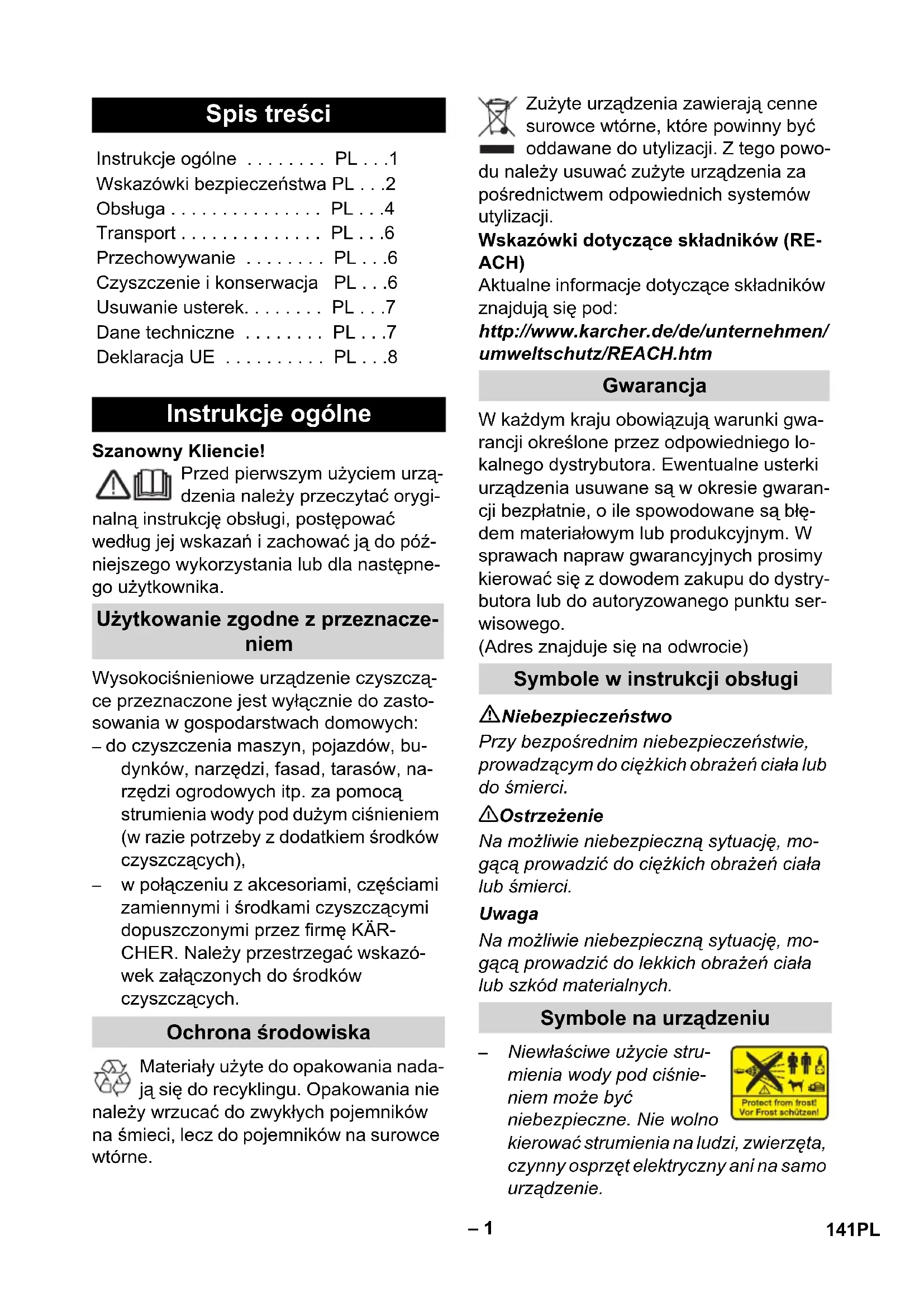 - PL Instrukcje ogólne Użytkowanie zgodne z przeznacze- niem Ochrona środowiska Gwarancja Symbole w instrukcji obsługi Symbole na urządzeniu 141PL– 2 p. 8