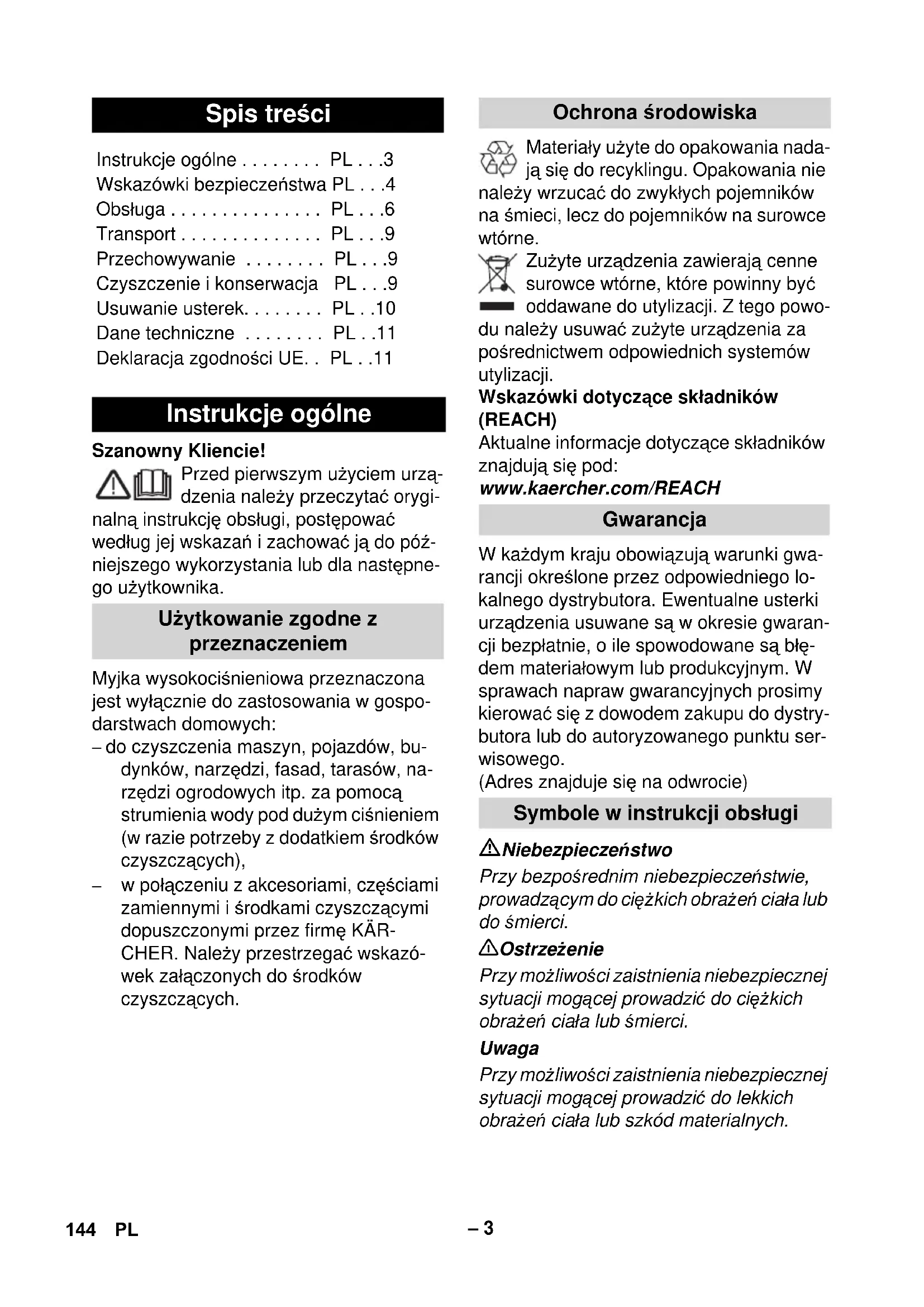 - dB(A) 95 ES-izjava o skladnosti Proizvod: visokotlačni čistilec Tip: 1.601-xxx Zadevne ES-direktive: 2006/42/ES (+2009/127/ES) 2004/108/ES 2000/14/ES Uporabljene usklajene norme: EN 55014–1: 2006 + A1: 2009 EN 55014–2: 1997 + A2: 2008 EN 60335–1 EN 60335–2–79 EN 61000–3–2: 2006 + A2: 2009 EN 61000–3–3: 2008 EN 62233: 2008 Postopek ocenjevanja skladnosti: 2000/14/ES: Priloga V Raven zvočne moči dB(A) Izmerjeno: 93 Zajamčeno: 95 CEO Head of Approbation 143SL– 3 Szanowny Kliencie! Przed pierwszym użyciem urzą- dzenia należy przeczytać orygi- nalną instrukcję obsługi, postępować według jej wskazań i zachować ją do póź- niejszego wykorzystania lub dla następne- go użytkownika. Myjka wysokociśnieniowa przeznaczona jest wyłącznie do zastosowania w gospo- darstwach domowych: – do czyszczenia maszyn, pojazdów, bu- dynków, narzędzi, fasad, tarasów, na- rzędzi ogrodowych itp. za pomocą strumienia wody pod dużym ciśnieniem (w razie potrzeby z dodatkiem środków czyszczących), – w połączeniu z akcesoriami, częściami zamiennymi i środkami czyszczącymi dopuszczonymi przez firmę KÄR- CHER. Należy przestrzegać wskazó- wek załączonych do środków czyszczących. Materiały użyte do opakowania nada- ją się do recyklingu. Opakowania nie należy wrzucać do zwykłych pojemników na śmieci, lecz do pojemników na surowce wtórne. Zużyte urządzenia zawierają cenne surowce wtórne, które powinny być oddawane do utylizacji. Z tego powo- du należy usuwać zużyte urządzenia za pośrednictwem odpowiednich systemów utylizacji. Wskazówki dotyczące składników (REACH) Aktualne informacje dotyczące składników znajdują się pod: www.kaercher.com/REACH W każdym kraju obowiązują warunki gwa- rancji określone przez odpowiedniego lo- kalnego dystrybutora. Ewentualne usterki urządzenia usuwane są w okresie gwaran- cji bezpłatnie, o ile spowodowane są błę- dem materiałowym lub produkcyjnym. W sprawach napraw gwarancyjnych prosimy kierować się z dowodem zakupu do dystry- butora lub do autoryzowanego punktu ser- wisowego. (Adres znajduje się na odwrocie) Niebezpieczeństwo Przy bezpośrednim niebezpieczeństwie, prowadzącym do ciężkich obrażeń ciała lub do śmierci. 몇 Ostrzeżenie Przy możliwości zaistnienia niebezpiecznej sytuacji mogącej prowadzić do ciężkich obrażeń ciała lub śmierci. Uwaga Przy możliwości zaistnienia niebezpiecznej sytuacji mogącej prowadzić do lekkich obrażeń ciała lub szkód materialnych. Spis treści Instrukcje ogólne