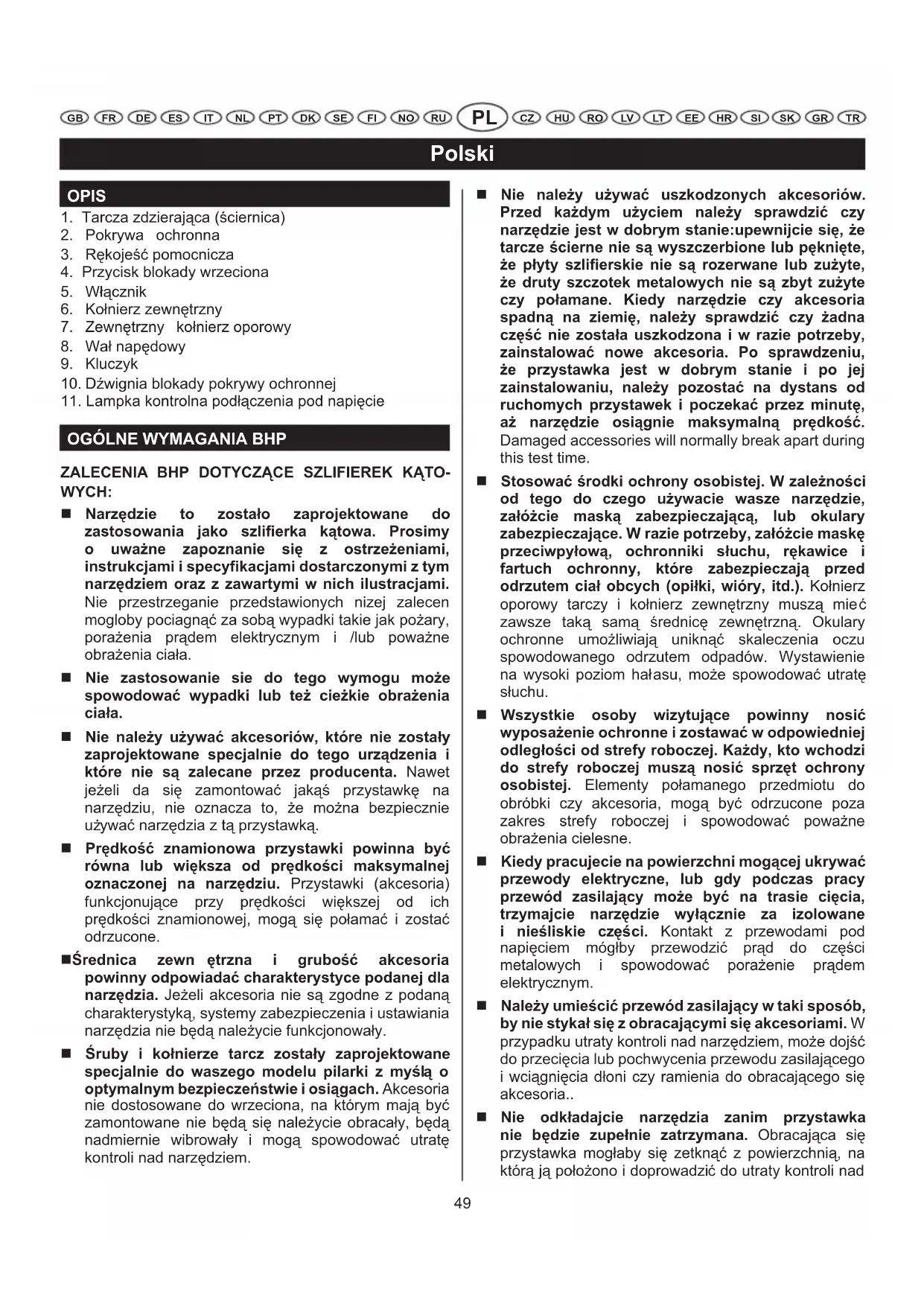 ZALECENIA BHP DOTYCZĄCE SZLIFIEREK KĄTO- WYCH: Narzdzie to zostao zaprojektowane do zastosowania jako szlifierka ktowa. Prosimy o uwane zapoznanie si z ostrzeeniami, instrukcjami i specyfikacjami dostarczonymi z tym narzdziem oraz z zawartymi w nich ilustracjami. Nie przestrzeganie przedstawionych nizej zalecen mogloby pociagn%? za sob% wypadki takie jak po+ary, pora+enia pr%dem elektrycznym i /lub powa+ne obra+enia ciaa. Nie zastosowanie sie do tego wymogu moe spowodowa wypadki lub te ciekie obraenia ciaa. Nie naley uywa akcesoriów, które nie zostay zaprojektowane specjalnie do tego urzdzenia i które nie s zalecane przez producenta. Nawet je+eli da si@ zamontowa? jak% przystawk@ na narz@dziu, nie oznacza to, +e mo+na bezpiecznie
