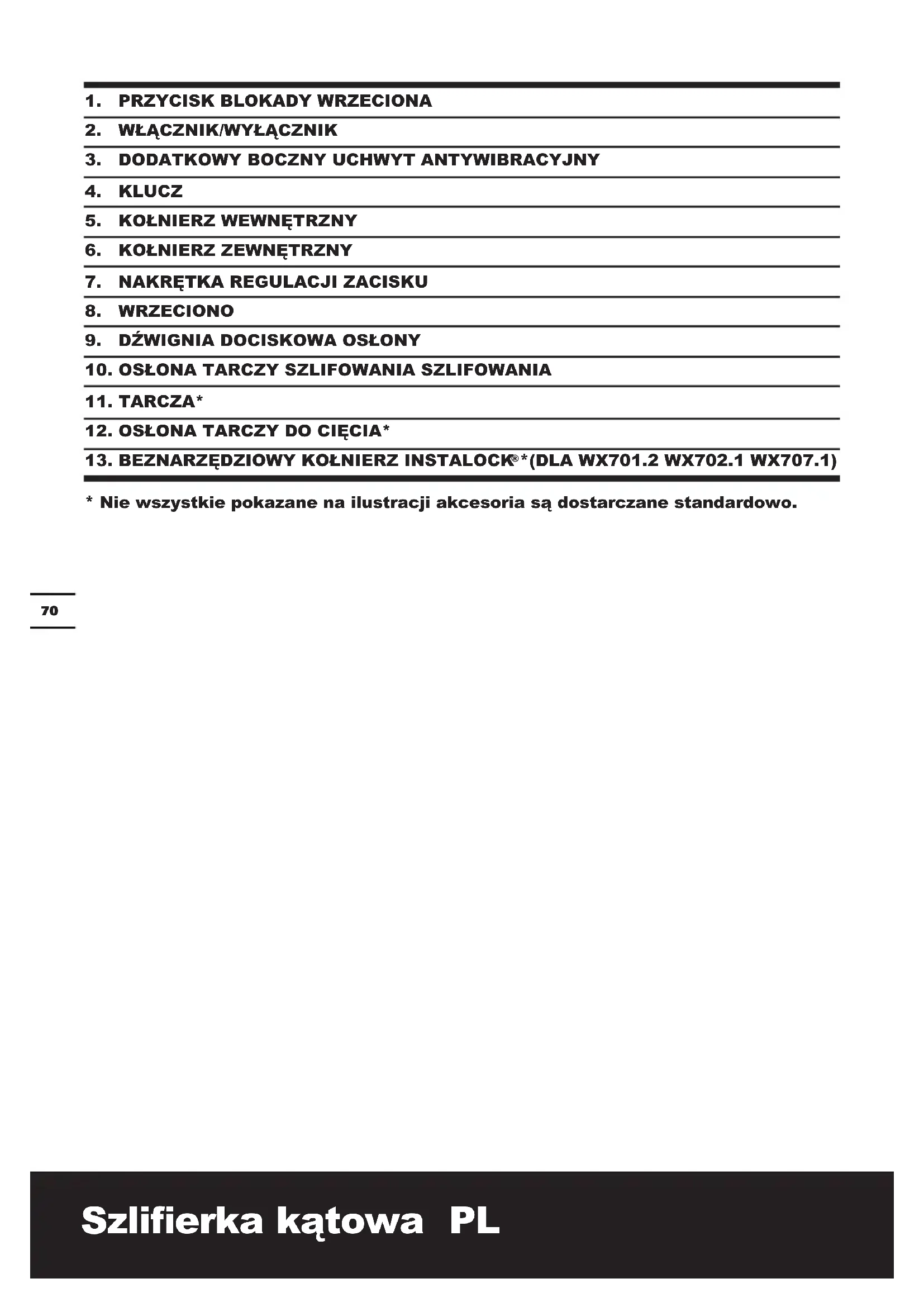 (WX701.2 WX702.1 WX707.1) 1 Zaleca się zakup wszystkich akcesoriów w sklepie, gdzie zakupiono narzędzie. Używać dobrej jakości akcesoriów oznaczonych dobrze znanymi markami. Więcej szczegółów można znaleźć w dodatkowym opakowaniu. Personel sklepu może również udzielić pomocy i porad.73 Szlierka kątowa PL INSTRUKCJE