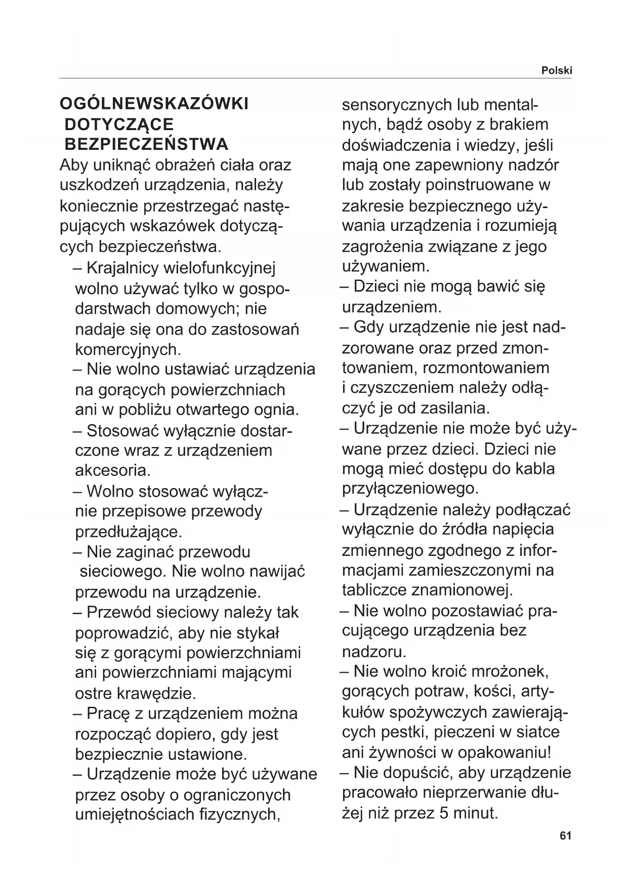 DOTYCZĄCE BEZPIECZEŃSTWA Aby uniknąć obrażeń ciała oraz uszkodzeń urządzenia, należy koniecznie przestrzegać nastę- pujących wskazówek dotyczą- cych bezpieczeństwa. – Krajalnicy wielofunkcyjnej wolno używać tylko w gospo