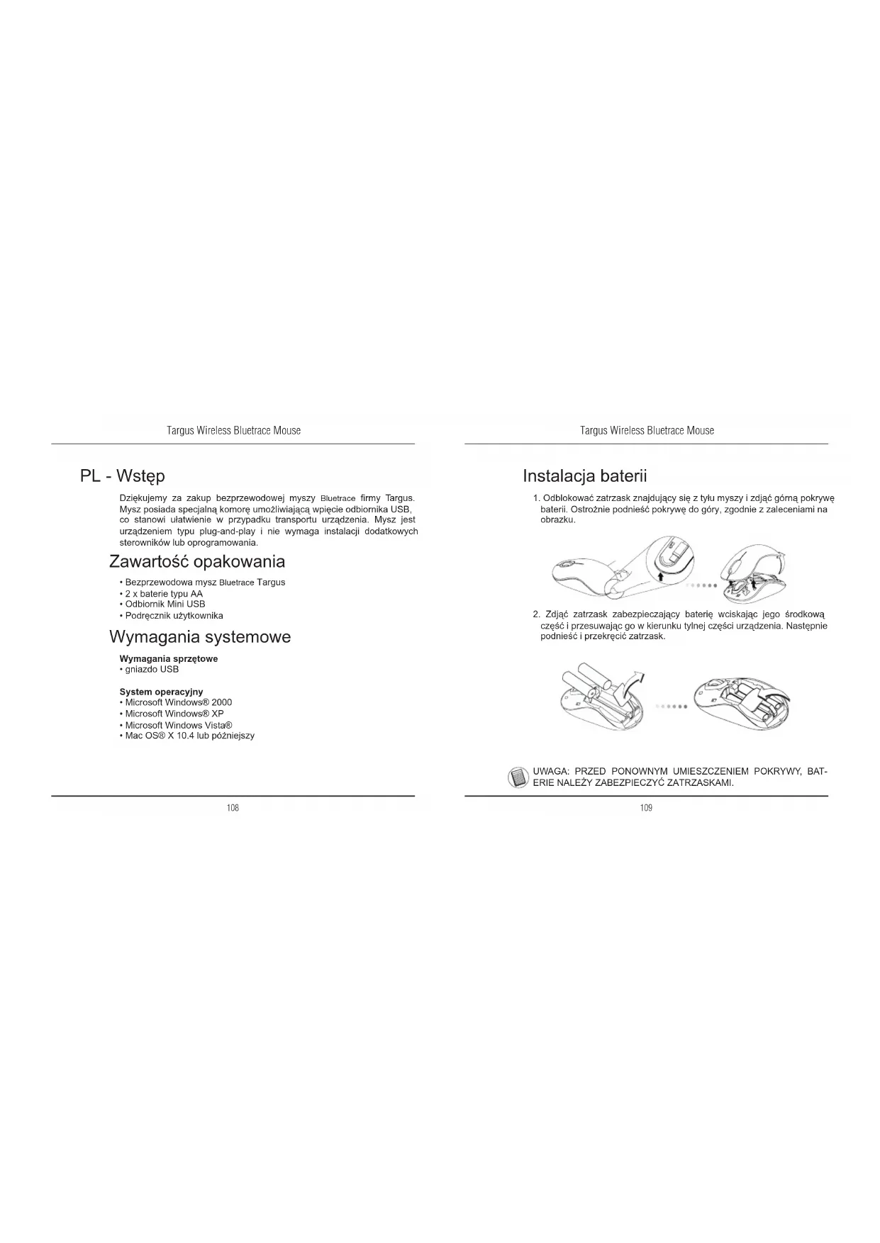 PL - Wstęp Dziękujemy za zakup bezprzewodowej myszy Bluetrace rmy Targus. Mysz posiada specjalną komorę umożliwiającą wpięcie odbiornika USB, co stanowi ułatwienie w przypadku transportu urządzenia. Mysz jest urządzeniem typu plug-and-play i nie wymaga instalacji dodatkowych sterowników lub oprogramowania. Wymagania systemowe Wymagania sprzętowe