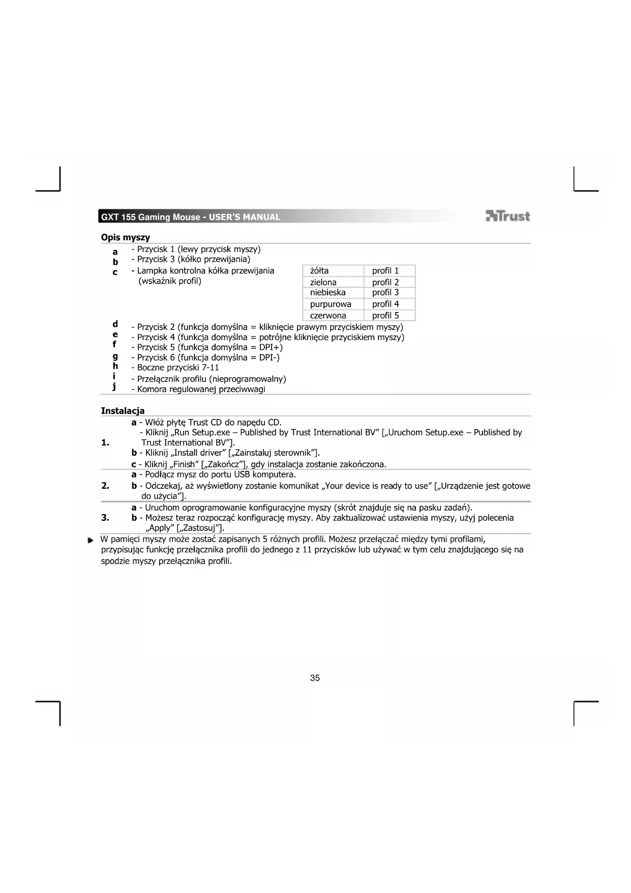a - Uruchom oprogramowanie konfiguracyjne myszy (skrót znajduje się na pasku zadań). b - Możesz teraz rozpocząć konfigurację myszy. Aby zaktualizować ustawienia myszy, użyj polecenia „Apply” [„Zastosuj”]. W pamięci myszy może zostać zapisanych 5 różnych profili. Możesz przełączać między tymi profilami, przypisując funkcję przełącznika profili do jednego z 11 przycisków lub używać w tym celu znajdującego się na spodzie myszy przełącznika profili.GXT 155 Gaming Mouse - USER’S MANUAL