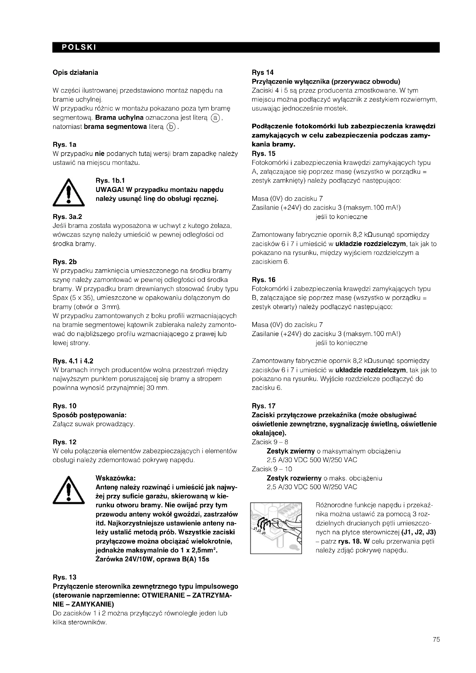 b . Rys. 1a W przypadku nie podanych tutaj wersji bram zapadk´ nale˝y ustawiç na miejscu monta˝u. Rys. 1b.1 UWAGA! W przypadku monta˝u nap´du nale˝y usunàç lin´ do obs∏ugi r´cznej. Rys. 3a.2 JeÊli brama zosta∏a wyposa˝ona w uchwyt z kutego ˝elaza, wówczas szyn´ nale˝y umieÊciç w pewnej odleg∏oÊci od Êrodka bramy. Rys. 2b W przypadku zamkni´cia umieszczonego na Êrodku bramy szyn´ nale˝y zamontowaç w pewnej odleg∏oÊci od Êrodka bramy. W przypadku bram drewnianych stosowaç Êruby typu Spax (5 x 35), umieszczone w opakowaniu do∏àczonym do bramy (otwór ø 3 mm). W przypadku zamontowanych z boku profili wzmacniajàcych na bramie segmentowej kàtownik zabieraka nale˝y zamonto- waç do najbli˝szego profilu wzmacniajàcego z prawej lub lewej strony. Rys. 4.1 i 4.2 W bramach innych producentów wolna przestrzeƒ mi´dzy najwy˝szym punktem poruszajàcej si´ bramy a stropem powinna wynosiç przynajmniej 30 mm. Rys. 10 Sposób post´powania: Za∏àcz suwak prowadzàcy. Rys. 12 W celu po∏àczenia elementów zabezpieczajàcych i elementów obs∏ugi nale˝y zdemontowaç pokryw´ nap´du. Wskazówka: Anten´ nale˝y rozwinàç i umieÊciç jak najwy- ˝ej przy suficie gara˝u, skierowanà w kie- runku otworu bramy. Nie owijaç przy tym przewodu anteny wokó∏ gwoêdzi, zastrza∏ów itd. Najkorzystniejsze ustawienie anteny na- le˝y ustaliç metodà prób. Wszystkie zaciski przy∏àczowe mo˝na obcià˝aç wielokrotnie, jednak˝e maksymalnie do 1 x 2,5mm