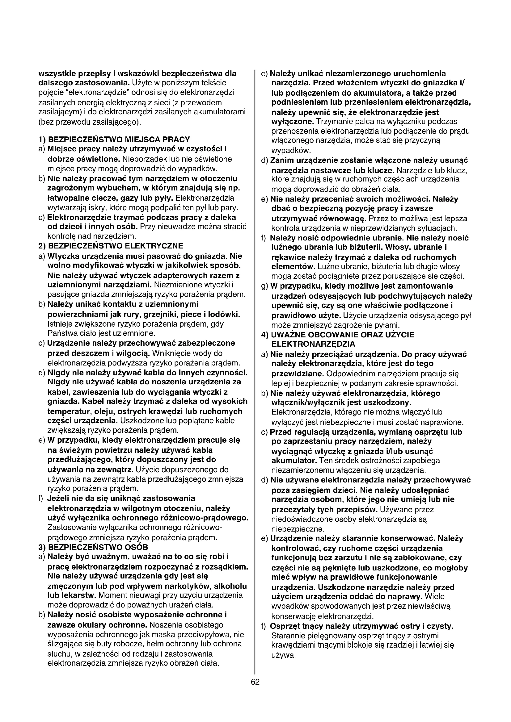 UWAGA! Należy przeczytać wszystkie wskazówki i przepisy. Błędy w przestrzeganiu poniższych wskazówek mogą spowodować porażenie prądem, pożar i/lub ciężkie obrażenia ciała. Należy starannie przechowywać62 wszystkie przepisy i wskazówki bezpieczeństwa dla dalszego zastosowania. Użyte w poniższym tekście pojęcie “elektronarzędzie” odnosi się do elektronarzędzi zasilanych energią elektryczną z sieci (z przewodem zasilającym) i do elektronarzędzi zasilanych akumulatorami (bez przewodu zasilającego).